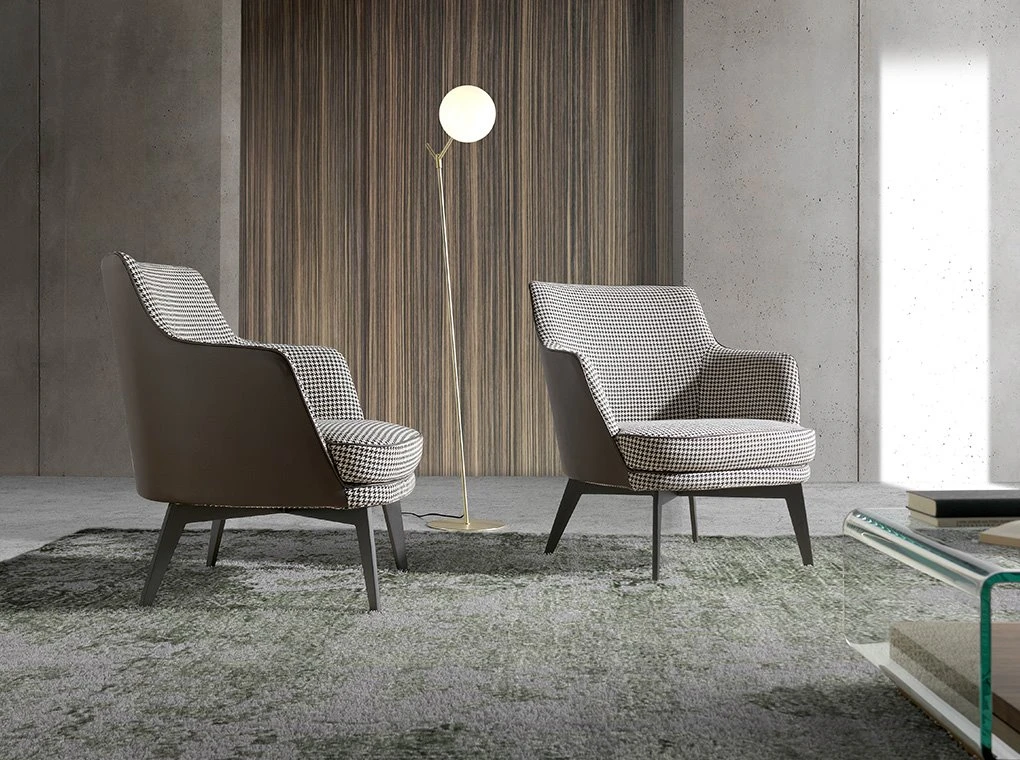 Sillón tapizado tela pata de gallo modelo 5011 Angel Cerdá S.L. Sillón de diseño moderno con una original combinación de tapizados en tela con estampado pata de gallo y ribetes negros, y trasera tapizada en polipiel marrón oscuro. Un sillón de tendencia perfecto para tu zona de descanso y relax, con respaldo y asiento relleno de espuma de poliuretano de 25kg/m3 de densidad. Su estructura de patas en acero pintado en epoxi color negro, aportará ese toque de vanguardia y elegancia que buscas para tu hogar. La combinación perfecta entre diseño y confort. • ESTILO: Este sillón con reposabrazos tapizado en tela con estampado en pata de gallo, aportará el toque sofisticado y elegante que buscas para tu hogar, fiel a las últimas tendencias en decoración. • MULTIESTANCIA: Versátil y funcional, su diseño permite que encaje en cualquier tipo de salón, zona de lectura o dormitorio, convirtiéndose en el gran protagonista de la sala. • CALIDAD: Todos nuestros sillones están fabricados con materiales de la más alta calidad, siendo garantía de mobiliario duradero y funcional. • DECORACIÓN: Gracias a su original diseño, así como a la combinación de tapizados con el acabado de acero negro de sus patas, conseguirás el toque diferente y personal que buscas para tu sala de estar. • CONFORT: El tamaño de su asiento y su relleno en espuma de poliuretano de 25kg/m3, te permitirán contar con el máximo confort, sin dejar de lado la más alta tendencia.