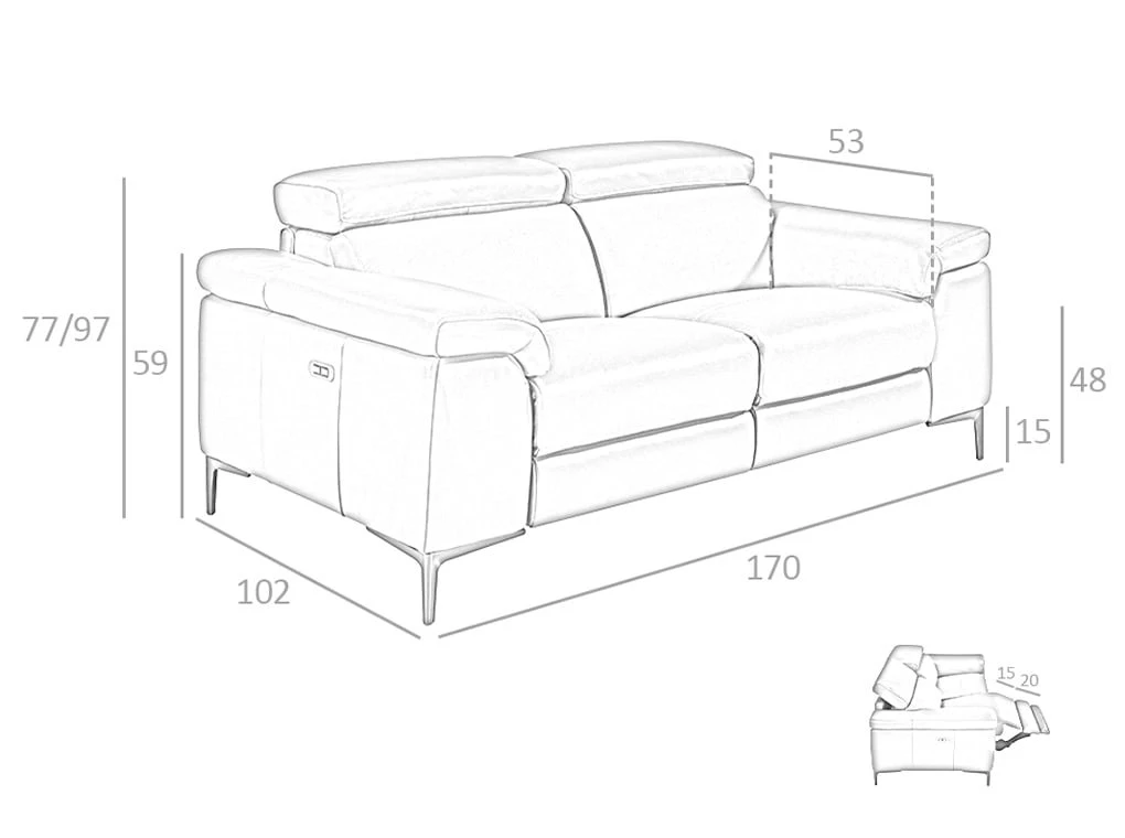 Sofá 2 plazas piel vacuno mecanismos relax modelo 6121 Angel Cerdá S.L.Sofá 2 plazas de diseño moderno tapizado en piel vacuno de 1mm de espesor color gris oscuro con mecanismos eléctricos de relax y reposacabezas independientes regulables. Un sofá de estilo minimalista y único, con una robusta estructura interna de madera de pino natural y patas de acero inoxidable oscurecido que le otorga ese toque de tendencia y elegancia que busca para su salón. Sus asientos con mecanismo eléctrico de relax, le aportan ese extra de comodidad que necesita para disfrutar de su momento de tranquilidad. La combinación perfecta entre diseño, elegancia y confort.ESTILO: Este sofá 2 plazas tapizado en piel de origen vacuno de la más alta calidad aportará el toque original y elegante que busca para su hogar, fiel a las últimas tendencias en decoración.• MULTIESTANCIA: Versátil y funcional, su elegante y sencillo diseño permite que encaje en cualquier tipo de salón, convirtiéndose en el gran protagonista de la sala.• CALIDAD: Todos nuestros sofás están fabricados con materiales de la más alta calidad, siendo garantía de mobiliario duradero y funcional.• DECORACIÓN: Gracias a su elegante diseño moderno, así como a la combinación de la piel con sus patas en acero inoxidable oscurecido, conseguirá el toque de vanguardia y sofisticación que busca para su sala de estar, a la vez que la mayor comodidad.• CONFORT: El tamaño de sus asientos y su relleno en espuma de 20kg/m3, así como sus reposacabezas independientes regulables y asientos con mecanismo eléctrico de relax, le permitirá contar con el máximo confort, sin dejar de lado la más alta tendencia.