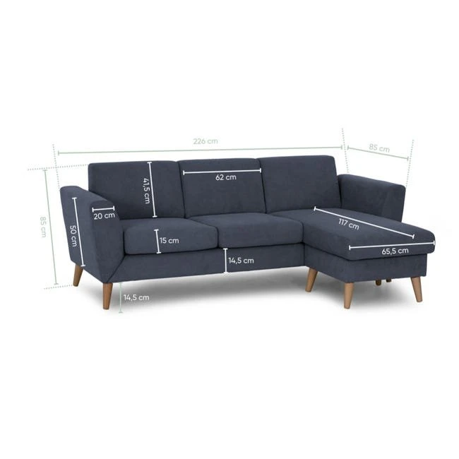 El sofá ANGEL es un icono del diseño de aspecto clásico y vintage, con brazos y pies inclinados. También cuenta con una chaise longue reversible, lo que lo hace versátil para cualquier espacio o combinación decorativa. Su sencilla cubierta combinada con patas de madera inclinadas crea un elegante contraste que lo hace destacar entre otros muebles.- Versátil: ¡un clásico nunca falla! El diseño del sofá Angel encaja perfectamente en cualquier tipo de decoración, está disponible en 4 colores diferentes y su chaise longue reversible permite adaptar una esquina izquierda o derecha en función del marco del espacio.- Materiales de calidad: La selección de materiales hace del Angel un sofá robusto capaz de mantenerse en buen estado durante mucho tiempo. Espuma de 28 kg en el asiento; muelle Nozag para una suspensión eficaz; cojines de apoyo de fibra de poliéster 100 %; estructura de pino, contrachapado y aglomerado; patas de madera; tejido revestido de poliéster 100 %;- Diseño y acabado: Los brazos y patas inclinados de Angel proporcionan un aspecto distintivo, la combinación del acabado liso de la tela y las patas de madera destacan en cualquier espacio en el que encaje.- Comodidad de asiento: La construcción del asiento es ideal para los consumidores que prefieren una comodidad de asiento más suave, pero con un apoyo garantizado;- Comodidad del respaldo: El diseño ajustado del respaldo crea un aspecto uniforme y siempre ordenado.- Montaje: El sofá angel está construido para tener un montaje extremadamente sencillo e intuitivo, además de un manual de montaje ilustrado para ayudarle.