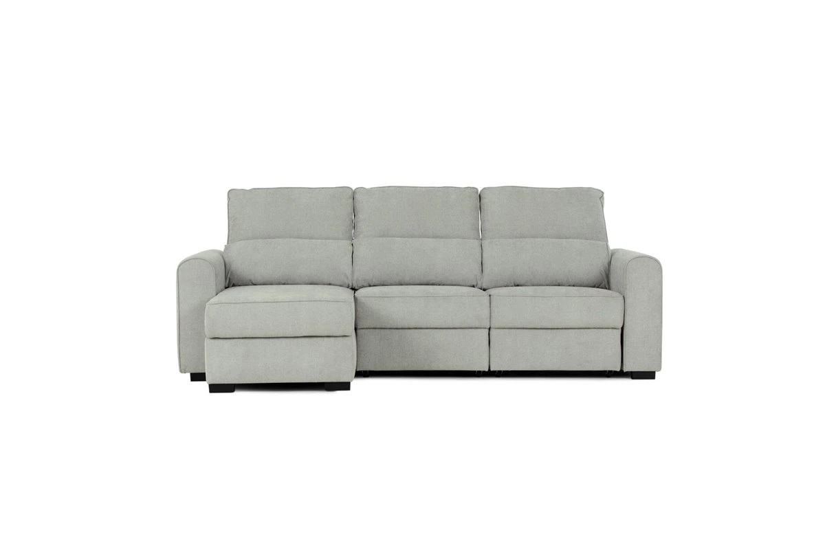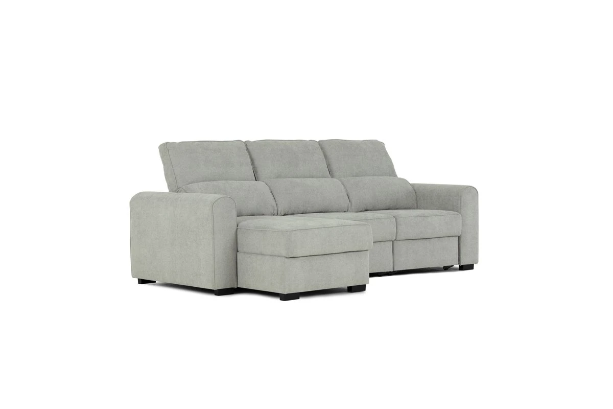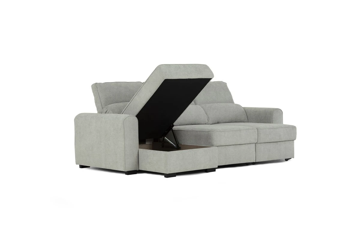 CONNOR Chaise Longue con Cama. Tela. Color gris claro. Estructura de Pino y aglomerado.Convertible en cama de 200 x 100 cm.Reversible. Respaldos y asientos deslizantes. Con arcón. Suspensión: Zig-Zag. Densidad de espuma en asiento: 28kg/m3. Medidas: 242,5an x 96al x 146,5fon cm.