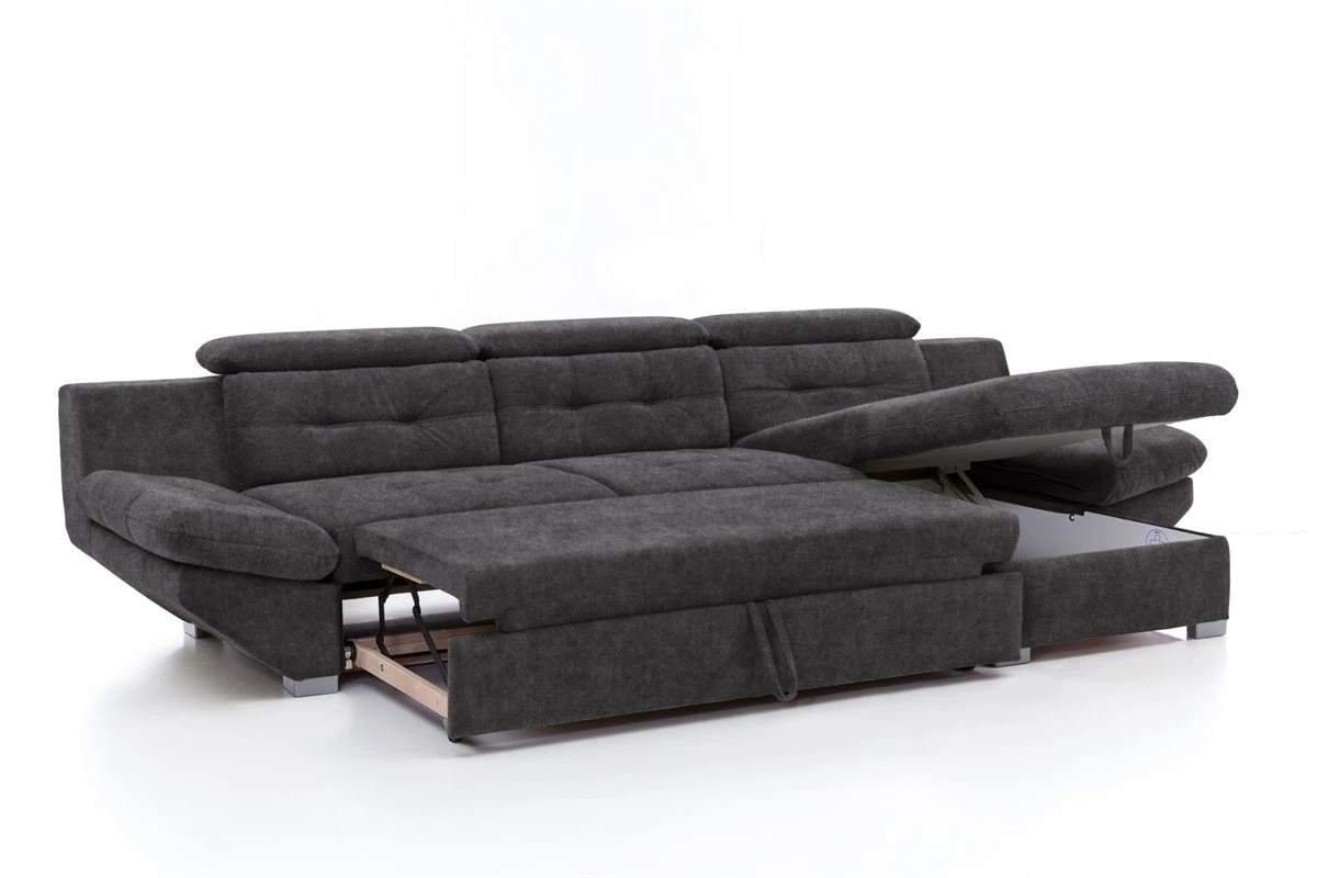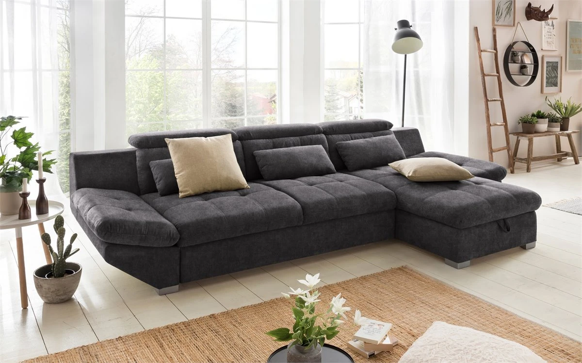 El sofá Chaise Longue ETERNITY es la solución perfecta para tu hogar. Un gran sofá con múltiples extras. Con 3 cojines decorativos, brazo ajustable, convertible en cama y arcón de almacenaje