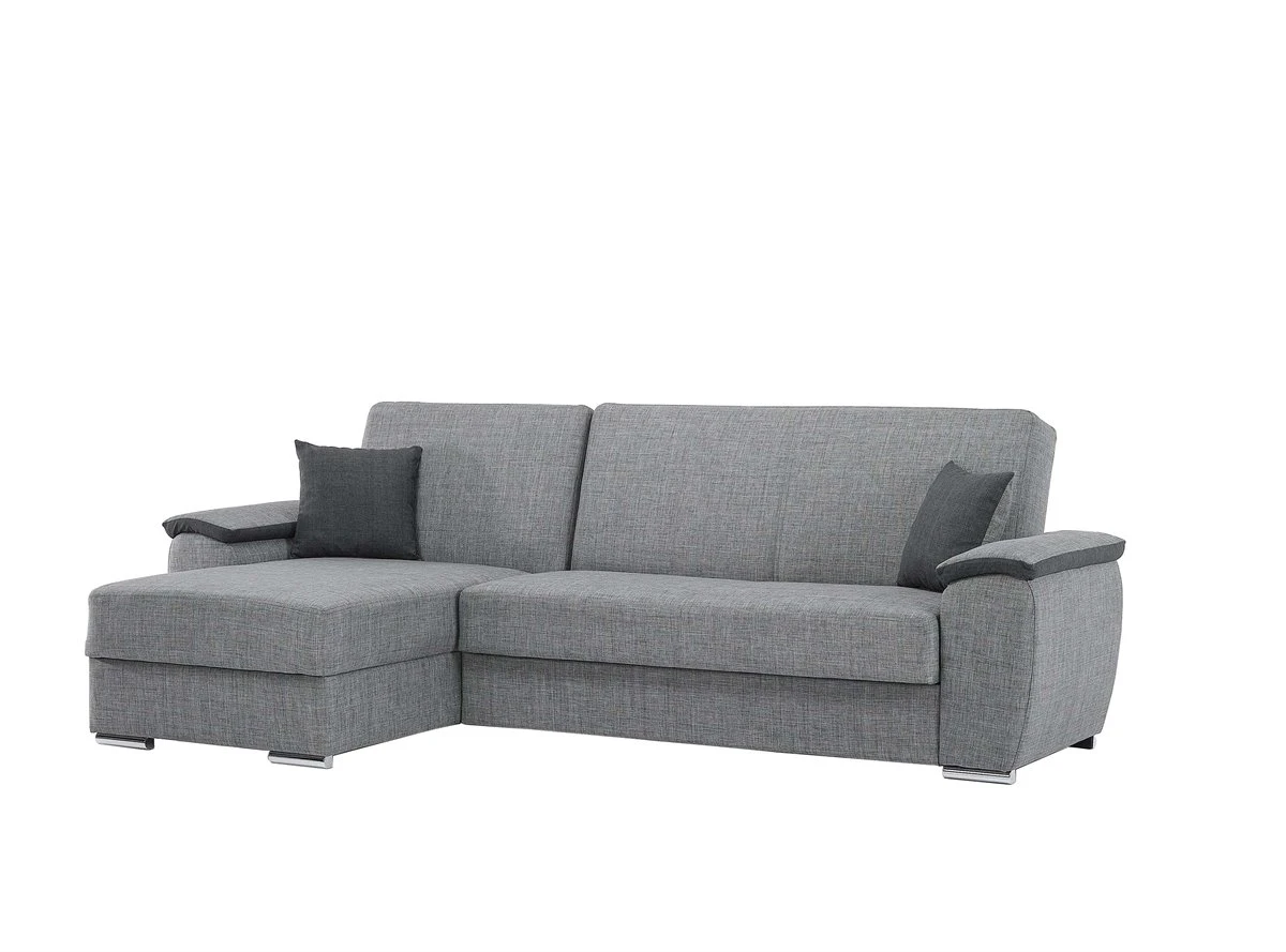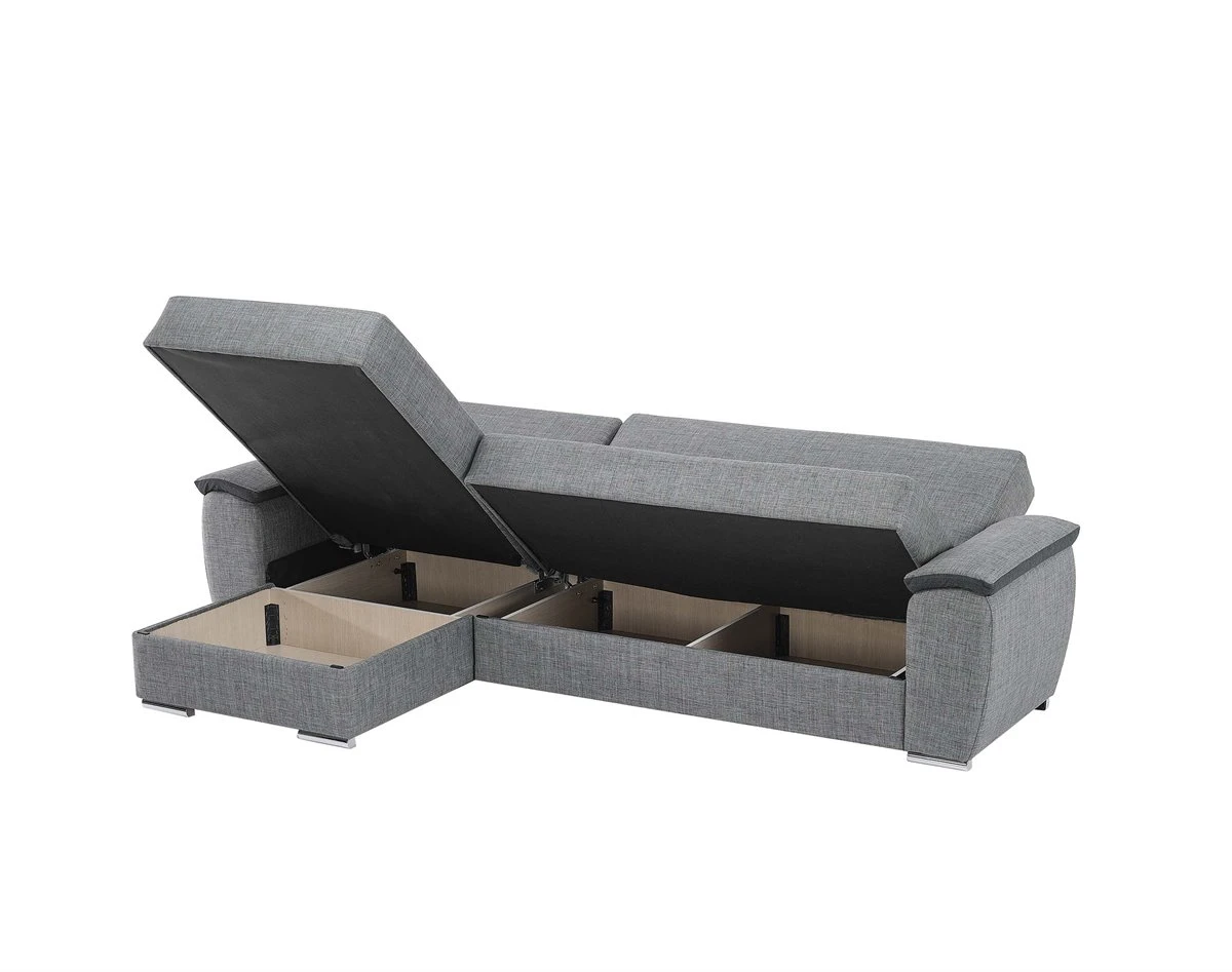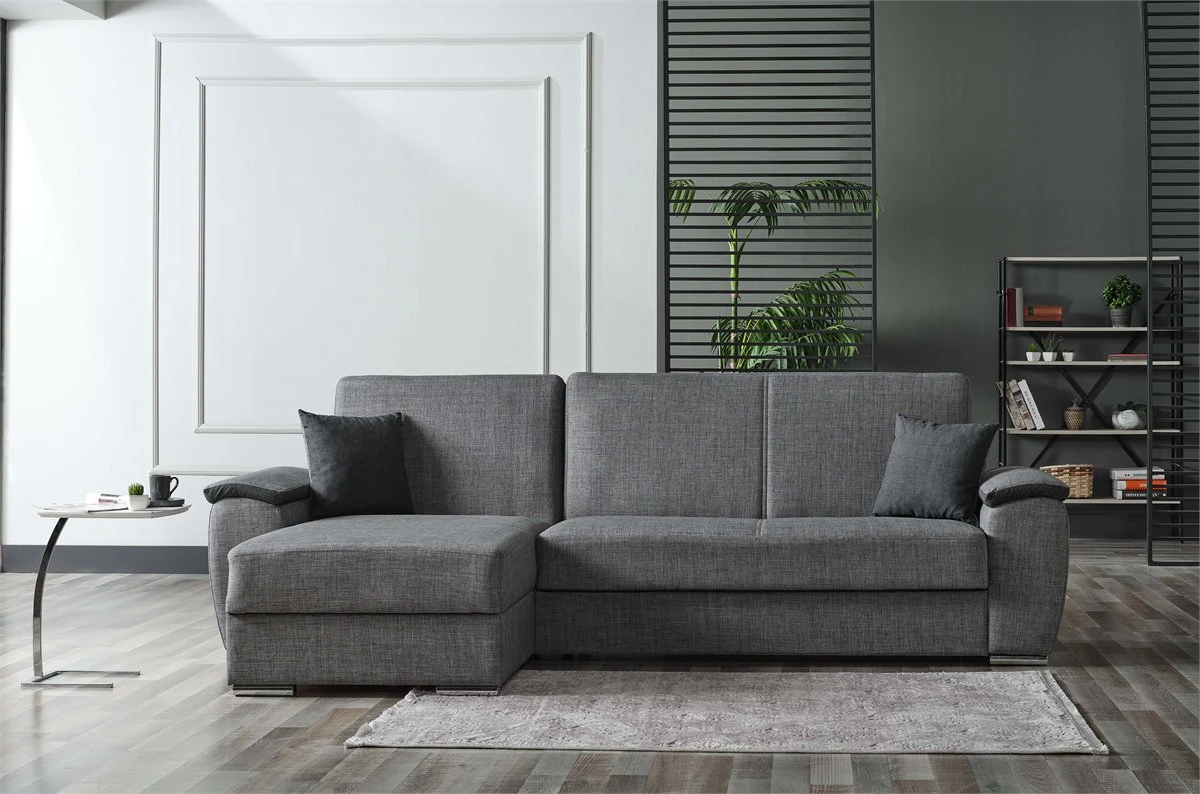 Chaise longue cama GUILIA en color gris oscuro es el sofá que buscas si lo que necesitas es funcionalidad y comodidad en tu hogar. Los arcones que tiene en su interior son la formula perfecta para ganar espacio de almacenamiento en tu salon. Además, se trata de un sofá versatil gracias al montaje reversible de su chaise longue para ambos lados. Convertible en una cama de 118 x 223 cm. La chaise longue GUILIA en color gris oscuro es versátil y funcional, con una cama reversible y un arcón en su interior para almacenamiento. Una solución ideal para espacios reducidos.