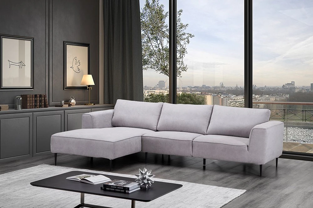 Chaise Longue izquierda AMELIE, tiene una estructura de madera de pino y madera contrachapada, tipo de suspensión muelles de metal + cincha. Densidad de espuma en asientos de 30 kg/m3.