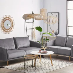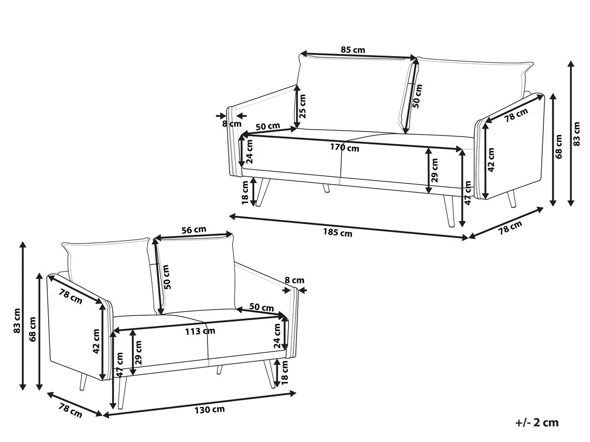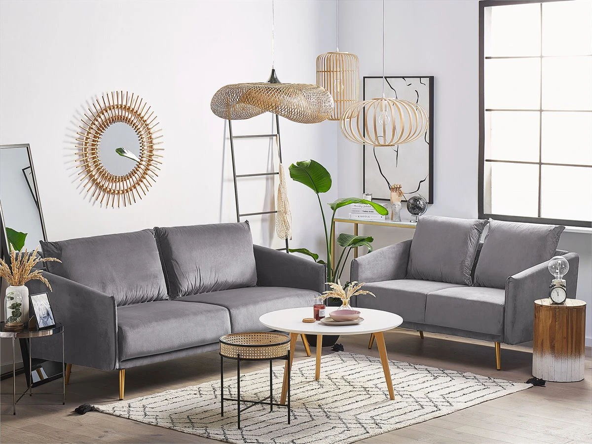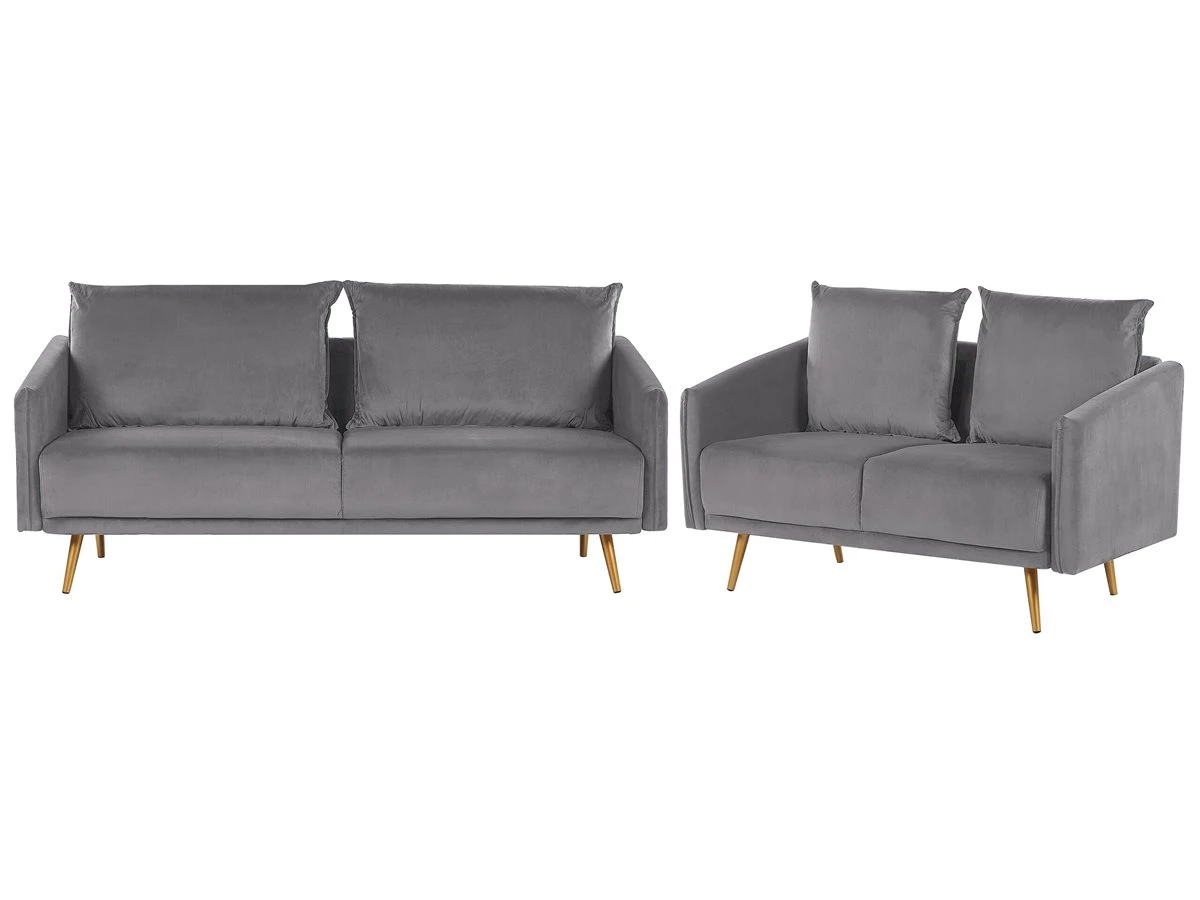 Conjunto de sofás de terciopelo. Añade a tu interior este conjunto de sala de estar de diseño elegante. Está fabricado a partir de tela de terciopelo suave al tacto. El relleno de los cojines de respaldo ofrece el mejor descanso. Las patas de metal combinan bien con cualquier sala de estar de estilo glamuroso, boho o retro. Detalles: Tipo de Producto: Conjunto de sofás Estilo: Glamour Color: Azul Tonalidad: Azul marino Tipo de material: Poliéster aterciopelado Material principal: Terciopelo Material adicional: Metal Material del relleno: Espuma Composición del Material: 100% Poliéster Estilo del apoyabrazo: Estrecho Parte posterior tapizada: Sí Construcción del asiento: Muelles ondulados Densidad de espuma del asiento: 24 kg/m3 Asientos para: 4 – 6 personas Dimensiones: Dimensiones del sofá de 2 plazas: 130x78x83 Dimensiones del sofá de 3 plazas: 185x78x83 Espesor del asiento: 24 cm Altura del asiento: 47 cm Peso: 73 kg Capacidad de peso por persona: 125 kg La oferta incluye: 1 x Sofá de 3 plazas, 1 x Sofá de 2 plazas Ventajas: El grueso acolchado del asiento brinda comodidad, Diseño tradicional con un toque moderno, Ideal para todo tipo de decoración, Cojines extraíbles para un fácil mantenimiento, Patas con tapas antideslizantes de seguridad, Completamente tapizado Información de montaje: Requiere montaje completo. 20-40 min. Información adicional: Ten en cuenta que la tela de terciopelo puede presentar un aspecto distinto según la iluminación a la que esté expuesta: tiende a brillar más a la luz del día y a parecer más tenue con luz artificial en interiores. Debido a la estructura suave de alta densidad, la tonalidad puede verse modificada haciendo pasar la mano en distintas direcciones y ángulos. Para igualar el color y eliminar las arrugas, el material debe limpiarse con la palma de mano abierta en una dirección, con un paño húmedo o una plancha con vapor. Consejos de mantenimiento: Terciopelo: 1.Aspire con un accesorio adecuado 2.Limpiar con champú seco y una esponja húmeda o un limpiador suave. Metal: 1.Para evitar arañazos, no use limpiadores abrasivos 2.Limpie con un limpiador y un paño suave, seque después 3.Para elementos de cobre o cromados, use agente abrillantador.