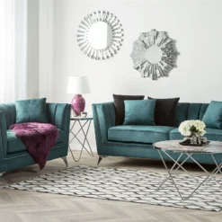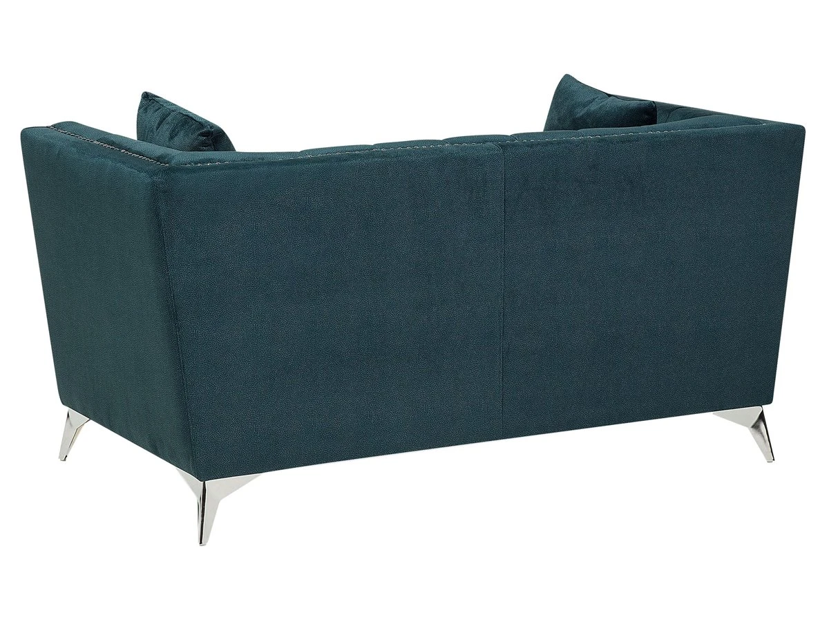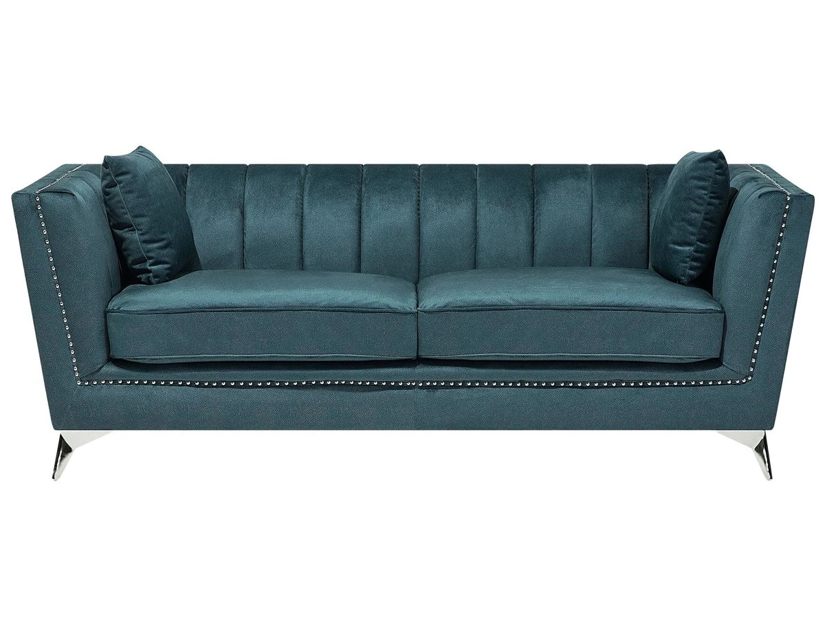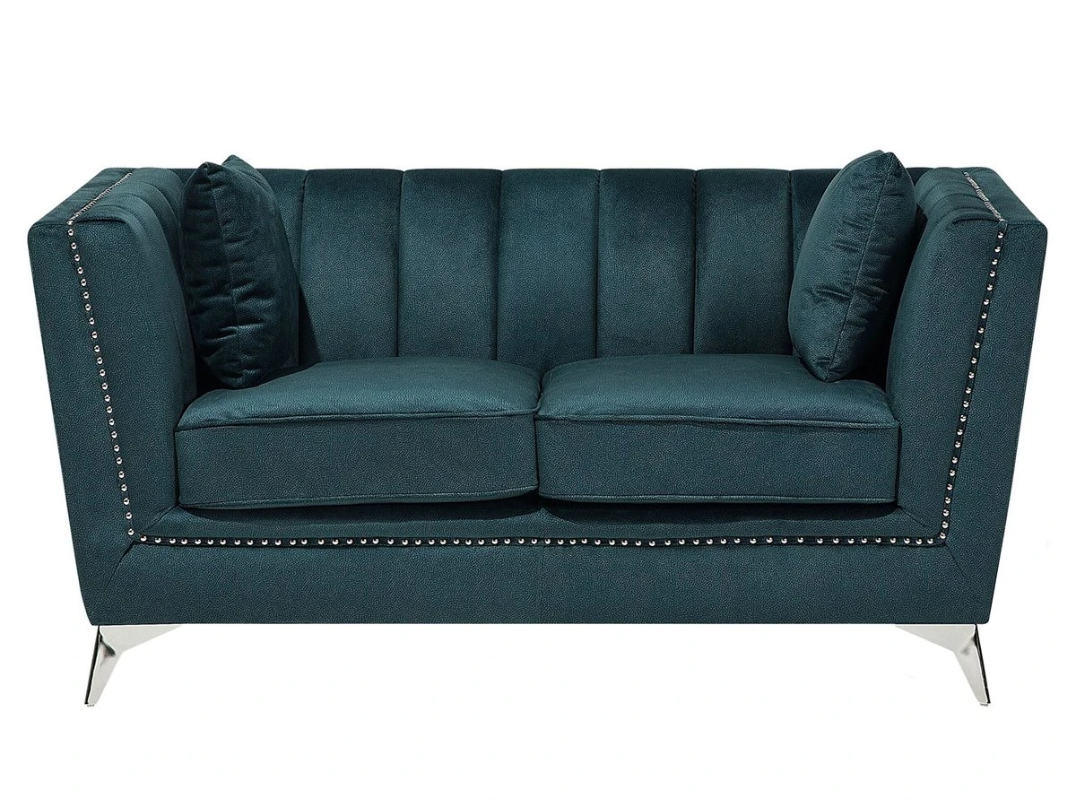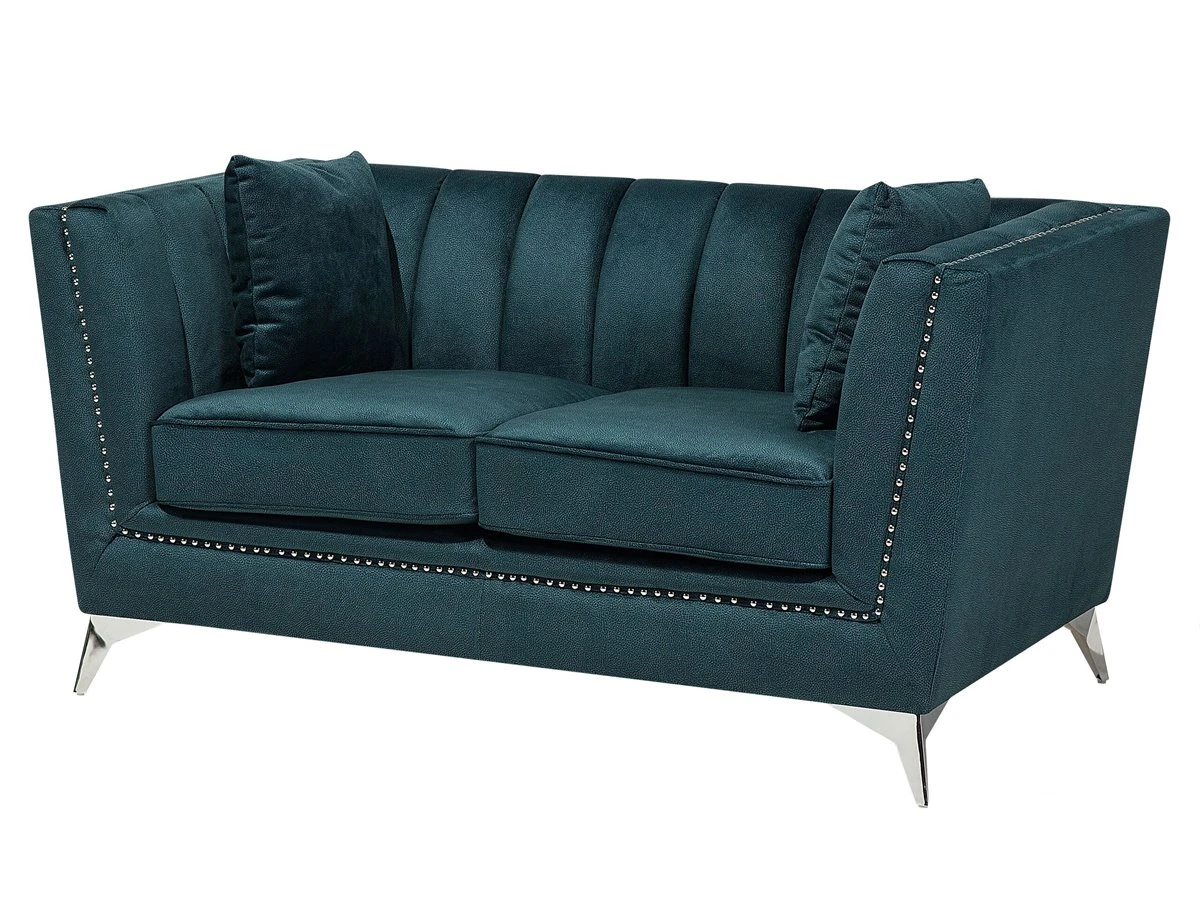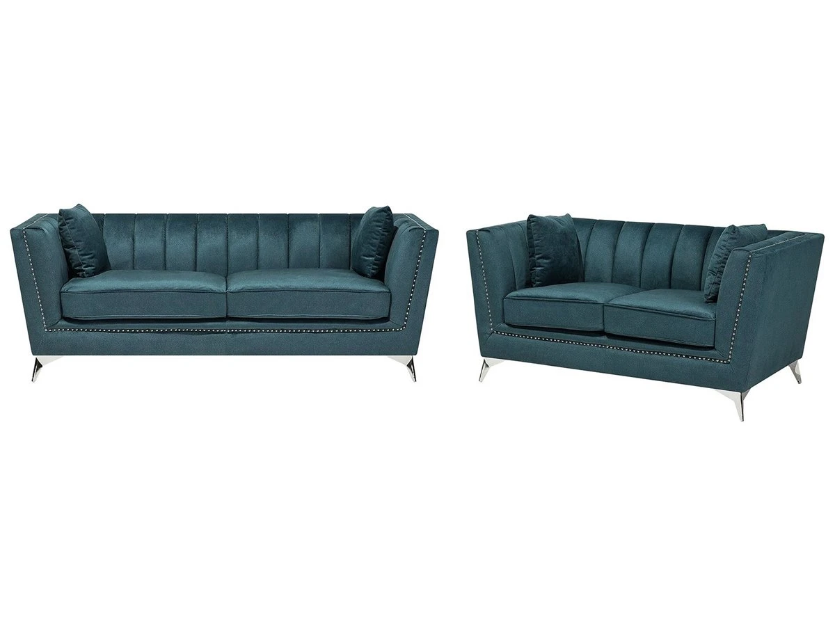 Conjunto de sofás de terciopelo. Añade a tu interior este conjunto de sala de estar de diseño elegante. Está fabricado a partir de terciopelo suave al tacto. El acolchado en el respaldo ofrece la máxima comodidad y aporta un toque de distinción. Las patas de metal garantizan estabilidad. Detalles: Tipo de Producto: Conjunto de sofás Estilo: Glamour Color: Azul Tonalidad: Verde azulado Tipo de material: Poliéster aterciopelado Material principal: Terciopelo Material adicional: Metal Material del relleno: Espuma Composición del Material: 100% Poliéster Estilo del apoyabrazo: Estrecho Parte posterior tapizada: Sí Construcción del asiento: Muelles ondulados Densidad de espuma del asiento: 50 kg/m3 Asientos para: 4 – 6 personas Dimensiones: Dimensiones del sofá de 2 plazas: 160x80x77 Dimensiones del sofá de 3 plazas: 211x80x77 Espesor del asiento: 17 cm Altura del asiento: 48 cm Peso: 93 kg Capacidad de peso por persona: 80 kg La oferta incluye: 1 x Sofá de 3 plazas, 1 x Sofá de 2 plazas, 4 x Cojín Ventajas: Confort del asiento óptimo, Acabado con remaches que enfatizan la forma del mueble, Diseño elegante, Materiales de la más alta calidad, Completamente tapizado Información de montaje: Requiere montaje parcial. 20-40 min. Información adicional: Ten en cuenta que la tela de terciopelo puede presentar un aspecto distinto según la iluminación a la que esté expuesta: tiende a brillar más a la luz del día y a parecer más tenue con luz artificial en interiores. Debido a la estructura suave de alta densidad, la tonalidad puede verse modificada haciendo pasar la mano en distintas direcciones y ángulos. Para igualar el color y eliminar las arrugas, el material debe limpiarse con la palma de mano abierta en una dirección, con un paño húmedo o una plancha con vapor. Consejos de mantenimiento: Poliéster: 1.Aspire con un accesorio adecuado 2.Limpiar con champú seco y una esponja húmeda o un limpiador suave. Metal: 1.Limpie con un limpiador y un paño suave, seque después 2.Para elementos de cobre o cromados, use agente abrillantador 3.Para evitar arañazos, no use limpiadores abrasivos.