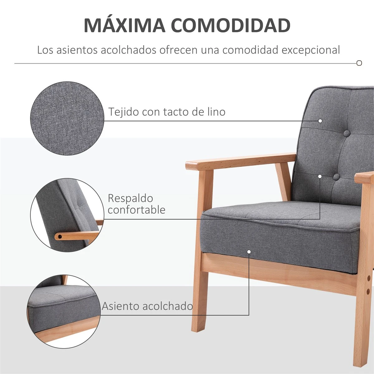 - – AÑADE ELEGANCIA A TU CASA: Añade un toque de elegancia a tu hogar con esta bonita y elegante silla moderna. Con un bonito diseño estampado con botones y una combinación de color madera y gris, esta silla es una adición elegante y atemporal que nunca pasará de moda – MÁXIMO CONFORT: Si buscas una butaca cómoda, esta, con cojín suave y tapizado en tela de lino y respaldo para los brazos, es perfecta para adaptarse al diseño de tu cuerpo, proporcionando el máximo confort – ESTRUCTURA RESISTENTE: Fabricada con una estructura de madera de haya resistente, esta butaca es estable y confiable para un uso prolongado. Puede soportar una carga máxima de hasta 200 kilos de peso – VERSÁTIL: Gracias a su diseño original y único, este sillón es ideal para diferentes ambientes de tu hogar. Puede ser utilizado en la sala de estar para relajarte leyendo un libro o tomando una taza de té, en la oficina, el dormitorio, entre otros – MEDIDAS TOTALES: 70×64,5×74 cm (LxANxAL. Peso máximo soportado: 200 kg. Requiere montaje
