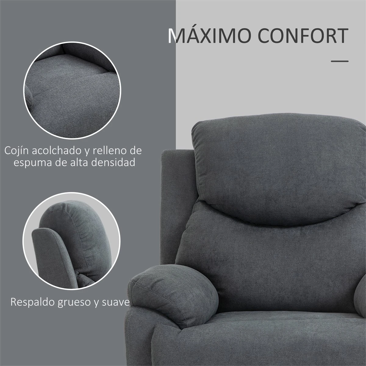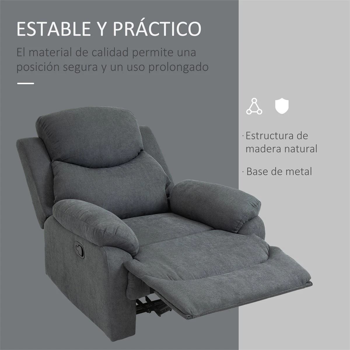 - – BUTACA RECLINABLE: se puede inclinar a un ángulo de 150° de forma manual muy fácilmente. Por su diseño en color gris y líneas clásicas podrás colocarlo en diferentes espacios de la casa, en el despacho o incluso en salas de espera. – REPOSAPIÉS INTEGRADO: perfecto para ahorrar espacio cuando no lo utilizas. Te encantará descansar en él levantando las piernas y así aliviar la presión sanguínea si has estado de pie todo el día, por ejemplo. – REPOSABRAZOS Y RESPALDO ALTOS: un diseño ergonómico perfecto para encontrar un buen soporte en espalda y brazos, lo que te permitirá relajarte charlando, viendo la tele o leyendo, después de un largo día de trabajo. – ACOLCHADO GRUESO: resulta muy cómodo y brinda una muy buena experiencia tanto al sentarse como al recostarse, ideal para descansar cómodamente o para leer. – MEDIDAS: 97x96x105,5 cm (LxANxAL. Soporta un máximo de 150 kg.