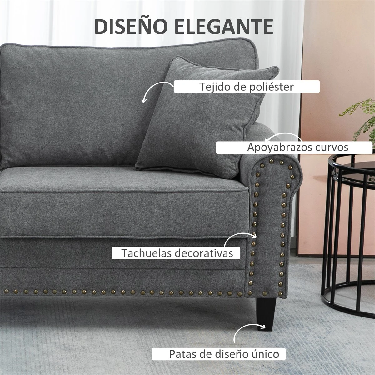 Disfruta de una cómoda sala de estar con este sofá de dos plazas de HOMCOM. Su diseño es ideal para espacios compactos y, aun así, lo suficientemente amplio para relajarse con amigos y familiares. Su suave tejido de poliéster, asiento y cojines de respaldo gruesos ofrecen una comodidad excepcional al sentarse. Y su detalle de tachuelas de oro envejecido y brazos curvos evocan un encanto elegante. Además, cuenta con dos elegantes cojines decorativos que le darán un toque de estilo a tu salón. Características – Sofá de 2 plazas ideal para espacios limitados – Ideal para la sala de estar, la oficina, el estudio, entre otros – Su diseño clásico y atemporal se integrará fácilmente en cualquier entorno – Bellamente acabado con tachuelas de oro envejecido para añadir un toque de elegancia – Los cojines acolchados del respaldo y del asiento junto con los cojines decorativos aportan una gran comodidad – Tejido de poliéster suave y fácil de mantener – Cuenta con 4 patas de madera de caucho que garantizan una mayor estabilidad – Las patas tienen almohadillas de fieltro antideslizantes para mayor adherencia y para evitar que el suelo se raye – Requiere montaje Especificaciones – Color: gris – Material: tejido de poliéster, espuma y madera de caucho – Medidas totales: 196×80,5×89 cm (LxANxAL – Medidas del asiento: 160x47x50 cm (LxANxAL – Grosor del asiento: 17 cm – Medidas del respaldo: 90x21x42 cm (LxANxAL – Medidas del cojín: 80×47 cm (LxAN – Altura de la base elevada: 11,5 cm – Carga máxima: 180 kg – Referencia: 839-499V00GY