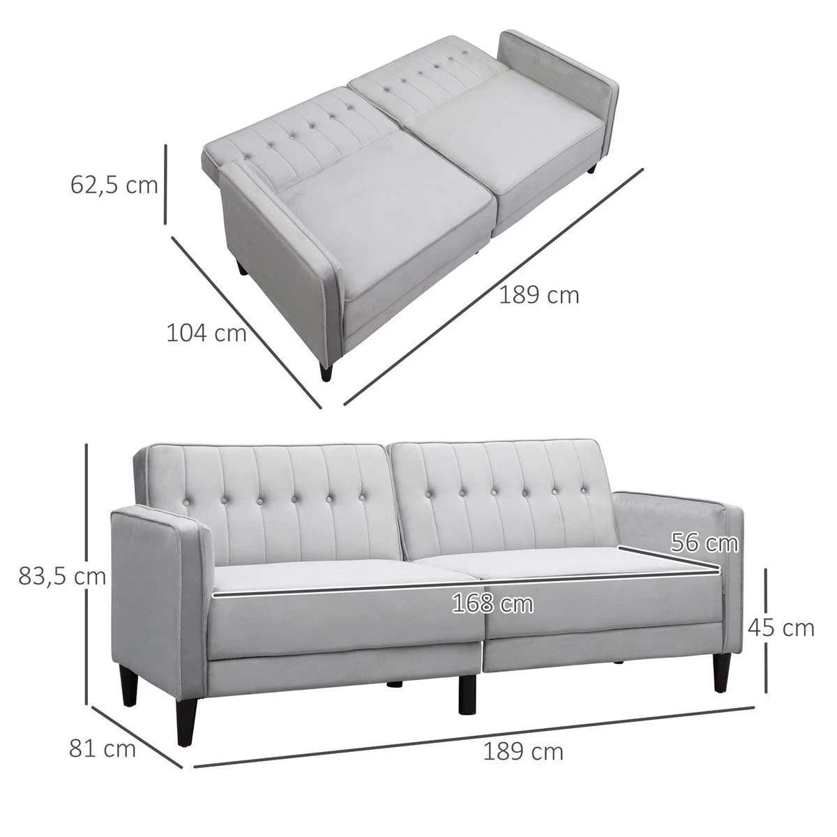 - – SOFÁ CONVERTIBLE EN CAMA: Este sofá se puede transformar rápida y fácilmente en una cama individual de 104 cm de ancho ofreciendo un lugar de descanso para tus invitados o si deseas quedarte una noche a dormir en el salón después de mirar una película – RESPALDOS RECLINABLES: Este sofá moderno cuenta con un respaldo compuesto por 2 partes. Cada una se puede reclinar por separado en 3 posiciones diferentes para que encuentres la postura más cómoda cuando mires la televisión, descanses o tomes una siesta – CÓMODO Y ELEGANTE: El sofá cama cómodo, tapizado en agradable tejido de terciopelo sintético, ofrece una comodidad excepcional, para descansar y relajarte en tu tiempo libre. El resorte curvo con correas elásticas ofrecen un asiento más flexible y cómodo. Con cojín de espuma viscoelástica – MATERIAL RESISTENTE: Las patas de este sofá cama de matrimonio contribuyen a su fortaleza gracias a su dureza y resistencia. Al mantener la base elevada, protege de la humedad y a la vez facilita la limpieza del suelo. El tejido de poliéster con tacto aterciopelado es suave y transpirable – MEDIDAS TOTALES: en posición de sofá 189x81x83,5 cm (LxANxAL y en posición de cama 189x104x62,5 cm (LxANxAL. Peso máximo soportado: 300 kg
