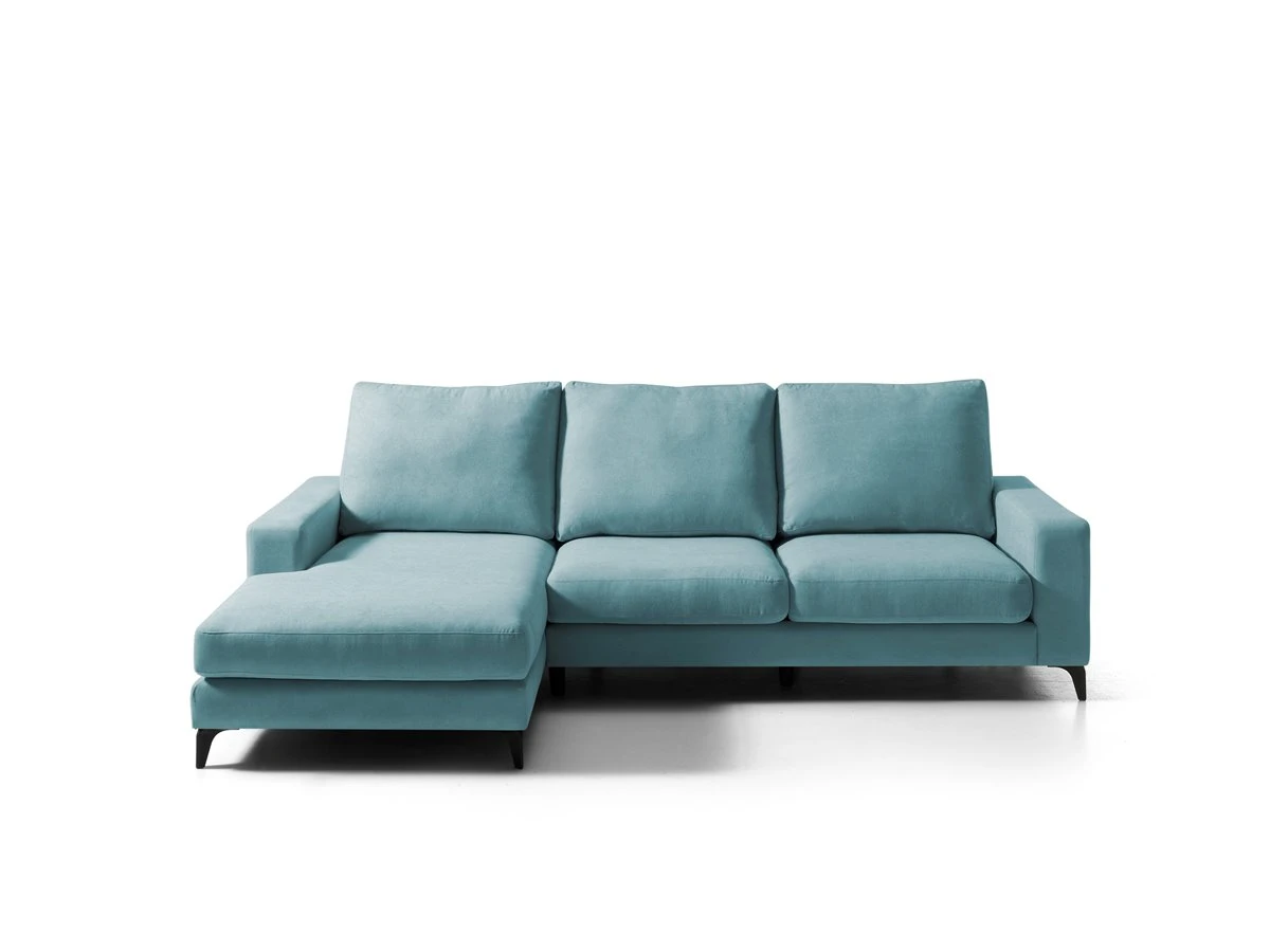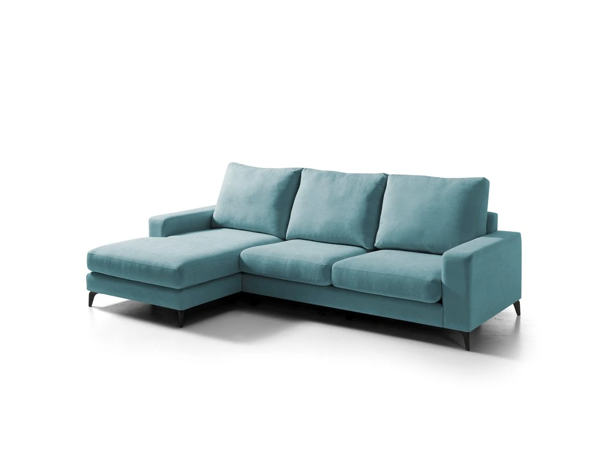 RUBI Chaise Longue Fija Izquierda . Estructura en madera maciza y tablero de partículas. Revestimiento en tela, . Densidad de espuma en asientos de 28 kg/m3. Patas en PVC, color wengue. Almohadas desenfundables. Medidas : 280an x 98al x 100fon cm.