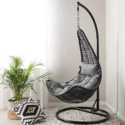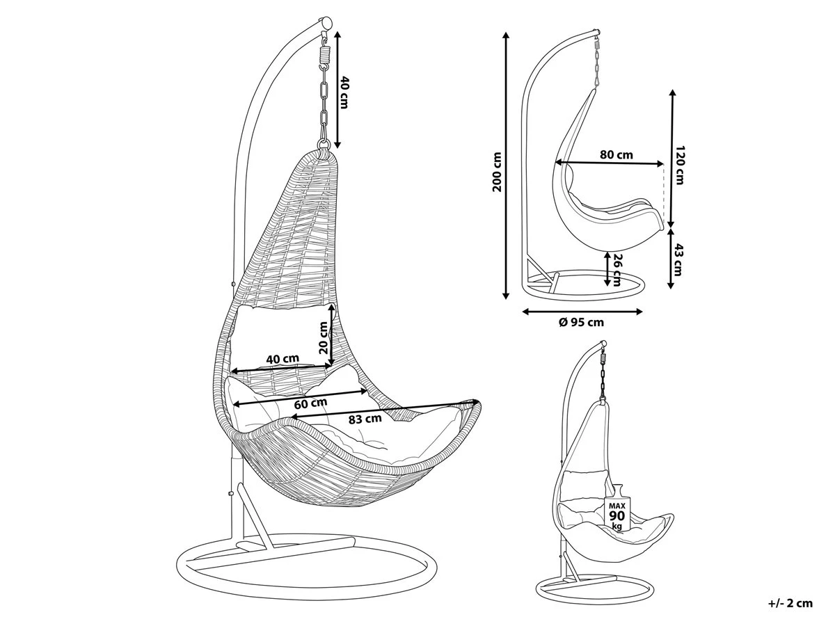 Sillón de forma ovalada. Añade a tu sala de estar o dormitorio esta silla colgante con soporte. Está fabricada a partir de ratán sintético de alta calidad. La forma ovalada y curvilínea ofrece la máxima comodidad. Combina bien con cualquier interior de estilo moderno o boho. Detalles: Tipo de Producto: Silla colgante Estilo: Boho Color: Negro Tipo de material: Ratán sintético Material principal: Ratán sintético Material de las patas: Acero Material del asiento: Mimbre sintético Composición del Material: 100% Poliéster Acabado: Revestimiento en polvo Densidad de espuma del asiento: 30 kg/m3 Dimensiones: Dimensiones de la base: 95×95 Profundidad: 95 cm Espesor del asiento: 13 cm Altura del asiento: 55 cm Ancho: 95 cm Altura: 200 cm Superficie del asiento: 75×75 cm Peso: 26 kg Capacidad de peso: 90 kg La oferta incluye: 1 x Cojín del asiento, 1 x Silla, 1 x Almohada, 1 x Soporte Ventajas: Las tiras ofrecen una fijación segura, Asiento extremadamente cómodo, Para dormitorio o salón, Combina con todo tipo de decoración, Estructura duradera y sólida, Muy fácil de conservar, Resistencia UV 4 (ISO 105-B05 Información de montaje: Requiere montaje parcial. 20-40 min. Información adicional: Ten en cuenta que el producto es sensible a condiciones climáticas adversas, por lo que, cuando no esté en uso, debe ser almacenado en el interior o en un lugar cubierto. Para una mayor estabilidad y seguridad de uso, se recomienda verificar 2 semanas después de la instalación que el montaje del producto ha sido realizado de forma correcta. Revisa, al menos una vez cada 3 meses, que los tornillos estén bien apretados. Texto de resistencia: Los muebles resistentes a los rayos UV muestran una mayor resistencia a la decoloración. Sin embargo, recomendamos que el producto se guarde en el interior cuando no esté en uso. Esto asegurará la máxima durabilidad de los muebles. Resistencia: Rayos UV Consejos de mantenimiento: Acero: 1.Limpiar con detergentes suaves 2.Los muebles de acero y sus elementos no deben exponerse al agua. De lo contrario, existe la posibilidad de que el agua oxidada salga de las tuberías del marco 3.Cuando no estén en uso, los muebles deben guardarse en el interior o bajo una cubierta protectora 4.Para aumentar la durabilidad del artículo, manténgalo seco y recuerde la limpieza regular 5.Cualquier daño a la capa de pintura exterior debe protegerse de la humedad 6.Para garantizar la protección contra la corrosión, evite los limpiadores alcalinos o ácidos. Después de limpiar, secar bien 7.Quite las tapas protectoras con regularidad para que salga todo el líquido, déjelas secar y utilice un spray anticorrosión si es necesario. Ratán sintético: 1.Se recomienda utilizar una funda protectora para la temporada de invierno o, si es posible, para mantener los muebles secos y frescos en el interior 2.Limpiar con detergentes a base de jabón. No utilizar limpiadores químicos corrosivos 3.Los utensilios o accesorios de vidrio pueden sobrecalentar la superficie 4.Para alargar la vida útil del mueble, protéjalo de la exposición directa al sol. Poliéster: 1.Limpiar con champú seco y una esponja húmeda o un limpiador suave 2.Cuando no esté en uso, manténgalo en un lugar limpio y seco para protegerlo de las condiciones atmosféricas 3.Aspire con un accesorio adecuado.