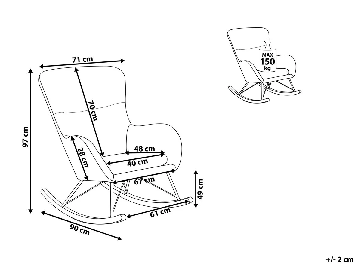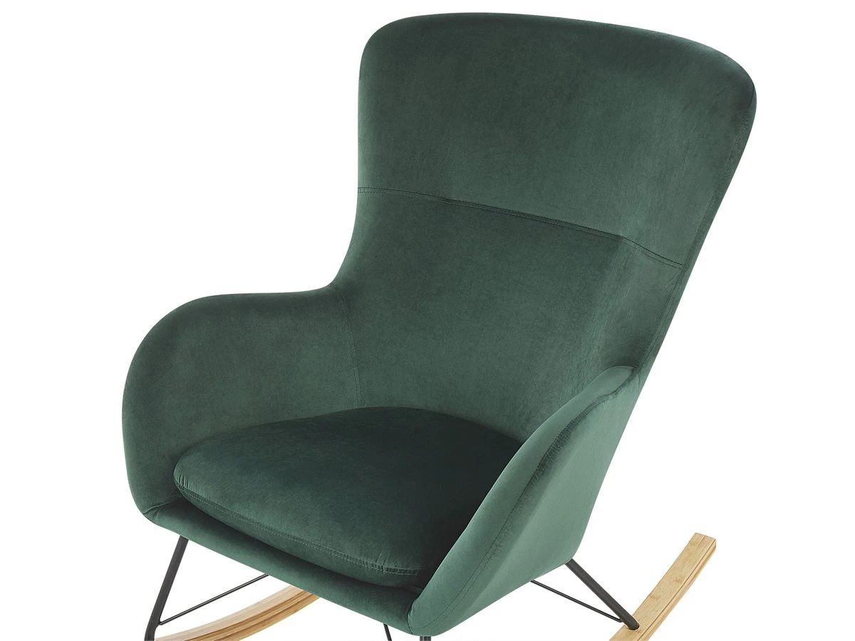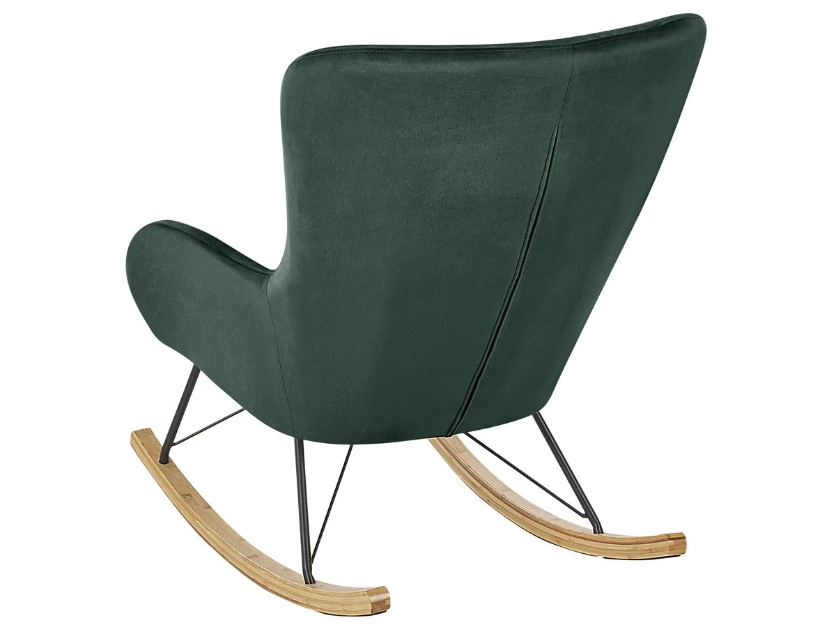 Sillón de diseño moderno. Esta silla mecedora de diseño glamuroso complementa a la perfección la decoración de cualquier interior moderno o tradicional. Está fabricada a partir de tela de terciopelo de fácil mantenimiento. Los 2 patines de madera maciza ofrecen un balanceo suave. Combina bien junto a una chimenea o en una sala de estar. Detalles: Tipo de Producto: Silla mecedora Estilo: Retro Color: Verde Tonalidad: Verde oscuro Tipo de material: Poliéster aterciopelado Material principal: Terciopelo Material adicional: Metal Material del relleno: Espuma Material de las patas: Metal Material del asiento: Poliéster aterciopelado Composición del Material: 100% Poliéster Estilo del apoyabrazo: Redondeado Apoyabrazo: Sí Protectores para patas: No Diseño: Sólido Reclinable: No Construcción del asiento: Madera contrachapada Densidad de espuma del asiento: 24 kg/m3 Dimensiones: Altura del apoyabrazos: 77 cm Profundidad: 90 cm Espesor del asiento: 10 cm Altura del asiento: 49 cm Ancho: 71 cm Altura: 97 cm Superficie del asiento: 48×40 cm Peso: 14 kg Capacidad de peso: 150 kg La oferta incluye: 1 x Sillón Ventajas: Agradable función de balanceo, Cómodos apoyabrazos, Crea un ambiente acogedor, Combina con cualquier estilo de interior, Acolchado de alta calidad, Solida estructura Información de montaje: Requiere montaje de las patas. 20-40 min. Información adicional: Para una mayor estabilidad y seguridad de uso, se recomienda verificar 2 semanas después de la instalación que el montaje del producto ha sido realizado de forma correcta. Revisa, al menos una vez cada 3 meses, que los tornillos estén bien apretados. Ten en cuenta que la tela de terciopelo puede presentar un aspecto distinto según la iluminación a la que esté expuesta: tiende a brillar más a la luz del día y a parecer más tenue con luz artificial en interiores. Debido a la estructura suave de alta densidad, la tonalidad puede verse modificada haciendo pasar la mano en distintas direcciones y ángulos. Para igualar el color y eliminar las arrugas, el material debe limpiarse con la palma de mano abierta en una dirección, con un paño húmedo o una plancha con vapor. Consejos de mantenimiento: Terciopelo: 1.Aspire con un accesorio adecuado 2.Limpiar con champú seco y una esponja húmeda o un limpiador suave. Metal: 1.Limpie con un limpiador y un paño suave, seque después 2.Para elementos de cobre o cromados, use agente abrillantador 3.Para evitar arañazos, no use limpiadores abrasivos.