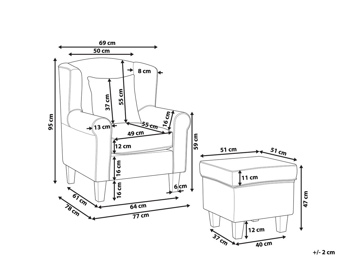 Sillón orejero. Añade un toque de elegancia a tu sala de estar con este sillón. Está fabricado a partir de una mezcla de algodón y tela de poliéster de alta calidad. El respaldo y el asiento de acolchado grueso proporcionan la máxima comodidad. El patrón floral impreso sobre un fondo neutro llama poderosamente la atención. Las patas de madera garantizan estabilidad. Detalles: Tipo de Producto: Sillón Estilo: Retro Color: Beige Tonalidad: Crema Tipo de material: Tejido Material principal: Algodón Material adicional: Madera de eucalipto Material del relleno: Espuma Material de las patas: Derivado de madera Material del asiento: Tejido Composición del Material: 50% Algodón Estilo del apoyabrazo: Estrecho Apoyabrazo: Sí Reposapies: Sí Protectores para patas: Sí Diseño: Floral Reclinable: No Construcción del asiento: Muelles ondulados Densidad de espuma del asiento: 26 kg/m3 Dimensiones: Altura del apoyabrazos: 59 cm Profundidad: 78 cm Dimensiones del reposapies: 51x51x47 cm Espesor del asiento: 12 cm Altura del asiento: 44 cm Ancho: 77 cm Altura: 95 cm Superficie del asiento: 49×55 cm Peso: 29 kg Capacidad de peso: 150 kg La oferta incluye: 1 x Sillón, 1 x Taburete, 1 x Cojín Ventajas: Práctico reposapiés, Increíblemente suave, Diseño clásico, Solida estructura, Materiales de la más alta calidad Información de montaje: Requiere montaje de las patas. 20-40 min. Información adicional: Para una mayor estabilidad y seguridad de uso, se recomienda verificar 2 semanas después de la instalación que el montaje del producto ha sido realizado de forma correcta. Revisa, al menos una vez cada 3 meses, que los tornillos estén bien apretados. Consejos de mantenimiento: Algodón: 1.Aspire con un accesorio adecuado 2.Limpiar con champú seco y una esponja húmeda o un limpiador suave. Madera de caucho: 1.Limpiar con un limpiador suave y un paño suave. Secar después de limpiar.