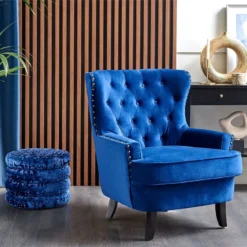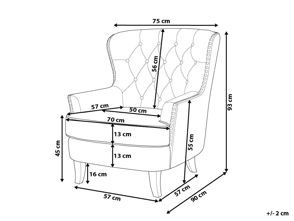 Sillón de terciopelo. Añade comodidad a tu sala de estar con este sillón. Está fabricado a partir de tela de terciopelo de alta calidad. Los reposabrazos de estilo moderno y el respaldo decorado con botones aportan un toque de elegancia al diseño. La estructura de madera de pino y las patas de madera de abedul garantizan estabilidad. Combina bien en cualquier interior tradicional o contemporáneo. Detalles: Tipo de Producto: Sillón Estilo: Retro Color: Azul Tonalidad: Azul marino Tipo de material: Poliéster aterciopelado Material principal: Terciopelo Material adicional: Madera de abedul Material del relleno: Espuma Material de las patas: Madera maciza Material del asiento: Poliéster aterciopelado Composición del Material: 100% Poliéster Estilo del apoyabrazo: Estrecho Apoyabrazo: Sí Protectores para patas: Sí Reclinable: No Construcción del asiento: Muelles ondulados Densidad de espuma del asiento: 22 kg/m3 Dimensiones: Altura del apoyabrazos: 55 cm Profundidad: 90 cm Espesor del asiento: 26 cm Altura del asiento: 45 cm Ancho: 75 cm Altura: 93 cm Superficie del asiento: 57×50 cm Peso: 23 kg Capacidad de peso: 125 kg La oferta incluye: 1 x Sillón Ventajas: Acolchado grueso, Acolchado con botones decorativos, Acabado con remaches que enfatizan la forma del mueble, Tejido aterciopelado suave como la seda, Construcción muy estable Información de montaje: Requiere montaje de las patas. 5-15 min. Información adicional: Para una mayor estabilidad y seguridad de uso, se recomienda verificar 2 semanas después de la instalación que el montaje del producto ha sido realizado de forma correcta. Revisa, al menos una vez cada 3 meses, que los tornillos estén bien apretados. Ten en cuenta que la tela de terciopelo puede presentar un aspecto distinto según la iluminación a la que esté expuesta: tiende a brillar más a la luz del día y a parecer más tenue con luz artificial en interiores. Debido a la estructura suave de alta densidad, la tonalidad puede verse modificada haciendo pasar la mano en distintas direcciones y ángulos. Para igualar el color y eliminar las arrugas, el material debe limpiarse con la palma de mano abierta en una dirección, con un paño húmedo o una plancha con vapor. Consejos de mantenimiento: Terciopelo: 1.Aspire con un accesorio adecuado 2.Limpiar con champú seco y una esponja húmeda o un limpiador suave. Madera de abedul: 1.Los muebles con acabado de aceite deben engrasarse una vez al año, 2.Seque inmediatamente después de limpiar. para evitar que se acumule agua en los muebles 3.Limpie con un limpiador y un paño suave en la dirección del grano.