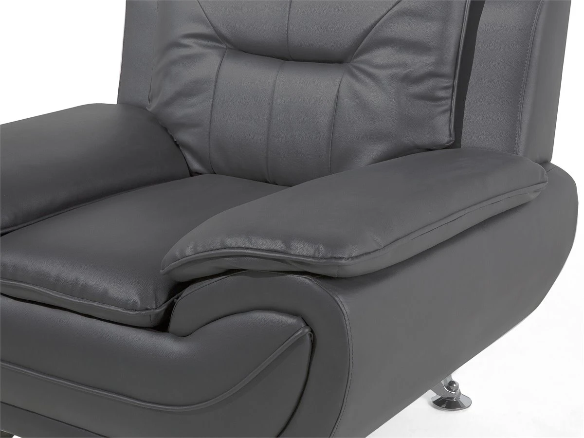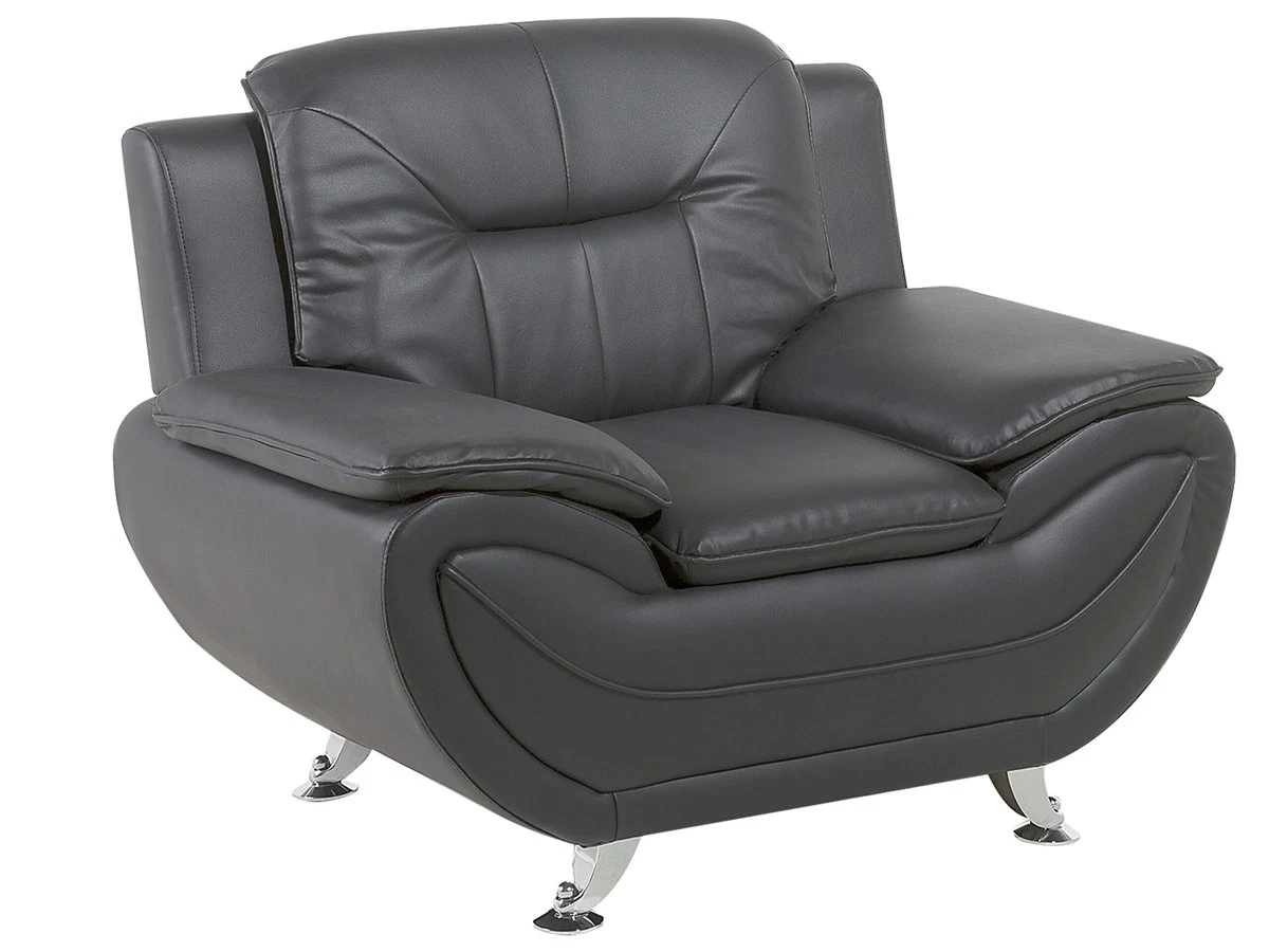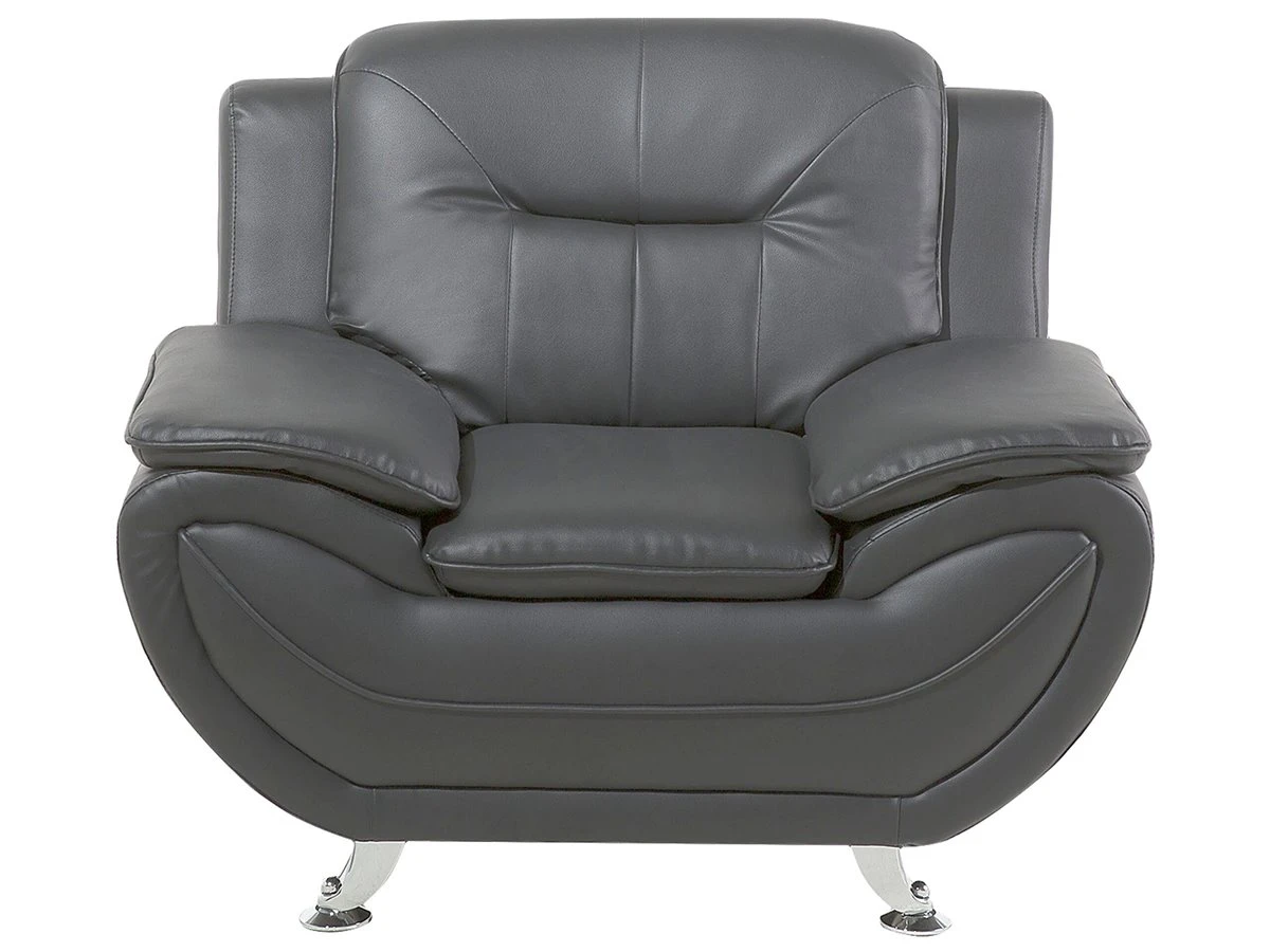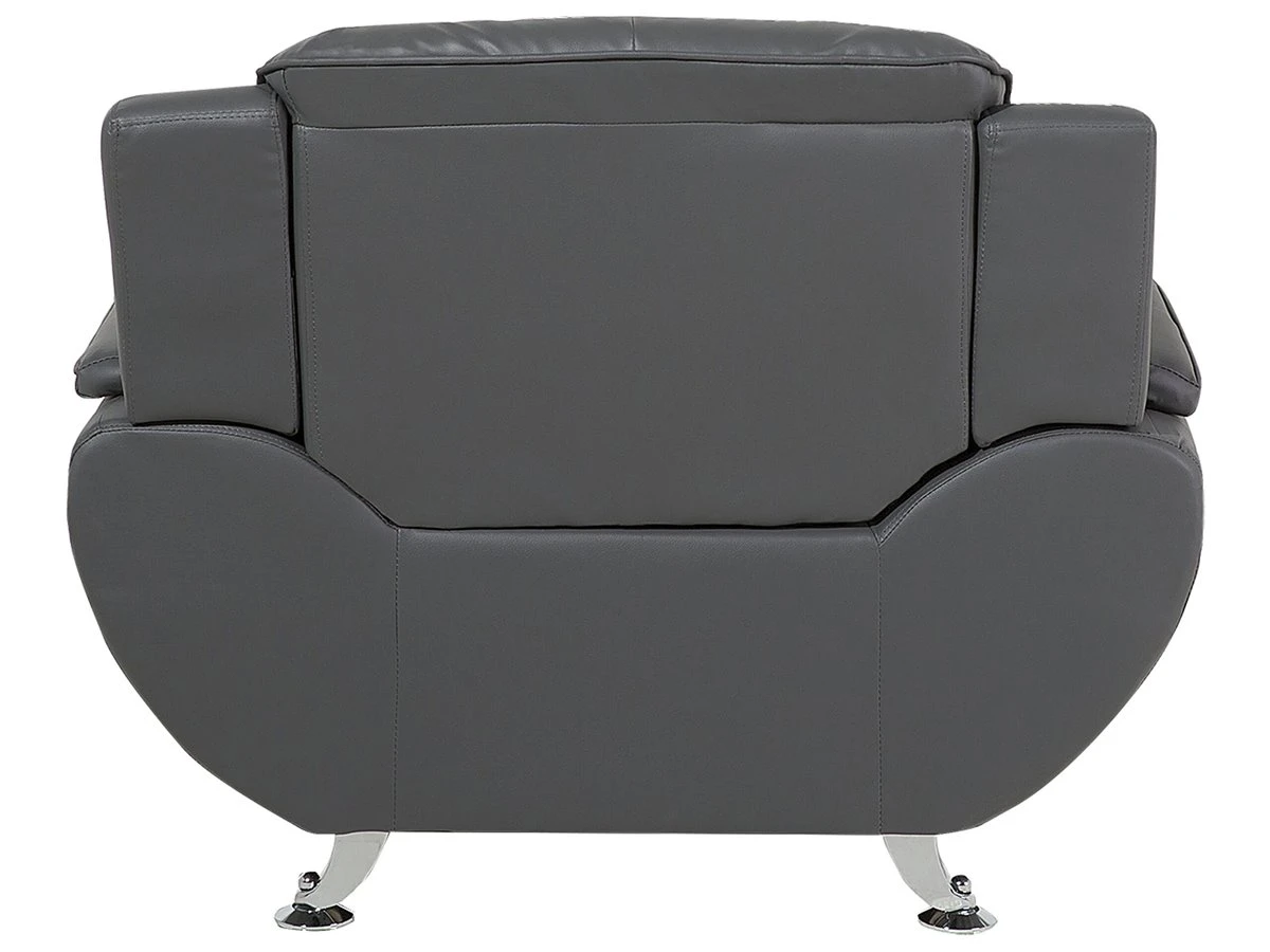 Sillón en piel sintética en gris LEIRA. Añade un toque clásico a tu sala de estar con este sillón. Está fabricado a partir de piel sintética de alta calidad y suave al tacto. El asiento de acolchado grueso y los reposabrazos anchos contrastan con las patas finas de metal y las líneas horizontales en el respaldo. Detalles: Tipo de Producto: Sillón Estilo: Moderno Color: Gris Tipo de material: Piel sintética Material principal: Piel sintética Material adicional: Metal Material del relleno: Espuma Material de las patas: Metal Material del asiento: Piel sintética Estilo del apoyabrazo: Con cojín Apoyabrazo: Sí Protectores para patas: Sí Reclinable: No Construcción del asiento: Muelles ondulados Densidad de espuma del asiento: 25 kg/m3 Dimensiones: Altura del apoyabrazos: 49 cm Profundidad: 86 cm Espesor del asiento: 34 cm Altura del asiento: 44 cm Ancho: 113 cm Altura: 88 cm Superficie del asiento: 57×37 cm Peso: 27 kg Capacidad de peso: 120 kg La oferta incluye: 1 x Sillón Ventajas: Confort del asiento óptimo, Brinda sensaciones de relax, Combina con cualquier estilo de interior, Diseño moderno, Fabricación sólida y precisa, Muy fácil de conservar, Completamente tapizado Información de montaje: Requiere montaje parcial. 20-40 min. Información adicional: A efectos de transporte, las patas están ocultas en un bolsillo en la parte inferior del asiento. Para una mayor estabilidad y seguridad de uso, se recomienda verificar 2 semanas después de la instalación que el montaje del producto ha sido realizado de forma correcta. Revisa, al menos una vez cada 3 meses, que los tornillos estén bien apretados. Consejos de mantenimiento: Piel sintética: 1.Aspire con un accesorio adecuado 2.Una vez a la semana, limpie con un paño húmedo y seque después. No engrasar, 3.Use solo limpiadores suaves y acondicionadores dedicados a la piel sintética, 4.Limpie con agua destilada y use limpiadores a base de jabón en las manchas difíciles. Metal: 1.Limpie con un limpiador y un paño suave, seque después 2.Para elementos de cobre o cromados, use agente abrillantador 3.Para evitar arañazos, no use limpiadores abrasivos.