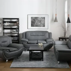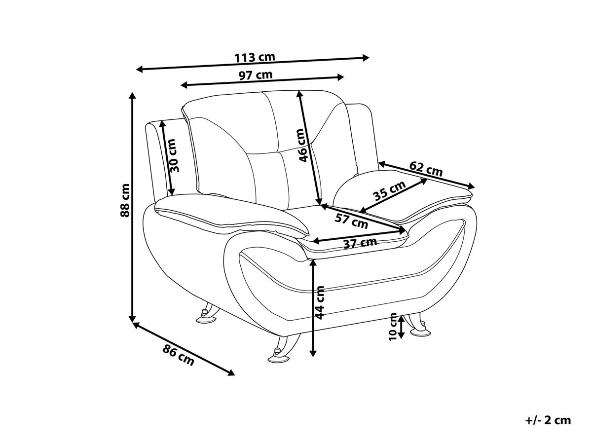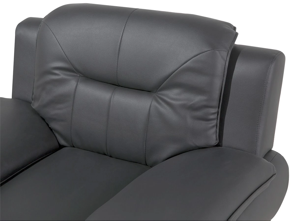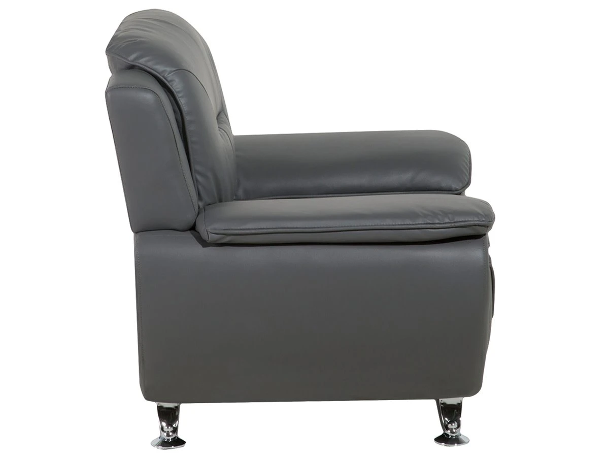 Sillón en piel sintética en gris LEIRA. Añade un toque clásico a tu sala de estar con este sillón. Está fabricado a partir de piel sintética de alta calidad y suave al tacto. El asiento de acolchado grueso y los reposabrazos anchos contrastan con las patas finas de metal y las líneas horizontales en el respaldo. Detalles: Tipo de Producto: Sillón Estilo: Moderno Color: Gris Tipo de material: Piel sintética Material principal: Piel sintética Material adicional: Metal Material del relleno: Espuma Material de las patas: Metal Material del asiento: Piel sintética Estilo del apoyabrazo: Con cojín Apoyabrazo: Sí Protectores para patas: Sí Reclinable: No Construcción del asiento: Muelles ondulados Densidad de espuma del asiento: 25 kg/m3 Dimensiones: Altura del apoyabrazos: 49 cm Profundidad: 86 cm Espesor del asiento: 34 cm Altura del asiento: 44 cm Ancho: 113 cm Altura: 88 cm Superficie del asiento: 57×37 cm Peso: 27 kg Capacidad de peso: 120 kg La oferta incluye: 1 x Sillón Ventajas: Confort del asiento óptimo, Brinda sensaciones de relax, Combina con cualquier estilo de interior, Diseño moderno, Fabricación sólida y precisa, Muy fácil de conservar, Completamente tapizado Información de montaje: Requiere montaje parcial. 20-40 min. Información adicional: A efectos de transporte, las patas están ocultas en un bolsillo en la parte inferior del asiento. Para una mayor estabilidad y seguridad de uso, se recomienda verificar 2 semanas después de la instalación que el montaje del producto ha sido realizado de forma correcta. Revisa, al menos una vez cada 3 meses, que los tornillos estén bien apretados. Consejos de mantenimiento: Piel sintética: 1.Aspire con un accesorio adecuado 2.Una vez a la semana, limpie con un paño húmedo y seque después. No engrasar, 3.Use solo limpiadores suaves y acondicionadores dedicados a la piel sintética, 4.Limpie con agua destilada y use limpiadores a base de jabón en las manchas difíciles. Metal: 1.Limpie con un limpiador y un paño suave, seque después 2.Para elementos de cobre o cromados, use agente abrillantador 3.Para evitar arañazos, no use limpiadores abrasivos.