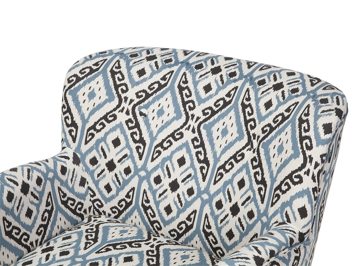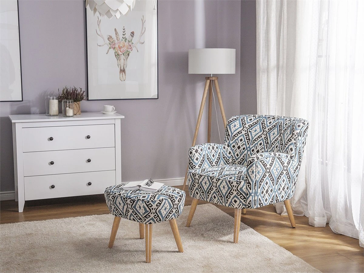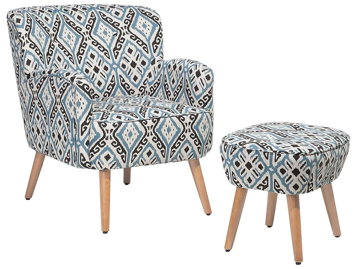 Cómodo sillón con un práctico reposapiés con alegre estampado étnico. Añade un toque vintage a tu sala de estar, dormitorio u oficina en casa con este sillón. Está fabricado a partir de tela de poliéster de alta calidad y suave al tacto. El reposapiés y los reposabrazos empotrados llaman poderosamente la atención. Combina bien en cualquier interior moderno o glamuroso. Detalles: Tipo de Producto: Sillón Estilo: Retro Color: Multicolor Tonalidad: Azul claro Tipo de material: Tejido Material principal: Poliéster Material adicional: Madera de caucho Material del relleno: Espuma Material de las patas: Madera maciza Material del asiento: Tejido Composición del Material: 100% Poliéster Estilo del apoyabrazo: Integrado Apoyabrazo: Sí Reposapies: Sí Protectores para patas: Sí Diseño: Oriental Reclinable: No Construcción del asiento: Bandas elásticas Densidad de espuma del asiento: 24 kg/m3 Dimensiones: Altura del apoyabrazos: 62 cm Profundidad: 66 cm Dimensiones del reposapies: 52x44x43 cm Espesor del asiento: 20 cm Altura del asiento: 44 cm Ancho: 74 cm Altura: 85 cm Superficie del asiento: 51×51 cm Peso: 21 kg Capacidad de peso: 160 kg La oferta incluye: 1 x Sillón, 1 x Taburete Ventajas: Confort del asiento óptimo, Práctico reposapiés, Decorativo y funcional, No requiere mantenimiento regular, Alta calidad, Completamente tapizado Información de montaje: Requiere montaje parcial. 20-40 min. Información adicional: Para una mayor estabilidad y seguridad de uso, se recomienda verificar 2 semanas después de la instalación que el montaje del producto ha sido realizado de forma correcta. Revisa, al menos una vez cada 3 meses, que los tornillos estén bien apretados. Consejos de mantenimiento: Poliéster: 1.Limpiar con champú seco y una esponja húmeda o un limpiador suave 2.Aspire con un accesorio adecuado. Madera de caucho: 1.Seque inmediatamente después de limpiar. para evitar que se acumule agua en los muebles 2.Limpie con un limpiador y un paño suave en la dirección del grano 3.Los muebles con acabado de aceite deben engrasarse una vez al año