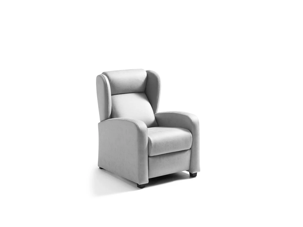 ADA Sillón Relax Manual. Estructura de madera y tablero de partículas. Revestimiento en tela, color gris claro. Patas en PVC, color wengué. Medidas: 72an x 98al x 88 fon cm.