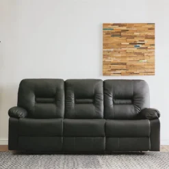 Sofá con reclinación manual. Añade a tu sala de estar este sofá de 3 plazas de diseño moderno y funcional. Está fabricado de metal resistente y estable. Cuenta con un respaldo reclinable y un reposapiés que se regula según el peso corporal. Los asientos acolchados de piel sintética suave al tacto ofrecen soporte y comodidad. Detalles: Tipo de Producto: Sofá reclinable Estilo: Moderno Color: Negro Tipo de material: Piel sintética Material principal: Piel sintética Material adicional: Acero Material del relleno: Espuma Composición del Material: 100% Piel ecológica Estilo del apoyabrazo: Con cojín Apoyabrazo: Sí Parte posterior tapizada: Sí Diseño: Sólido Construcción del asiento: Muelles de bolsillo Densidad de espuma del asiento: 28 kg/m3 Asientos para: 3 personas Dimensiones: Altura del apoyabrazos: 61 cm Profundidad: 73 cm Espesor del asiento: 22 cm Altura del asiento: 49 cm Ancho: 204 cm Altura: 101 cm Superficie del asiento: 169×53 cm Peso: 62 kg Capacidad de peso por persona: 150 kg La oferta incluye: 1 x Sofá de 3 plazas Ventajas: Reposapiés y brazos ajustables, Brinda sensaciones de relax, Asiento bajo y profundo, Diseño clásico, Alta calidad, Totalmente reclinable a la posición horizontal, Completamente tapizado Información de montaje: Requiere montaje parcial. 20-40 min. Información adicional: Para un uso seguro, debe haber un espacio de ~15 cm entre el respaldo y la pared. Consejos de mantenimiento: Piel sintética: 1.Aspire con un accesorio adecuado 2.Una vez a la semana, limpie con un paño húmedo y seque después. No engrasar, 3.Use solo limpiadores suaves y acondicionadores dedicados a la piel sintética, 4.Limpie con agua destilada y use limpiadores a base de jabón en las manchas difíciles.