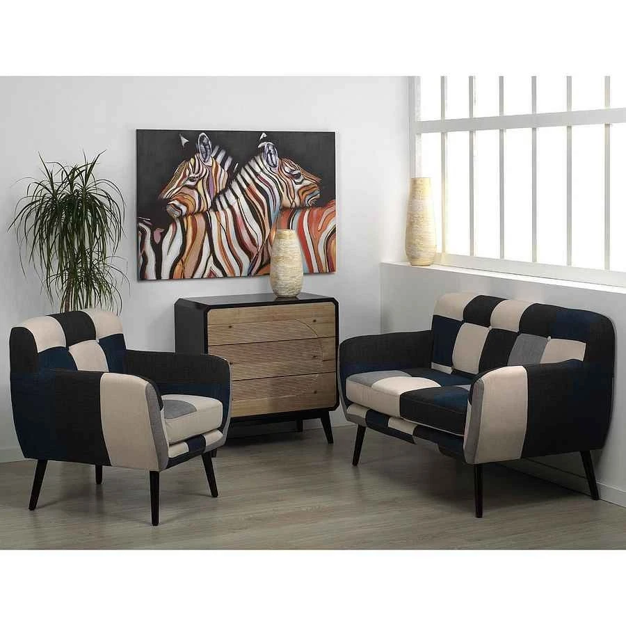¿Quieres dar un toque de distinción a tu salón? Con este sofá de 2 plazas Dianora seguro que lo consigues.Su diseño vintage combinado con un tapizado multicolor en tonos azules y grises, se llevará las miradas de todos.Además también tiene sillón individual a juego y banqueta con espacio interior.Peso: 21Anchura: 74Longitud: 132Altura: 84Color: tapizado en color azul, blanco y gris. Patas lacadas en negro.Material: Armazón de tablero DM con asiento tapizado en tejido 100% acrílico.Detalles: Armazón de madera con asiento tapizado en tejido 100% acrílico. No desenfundable. Patas de hierro.El diseño es mucho mas que la pura estética visualmente atractiva. El diseño tiene que estar asociado sobre todo con el bienestar, la energía, el compromiso, el respeto y la conciencia. En Akunadecor trabajamos para que el diseño cumpla todos estos puntos y este al alcance de todos, pensando en tu felicidad. Nuestros productos estan pensados el En AkunaDecor intentamos ofrecer productos para el hogar, al alcance de cualquiera que desee ultimas tendencias con un toque cosmopolita, moderno y funcional en una constante renovación y siempre con agilidad.Disponemos de una extensa coleccion de iluminacion, mobiliario y decoracion de la prestigiosa.Nuestra gran variedad de artilucos de decoracion es muy extensa podeis ecoger cualquier diseño acuerdo con tu hogarSi queres darle un estilo unico a tu despacho … este producto seria ideal para rellenar el fondo de la pared, lo podias acompañar de un bonito sillon justo debajo.Nuestra gran variedad de artilucos de decoracion es muy extensa podeis escoger cualquier diseño acuerdo con tu hogarSi necesita mas informacion sobre este producto no dude en contactar con nosotros y estaremos encantados de atenderle.