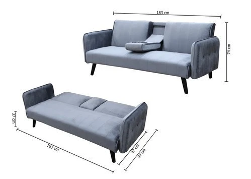 El sofá cama Roma ofrece un asiento cómodo y relajante con apoyabrazos para cualquier momento del día y al mismo tiempo permite ahorrar espacio y tener un rápido, práctico y solución decorativa para cuando tienes invitados en casa, sin renunciar al estilo y la elegancia. Simplemente bajando el respaldo usando el sistema clic clac podrás disfrutar de un descanso incomparable. Cuenta con relleno de espuma de densidad media y estructura de madera de pino, la capacidad para tres personas, la atención al detalle y la tapicería agradable al tacto disponible en varios colores lo convierten en un sofá indiscutiblemente acogedor, apto tanto para el confort diario como nocturno e ideal para cualquier estancia de la casa. Es igualmente útil para visitas repentinas, de hecho, para tener un lugar cómodo para descansar, será suficiente con plegar el respaldo y en poco tiempo obtendrá una cama supletoria suave y acogedora. La estructura del sofá es robusta, sólida y sobre todo duradera: los materiales de primera calidad utilizados para hacer el marco aumentan la resistencia, mientras que el acolchado de espuma garantiza un confort óptimo en cada ocasión, el respaldo y el asiento de excelente elaboración están revestidos con un tejido suave al tacto y cuidadosamente trabajados para mantener una alta calidad tanto en términos estéticos como funcionales, incluso después de muchos años. Características: -Respaldo reclinable con sistema clic clac de fácil uso –Tapicería aterciopelada –Plazas: 3 plazas – Montaje sencillo –Material: Relleno de espuma –Capacidad: 120kg –Estructura: Madera de pino –Colores disponibles: Negro, gris claro, gris oscuro –Tela: Terciopelo, tela –Medidas 183cm largo x 74cm alto; Hecho cama: 183cm x 37cm x 97cm (largo, alto, ancho Especificaciones: -Color: Negro, gris y gris oscuro –Material: Relleno de espuma –Montaje: Montaje de las patas y reposa brazos –Material: Estructura de madera de pino, espuma –Tapicería: terciopelo –Reclinación: Tres grados de reclinación (180º, 45º, 90º.