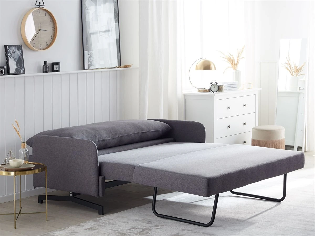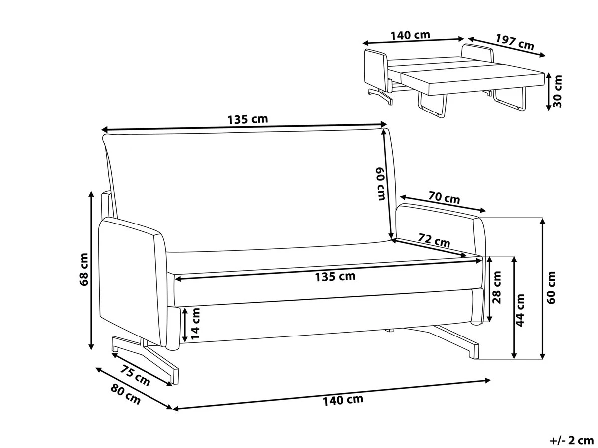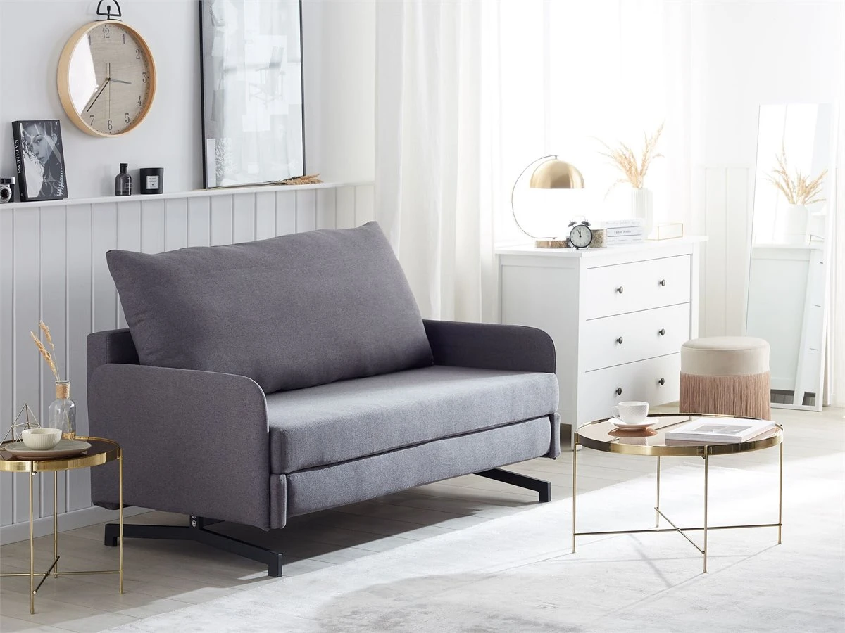 Funcional sofá cama tapizado en gris. Añade a tu interior este sofá cama decorativo y funcional. Gracias a su diseño compacto, es ideal para habitaciones de dimensiones reducidas. Está fabricado a partir de poliéster de alta calidad. Fácilmente convertible en cama de invitados. Combina bien con cualquier esquema de colores, creando un ambiente relajante. Detalles: Tipo de Producto: Sofá de 2 plazas Estilo: Retro Color: Gris Tipo de material: Tejido Material principal: Poliéster Material adicional: Acero inoxidable Material del relleno: Espuma Composición del Material: 100% Poliéster Estilo del apoyabrazo: Estrecho Parte posterior tapizada: Sí Protectores para patas: Sí Reclinable: No Fundas de cojín extraíble: Sí Construcción del asiento: Metal Densidad de espuma del asiento: 25 kg/m3 Asientos para: 2 personas Función para dormir: Sí Mecanismo de abertura del sofa cama: Plegable Almacenamiento: No Dimensiones: Altura del apoyabrazos: 60 cm Profundidad: 80 cm Espesor del asiento: 14 cm Altura del asiento: 44 cm Ancho: 140 cm Altura: 68 cm Superficie del asiento: 140×72 cm Superficie para dormir: 197×140 cm Peso: 55 kg Capacidad de peso por persona: 150 kg La oferta incluye: 1 x Sofá Ventajas: Se convierte en cómoda cama, Funda extraíble, Acolchado grueso, Muy cómodo, Apariencia elegante, Construcción muy estable Información de montaje: Requiere montaje parcial. 20-40 min. Consejos de mantenimiento: Poliéster: 1.Limpiar con champú seco y una esponja húmeda o un limpiador suave 2.Aspire con un accesorio adecuado. Acero inoxidable: 1.Limpie con un limpiador y un paño suave, seque después 2.Para elementos de cobre o cromados, use agente abrillantador 3.Para evitar arañazos, no use limpiadores abrasivos.