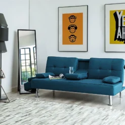 Sofá cama multifuncional con un diseño moderno en gris oscuro. Añade a tu sala de estar o habitación de invitados este sofá cama de diseño moderno. Está fabricado a partir de tela de poliéster de alta calidad. Las patas de metal garantizan estabilidad. Los cojines adicionales vienen con funda extraíble. Fácilmente convertible en cama gracias a su respaldo reclinable. Detalles: Tipo de Producto: Sofá de 3 plazas Estilo: Moderno Color: Gris Tonalidad: Gris oscuro Tipo de material: Tejido Material principal: Poliéster Material adicional: Madera de eucalipto Material del relleno: Espuma Composición del Material: 100% Poliéster Estilo del apoyabrazo: Sin reposabrazos Apoyabrazo: Sí Parte posterior tapizada: No Protectores para patas: Sí Reclinable: Sí Fundas de cojín extraíble: Sí Construcción del asiento: Muelles ondulados Densidad de espuma del asiento: 60 kg/m3 Asientos para: 3 personas Función para dormir: Sí Mecanismo de abertura del sofa cama: Mecanismo click-clack Almacenamiento: No Dimensiones: Altura del apoyabrazos: 43 cm Profundidad: 81 cm Espesor del asiento: 18 cm Altura del asiento: 36 cm Ancho: 168 cm Altura: 77 cm Superficie del asiento: 168×51 cm Superficie para dormir: 168×100 cm Peso: 32 kg Capacidad de peso por persona: 84 kg La oferta incluye: 1 x Sofá, 2 x Almohada Ventajas: Espaciosa superficie para dormir, El complemento ideal para todo tipo de decoracíon, Acolchado de alta calidad, Cojines extraíbles para un fácil mantenimiento, Respaldo ajustable, Patas con tapas antideslizantes de seguridad Información de montaje: Requiere montaje de las patas. 20-40 min. Consejos de mantenimiento: Poliéster: 1.Aspire con un accesorio adecuado 2.Limpiar con champú seco y una esponja húmeda o un limpiador suave. Acero inoxidable: 1.Para elementos de cobre o cromados, use agente abrillantador 2.Para evitar arañazos, no use limpiadores abrasivos 3.Limpie con un limpiador y un paño suave, seque después.