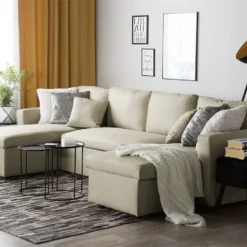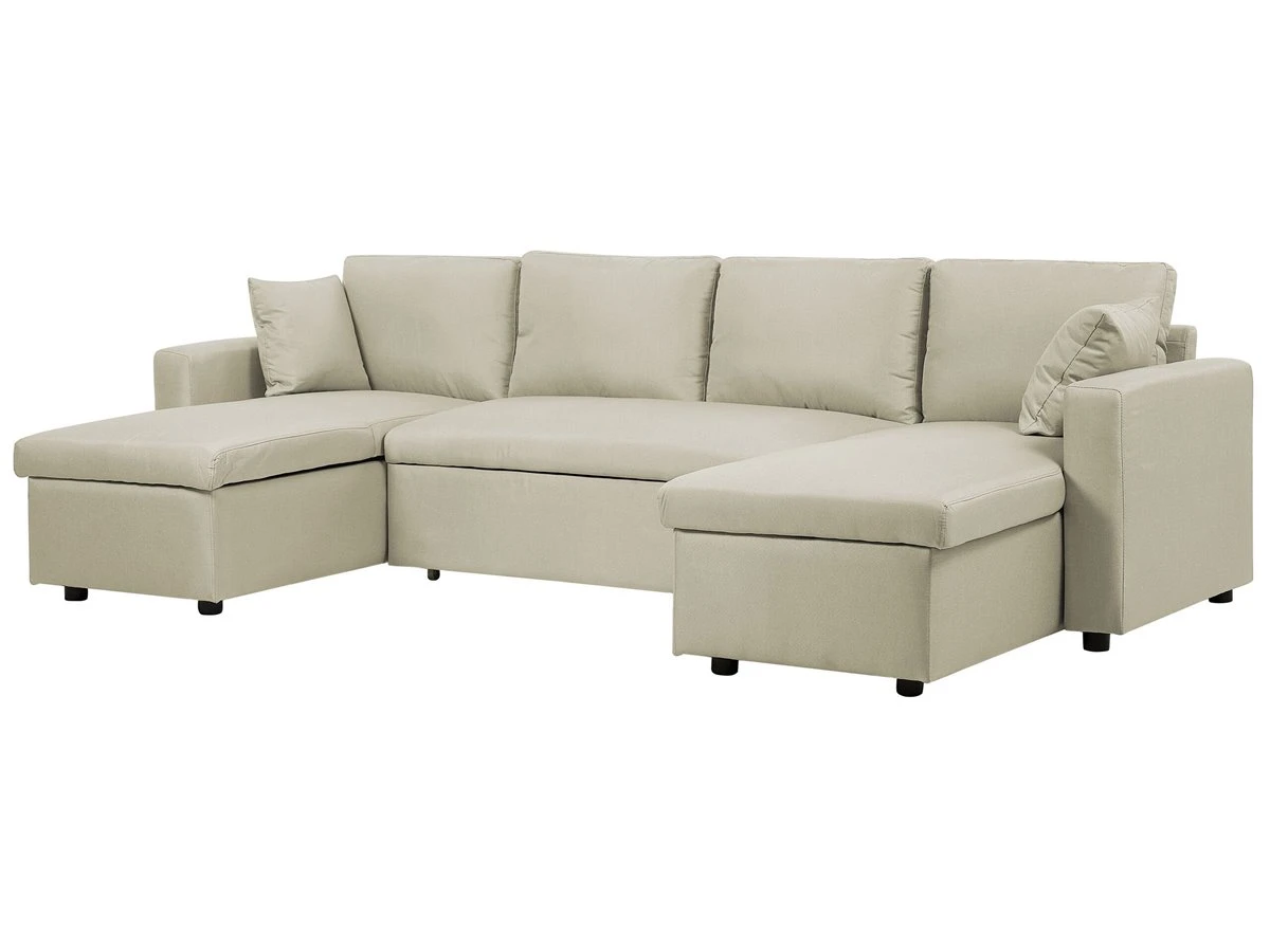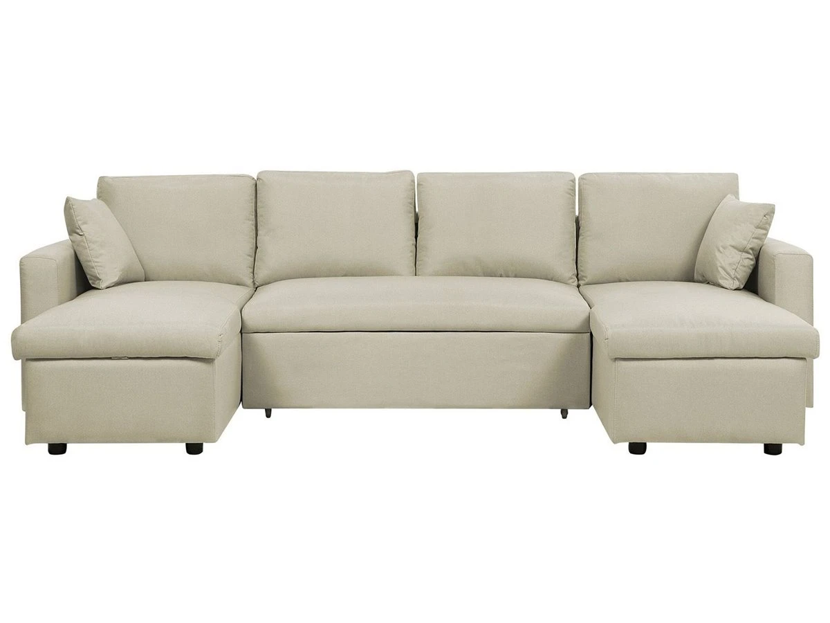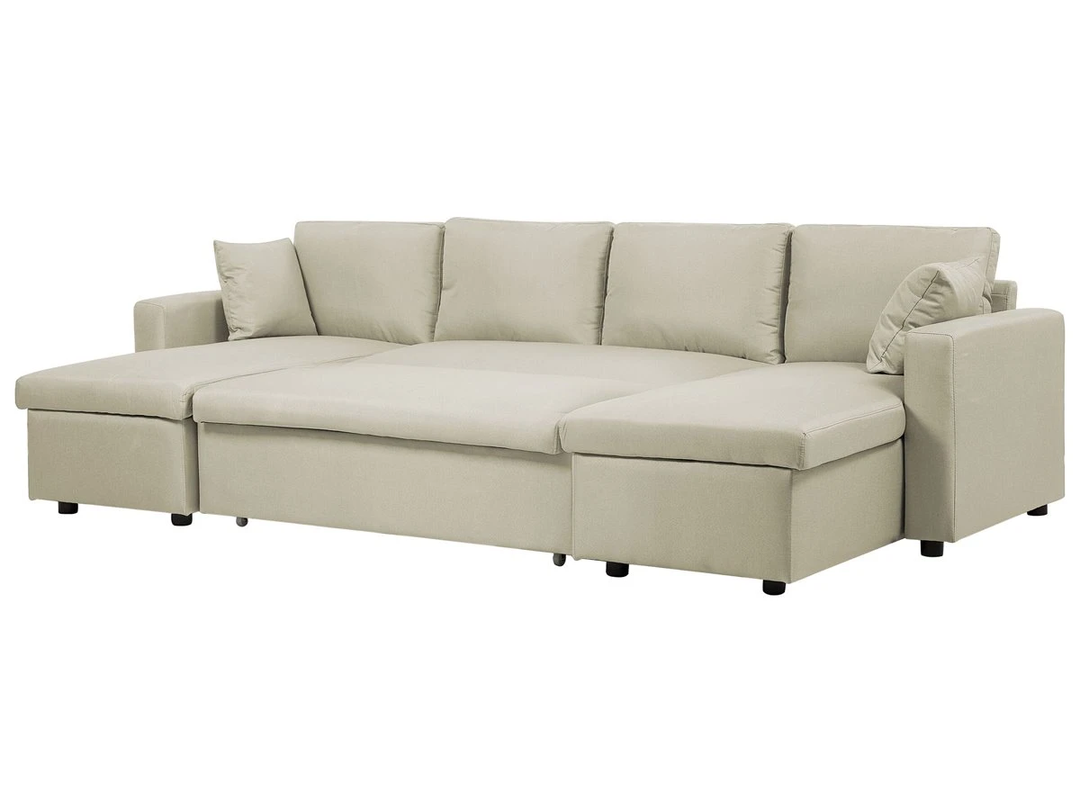 Espacioso sofá cama tapizado. Añade elegancia y funcionalidad a tu interior con este sofá cama en forma de U. Combina bien con cualquier sala de estar de estilo tradicional, contemporáneo o minimalista. Está fabricado a partir de poliéster de alta calidad. Los cojines de asiento y respaldo ofrecen la máxima comodidad. Las patas de plástico garantizan estabilidad. Incluye un espacio de almacenaje para guardar las sábanas y los edredones. Fácilmente convertible en cama. Detalles: Tipo de Producto: Sofá esquinero Estilo: Moderno Color: Beige Tipo de material: Tejido Material principal: Poliéster Material adicional: Material sintético Material del relleno: Espuma Composición del Material: 100% Poliéster Forma: Forma de U Estilo del apoyabrazo: Estrecho Apoyabrazo: Sí Parte posterior tapizada: Sí Protectores para patas: No Piezas modulares: Sí Orientación: Simétrico Reclinable: No Fundas de cojín extraíble: Sí Construcción del asiento: Muelles ondulados Densidad de espuma del asiento: 45 kg/m3 Asientos para: 4 – 6 personas Función para dormir: Sí Mecanismo de abertura del sofa cama: Tracción Almacenamiento: Sí Dimensiones: Altura del apoyabrazos: 61 cm Profundidad: 147 cm Espesor del asiento: 17 cm Altura del asiento: 44 cm Ancho: 287 cm Altura: 86 cm Superficie del asiento: 129×56/2x163x69 cm Superficie para dormir: 123×259 cm Peso: 119 kg Capacidad de peso por persona: 150 kg La oferta incluye: 2 x Caja de almacenaje, 1 x Sofá, 1 x Caja baúl, 2 x Almohada Ventajas: Convertible en cómoda cama, Brinda sensaciones de relax, Ideal para todo tipo de decoración, Muy fácil de conservar, Cojines extraíbles para un fácil mantenimiento, Espacio de almacenaje adicional, Completamente tapizado Información de montaje: Requiere montaje parcial. 20-40 min. Consejos de mantenimiento: Poliéster: 1.Aspire con un accesorio adecuado 2.Limpiar con champú seco y una esponja húmeda o un limpiador suave. Material sintético: 1.Limpie con un limpiador y un paño suave, seque después.