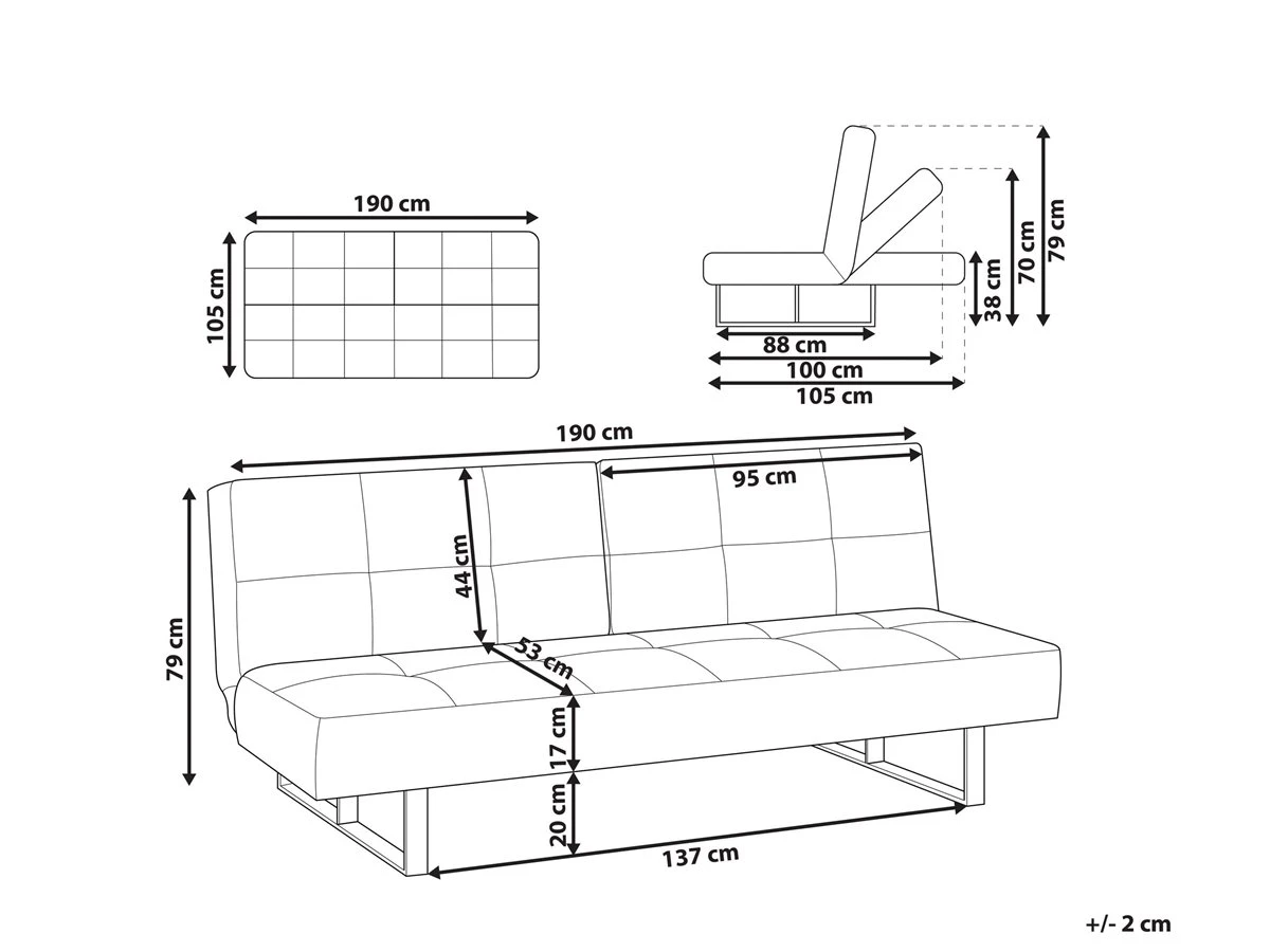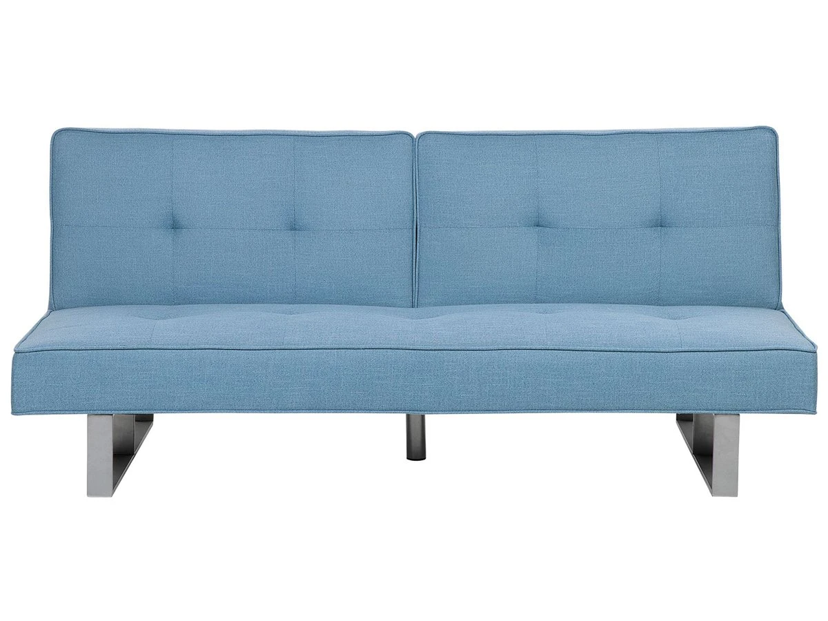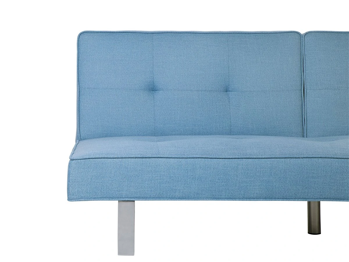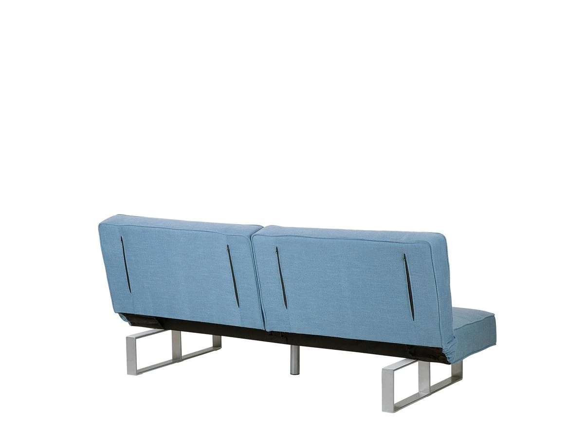 Sofá cama de diseño moderno. Añade a tu interior este sofá cama de diseño moderno. El acolchado grueso proporciona la máxima comodidad al sentarse o tumbarse. Ofrece el suficiente espacio para 4 personas. Las patas combinan bien con el tejido de alta calidad. Fácilmente convertible en cama para 2. Detalles: Tipo de Producto: Sofá cama Estilo: Moderno Color: Azul Tonalidad: Azul claro Tipo de material: Tejido Material principal: Poliéster Material adicional: Metal Material del relleno: Espuma Composición del Material: 100% Poliéster Estilo del apoyabrazo: Sin reposabrazos Apoyabrazo: No Parte posterior tapizada: Sí Protectores para patas: Sí Reclinable: No Fundas de cojín extraíble: No Construcción del asiento: Muelles ondulados Densidad de espuma del asiento: 30 kg/m3 Asientos para: 3 personas Función para dormir: Sí Mecanismo de abertura del sofa cama: Mecanismo click-clack Almacenamiento: No Dimensiones: Profundidad: 88-105 cm Espesor del asiento: 17 cm Altura del asiento: 37 cm Ancho: 190 cm Altura: 38-79 cm Superficie del asiento: 190×53 cm Superficie para dormir: 190×105 cm Peso: 44 kg Capacidad de peso por persona: 150 kg La oferta incluye: 1 x Sofá Ventajas: Espaciosa superficie para dormir, Diseño moderno, Solida estructura, Acolchado de alta calidad, Respaldo ajustable, Se despliega fácilmente Información de montaje: Requiere montaje de las patas. 5-15 min. Consejos de mantenimiento: Poliéster: 1.Aspire con un accesorio adecuado 2.Limpiar con champú seco y una esponja húmeda o un limpiador suave. Metal: 1.Para elementos de cobre o cromados, use agente abrillantador 2.Para evitar arañazos, no use limpiadores abrasivos 3.Limpie con un limpiador y un paño suave, seque después.