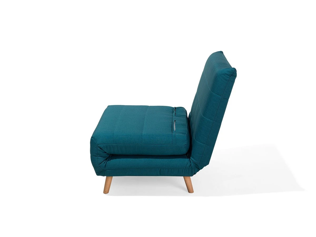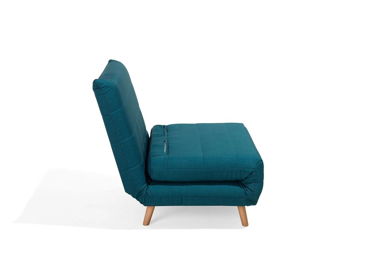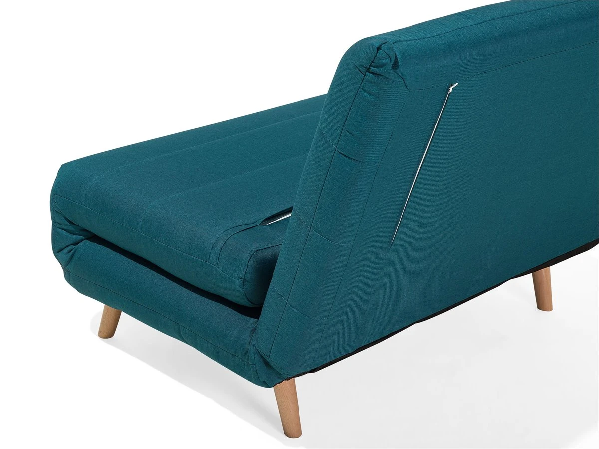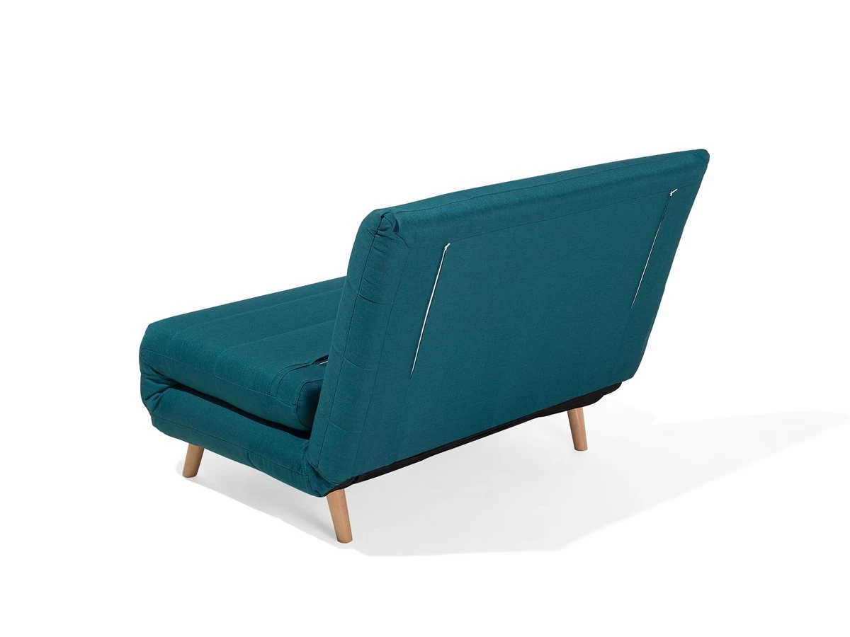 Elegante y cómodo sofá cama en color azul. Este sofá cama de diseño compacto aporta una cierta funcionalidad a cualquier sala de estar. Está fabricado a partir de tela de poliéster de alta calidad. Las costuras horizontales y las patas de madera combinan bien con un interior de estilo moderno o escandinavo. El cojín adicional viene con funda extraíble. Fácilmente convertible en cama gracias a su respaldo regulable. Detalles: Tipo de Producto: Sofá cama Estilo: Moderno Color: Azul Tonalidad: Azul turquesa Tipo de material: Tejido Material principal: Poliéster Material adicional: Madera de abedul Material del relleno: Espuma Composición del Material: 100% Poliéster Estilo del apoyabrazo: Sin reposabrazos Apoyabrazo: No Parte posterior tapizada: Sí Protectores para patas: Sí Reclinable: Sí Fundas de cojín extraíble: Sí Construcción del asiento: Muelles ondulados Densidad de espuma del asiento: 50 kg/m3 Asientos para: 1 persona Función para dormir: Sí Mecanismo de abertura del sofa cama: Plegable Almacenamiento: No Dimensiones: Profundidad: 90/190 cm Espesor del asiento: 28 cm Altura del asiento: 42 cm Ancho: 104 cm Altura: 82 cm Superficie del asiento: 104×64 cm Superficie para dormir: 190×104 cm Peso: 31 kg Capacidad de peso por persona: 150 kg La oferta incluye: 1 x Sofá, 1 x Cojín Ventajas: Se convierte en cómoda cama, El grueso acolchado del asiento brinda comodidad, Diseño clásico, Cojines extraíbles para un fácil mantenimiento, Ocupa poco espacio , Completamente tapizado, Respaldo ajustable, Patas con tapas antideslizantes de seguridad Información de montaje: Requiere montaje de las patas. 5-15 min. Consejos de mantenimiento: Poliéster: 1.Aspire con un accesorio adecuado 2.Limpiar con champú seco y una esponja húmeda o un limpiador suave.