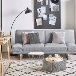 Sofá cama para 2 personas. Este sofá cama de diseño elegante es ideal para una sala de estar de dimensiones reducidas. Está fabricado a partir de poliéster de alta calidad. El asiento y el respaldo de acolchado grueso ofrecen la máxima comodidad. La estructura de madera y las patas de metal garantizan estabilidad. Fácilmente convertible en cama gracias al mecanismo clic-clac incorporado. Detalles: Tipo de Producto: Sofá cama Estilo: Escandinavo Color: Azul Tonalidad: Azul oscuro Tipo de material: Tejido Material principal: Poliéster Material adicional: Acero inoxidable Material del relleno: Espuma Composición del Material: 100% Poliéster Estilo del apoyabrazo: Ajustable Apoyabrazo: Sí Parte posterior tapizada: No Protectores para patas: Sí Reclinable: Sí Fundas de cojín extraíble: No Construcción del asiento: Muelles ondulados Densidad de espuma del asiento: 24/60 kg/m3 Asientos para: 2 personas Función para dormir: Sí Mecanismo de abertura del sofa cama: Mecanismo click-clack Almacenamiento: No Dimensiones: Altura del apoyabrazos: 42/65 cm Profundidad: 89 cm Espesor del asiento: 16 cm Altura del asiento: 41 cm Ancho: 190 cm Altura: 81 cm Superficie del asiento: 190×52 cm Superficie para dormir: 190×105 cm Peso: 44 kg Capacidad de peso por persona: 90 kg La oferta incluye: 1 x Sofá Ventajas: Convertible en cómoda cama, Muy cómodo, Diseño tradicional con un toque moderno, Materiales de la más alta calidad, Patas con tapas antideslizantes de seguridad, Apoyabrazos ajustables Información de montaje: Requiere montaje de las patas. 5-15 min. Consejos de mantenimiento: Poliéster: 1.Aspire con un accesorio adecuado 2.Limpiar con champú seco y una esponja húmeda o un limpiador suave. Acero inoxidable: 1.Para elementos de cobre o cromados, use agente abrillantador 2.Para evitar arañazos, no use limpiadores abrasivos 3.Limpie con un limpiador y un paño suave, seque después.