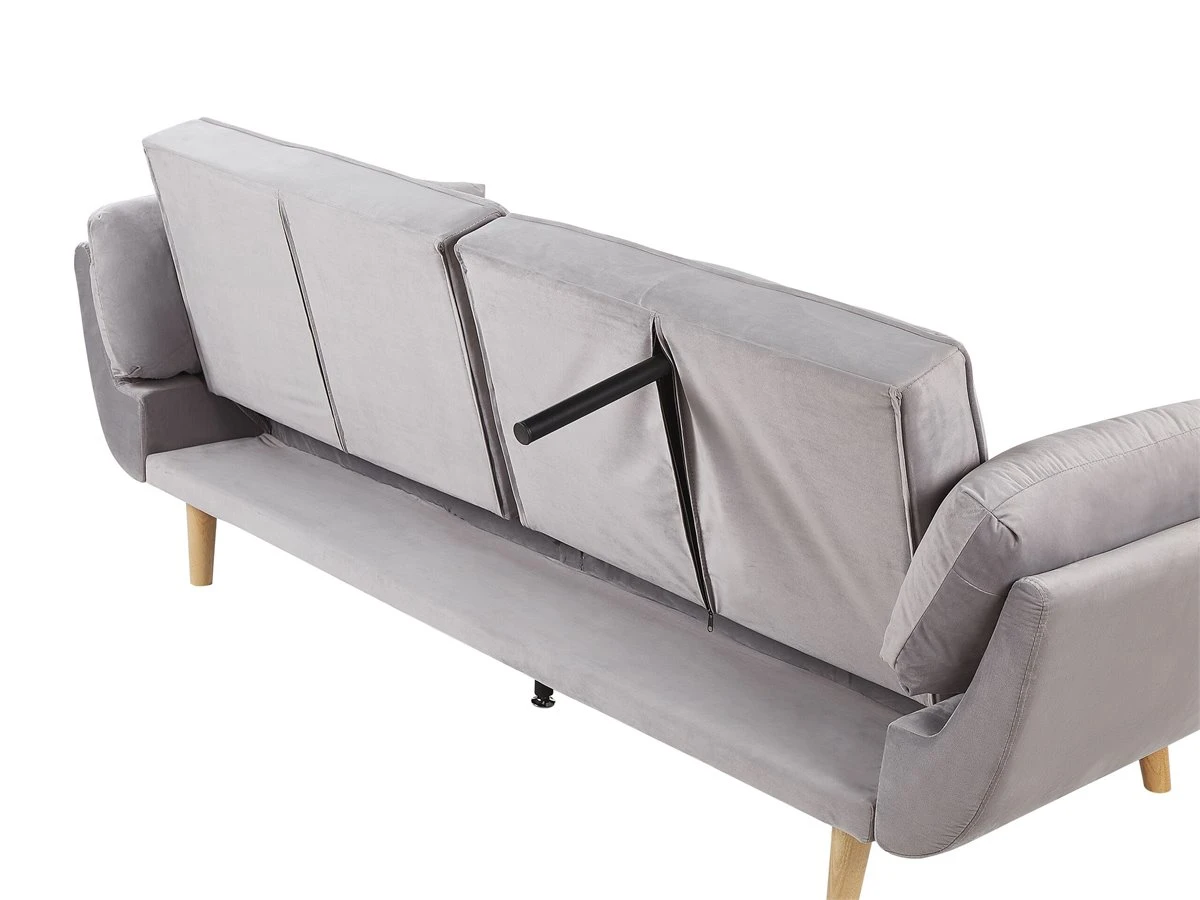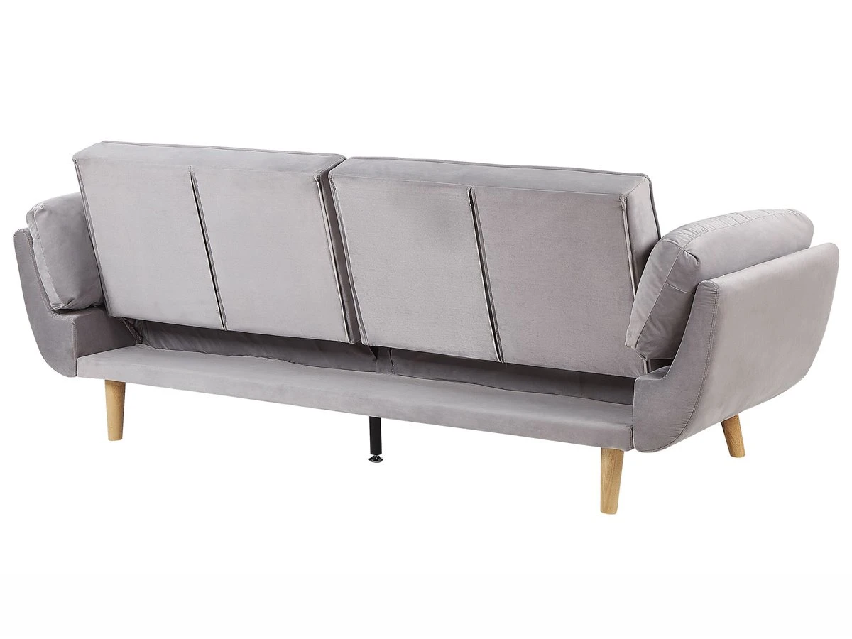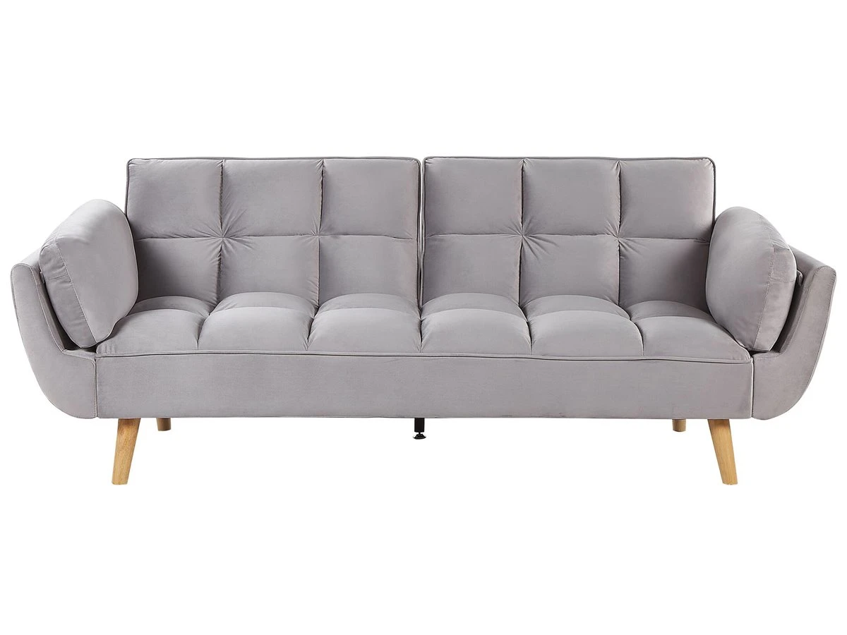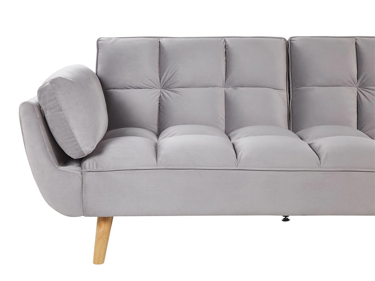 Sofá cama de terciopelo. Este sofá cama llama la atención por su diseño clásico combinado con formas retro. Está fabricado a partir de terciopelo suave al tacto. El acolchado del asiento y del respaldo resalta el brillo del material. El relleno de espuma y los cojines de los reposabrazos garantizan la máxima comodidad. Fácilmente convertible en cama. Detalles: Tipo de Producto: Sofá cama Estilo: Retro Color: Gris Tonalidad: Gris claro Tipo de material: Poliéster aterciopelado Material principal: Terciopelo Material adicional: Madera de eucalipto Material del relleno: Espuma Composición del Material: 100% Poliéster Estilo del apoyabrazo: Estrecho Apoyabrazo: Sí Parte posterior tapizada: Sí Protectores para patas: Sí Reclinable: No Fundas de cojín extraíble: Sí Construcción del asiento: Bandas elásticas Densidad de espuma del asiento: 50 kg/m3 Asientos para: 3 personas Función para dormir: Sí Mecanismo de abertura del sofa cama: Mecanismo click-clack Almacenamiento: No Dimensiones: Altura del apoyabrazos: 60 cm Profundidad: 83 cm Espesor del asiento: 17 cm Altura del asiento: 35 cm Ancho: 218 cm Altura: 82 cm Superficie del asiento: 168×52 cm Superficie para dormir: 185×107 cm Peso: 49 kg Capacidad de peso por persona: 120 kg La oferta incluye: 1 x Sofá Ventajas: Se convierte en cómoda cama, Brinda sensaciones de relax, El grueso acolchado del asiento brinda comodidad, Combina con todo tipo de decoración, Combinación perfecta de colores y materiales, Cojines extraíbles para un fácil mantenimiento, Completamente tapizado, Patas con tapas antideslizantes de seguridad Información de montaje: Requiere montaje completo. 5-15 min. Información adicional: Tenga en cuenta que la tela de terciopelo puede verse un poco diferente cuando se expone a una iluminación diferente: tiende a brillar más a la luz del día y parece más atenuada en la iluminación artificial interior. Debido a la estructura suave de alta densidad, el tono de la tela de terciopelo también puede variar cuando se pasa la mano en diferentes direcciones y ángulos. Para igualar el color y eliminar las arrugas, el material debe limpiarse con la palma de mano abierta en una dirección, limpiarse con un paño húmedo o una plancha con vapor. Consejos de mantenimiento: Terciopelo: 1.Aspire con un accesorio adecuado 2.Limpiar con champú seco y una esponja húmeda o un limpiador suave.
