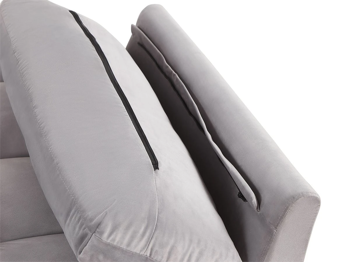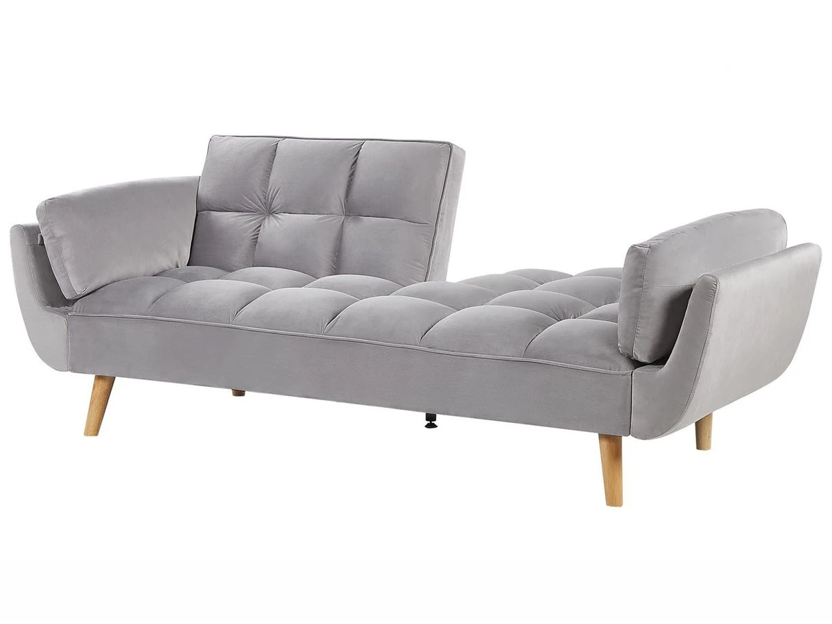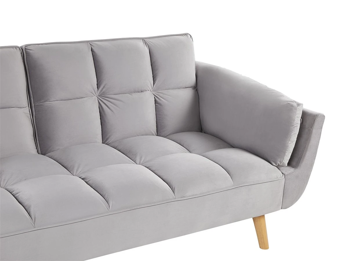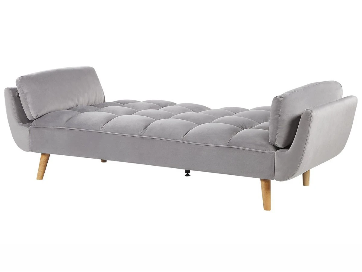 Sofá cama de terciopelo. Este sofá cama llama la atención por su diseño clásico combinado con formas retro. Está fabricado a partir de terciopelo suave al tacto. El acolchado del asiento y del respaldo resalta el brillo del material. El relleno de espuma y los cojines de los reposabrazos garantizan la máxima comodidad. Fácilmente convertible en cama. Detalles: Tipo de Producto: Sofá cama Estilo: Retro Color: Gris Tonalidad: Gris claro Tipo de material: Poliéster aterciopelado Material principal: Terciopelo Material adicional: Madera de eucalipto Material del relleno: Espuma Composición del Material: 100% Poliéster Estilo del apoyabrazo: Estrecho Apoyabrazo: Sí Parte posterior tapizada: Sí Protectores para patas: Sí Reclinable: No Fundas de cojín extraíble: Sí Construcción del asiento: Bandas elásticas Densidad de espuma del asiento: 50 kg/m3 Asientos para: 3 personas Función para dormir: Sí Mecanismo de abertura del sofa cama: Mecanismo click-clack Almacenamiento: No Dimensiones: Altura del apoyabrazos: 60 cm Profundidad: 83 cm Espesor del asiento: 17 cm Altura del asiento: 35 cm Ancho: 218 cm Altura: 82 cm Superficie del asiento: 168×52 cm Superficie para dormir: 185×107 cm Peso: 49 kg Capacidad de peso por persona: 120 kg La oferta incluye: 1 x Sofá Ventajas: Se convierte en cómoda cama, Brinda sensaciones de relax, El grueso acolchado del asiento brinda comodidad, Combina con todo tipo de decoración, Combinación perfecta de colores y materiales, Cojines extraíbles para un fácil mantenimiento, Completamente tapizado, Patas con tapas antideslizantes de seguridad Información de montaje: Requiere montaje completo. 5-15 min. Información adicional: Tenga en cuenta que la tela de terciopelo puede verse un poco diferente cuando se expone a una iluminación diferente: tiende a brillar más a la luz del día y parece más atenuada en la iluminación artificial interior. Debido a la estructura suave de alta densidad, el tono de la tela de terciopelo también puede variar cuando se pasa la mano en diferentes direcciones y ángulos. Para igualar el color y eliminar las arrugas, el material debe limpiarse con la palma de mano abierta en una dirección, limpiarse con un paño húmedo o una plancha con vapor. Consejos de mantenimiento: Terciopelo: 1.Aspire con un accesorio adecuado 2.Limpiar con champú seco y una esponja húmeda o un limpiador suave.