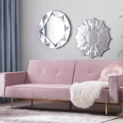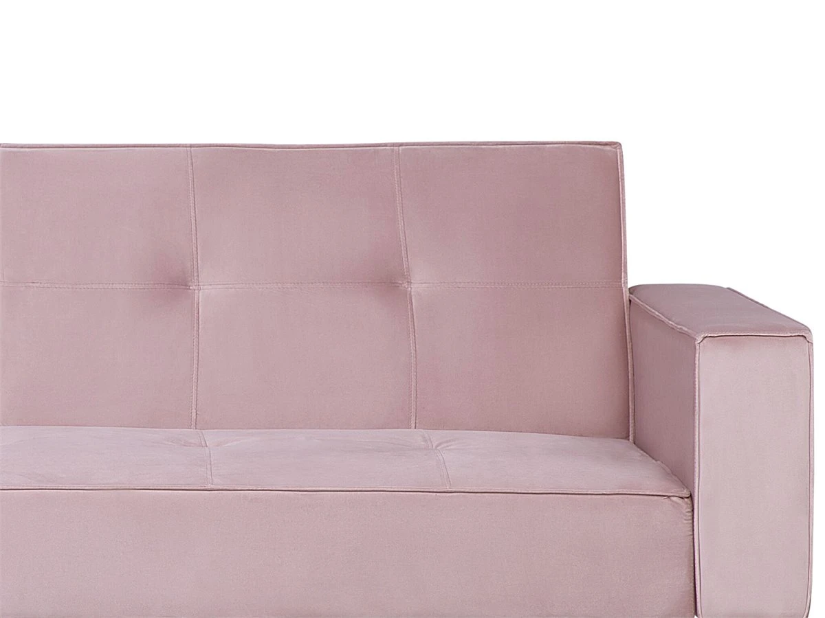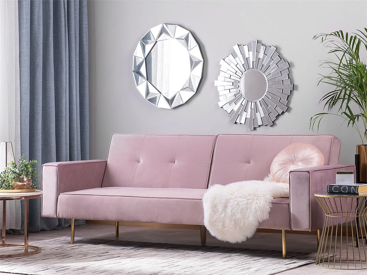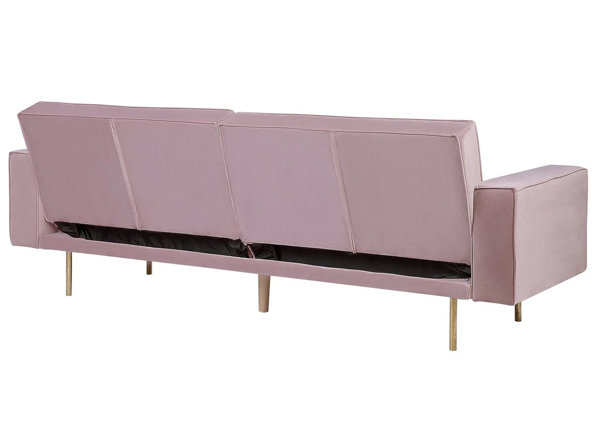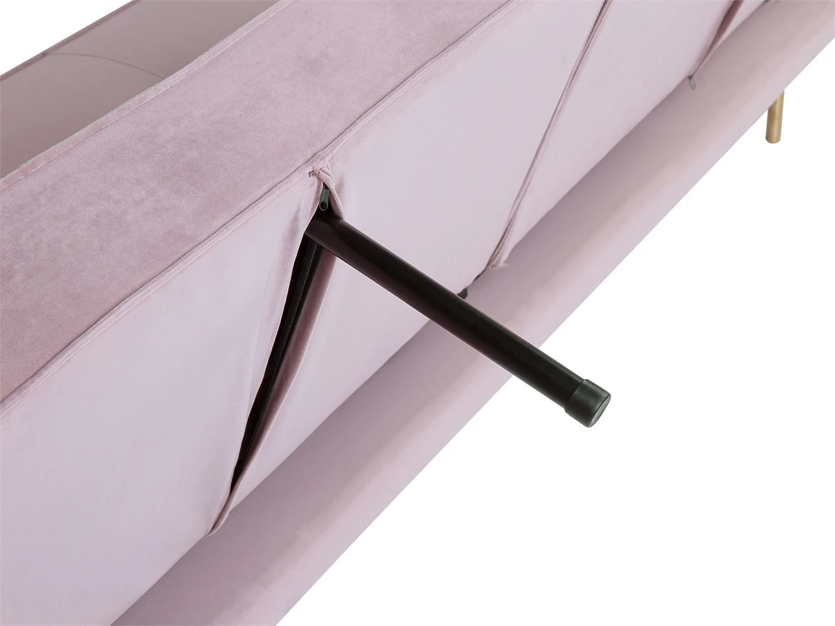 Sofá cama de terciopelo. Este sofá cama combina bien con cualquier sala de estar de estilo moderno, minimalista o glamuroso. Está fabricado a partir de tela de terciopelo de alta calidad. La construcción de madera y el acolchado de espuma ofrecen la máxima comodidad. Los motivos decorativos y las patas de metal brillante proporcionan un toque de glamour que contrasta con su diseño clásico. Fácilmente convertible en cama. Detalles: Tipo de Producto: Sofá de 3 plazas Estilo: Moderno Color: Rosa Tipo de material: Poliéster aterciopelado Material principal: Terciopelo Material adicional: Metal Material del relleno: Espuma Composición del Material: 100% Poliéster Estilo del apoyabrazo: Estrecho Parte posterior tapizada: No Protectores para patas: Sí Reclinable: No Fundas de cojín extraíble: No Construcción del asiento: Muelles ondulados Densidad de espuma del asiento: 50 kg/m3 Asientos para: 3 personas Función para dormir: Sí Mecanismo de abertura del sofa cama: Mecanismo click-clack Almacenamiento: No Dimensiones: Altura del apoyabrazos: 59 cm Profundidad: 81 cm Espesor del asiento: 17 cm Altura del asiento: 37 cm Ancho: 218 cm Altura: 80 cm Superficie del asiento: 188×56 cm Superficie para dormir: 188×107 cm Peso: 42 kg Capacidad de peso por persona: 150 kg La oferta incluye: 1 x Sofá Ventajas: Se convierte en cómoda cama, Diseño elegante, Tejido aterciopelado suave como la seda, Alta calidad, Completamente tapizado Información de montaje: Requiere montaje completo. 20-40 min. Información adicional: Tenga en cuenta que la tela de terciopelo puede verse un poco diferente cuando se expone a una iluminación diferente: tiende a brillar más a la luz del día y parece más atenuada en la iluminación artificial interior. Debido a la estructura suave de alta densidad, el tono de la tela de terciopelo también puede variar cuando se pasa la mano en diferentes direcciones y ángulos. Para igualar el color y eliminar las arrugas, el material debe limpiarse con la palma de mano abierta en una dirección, limpiarse con un paño húmedo o una plancha con vapor. Consejos de mantenimiento: Terciopelo: 1.Limpiar con champú seco y una esponja húmeda o un limpiador suave 2.Aspire con un accesorio adecuado. Metal: 1.Para evitar arañazos, no use limpiadores abrasivos 2.Limpie con un limpiador y un paño suave, seque después 3.Para elementos de cobre o cromados, use agente abrillantador.