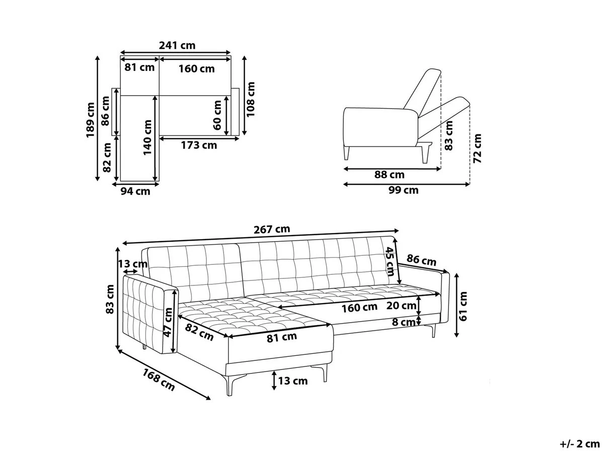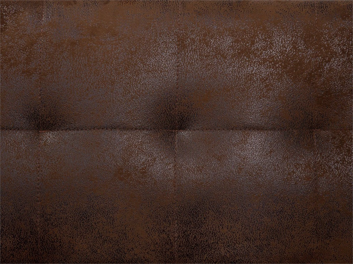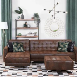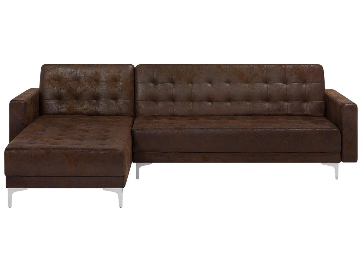 Sofá cama rinconero en color marrón. Añade a tu sala de estar este sofá cama de alta calidad. El acabado se adapta a cualquier esquema de color. Las patas de metal ofrecen la máxima estabilidad. Fácilmente convertible en cama gracias a su respaldo regulable. Detalles: Tipo de Producto: Sofá esquinero Estilo: Retro Color: Marrón Tonalidad: Marrón oscuro Tipo de material: Piel sintética Material principal: Piel sintética Material adicional: Metal Material del relleno: Espuma Composición del Material: 100% Poliéster Forma: Forma de L Estilo del apoyabrazo: Estrecho Parte posterior tapizada: Sí Protectores para patas: Sí Piezas modulares: No Orientación: Derecha Reclinable: No Fundas de cojín extraíble: No Construcción del asiento: Muelles ondulados Densidad de espuma del asiento: 50 kg/m3 Asientos para: 4 – 6 personas Función para dormir: Sí Mecanismo de abertura del sofa cama: Mecanismo click-clack Almacenamiento: No Dimensiones: Altura del apoyabrazos: 61 cm Profundidad: 168 cm Espesor del asiento: 20 cm Altura del asiento: 41 cm Ancho: 267 cm Altura: 83 cm Superficie del asiento: 241×60 cm Superficie para dormir: 241×108 cm Peso: 77 kg Capacidad de peso por persona: 150 kg La oferta incluye: 1 x Sofá esquinero Ventajas: Se convierte en cómoda cama, Respaldo ajustable en 3 posiciones, Brinda comodidad y relajación, Confort del asiento óptimo, Diseño elegante, Con un clásico mechón decorativo, Acolchado de alta calidad Información de montaje: Requiere montaje parcial. 45-60 min. Información adicional: Para un uso seguro, debe haber un espacio de ~15 cm entre el respaldo y la pared. Consejos de mantenimiento: Piel sintética: 1.Limpie con agua destilada y use limpiadores a base de jabón en las manchas difíciles 2.Aspire con un accesorio adecuado 3.Una vez a la semana, limpie con un paño húmedo y seque después. No engrasar, 4.Use solo limpiadores suaves y acondicionadores dedicados a la piel sintética Metal: 1.Limpie con un limpiador y un paño suave, seque después 2.Para elementos de cobre o cromados, use agente abrillantador 3.Para evitar arañazos, no use limpiadores abrasivos.