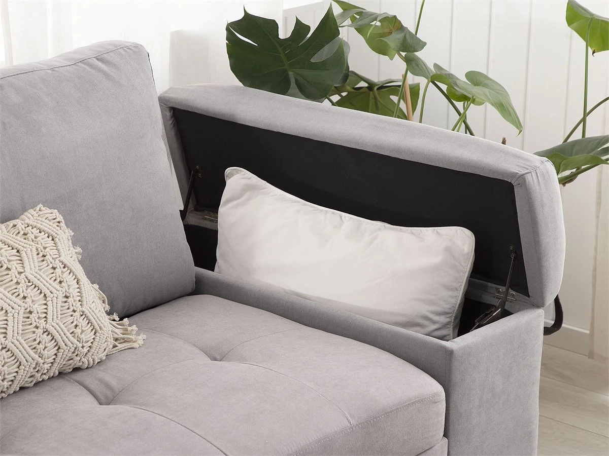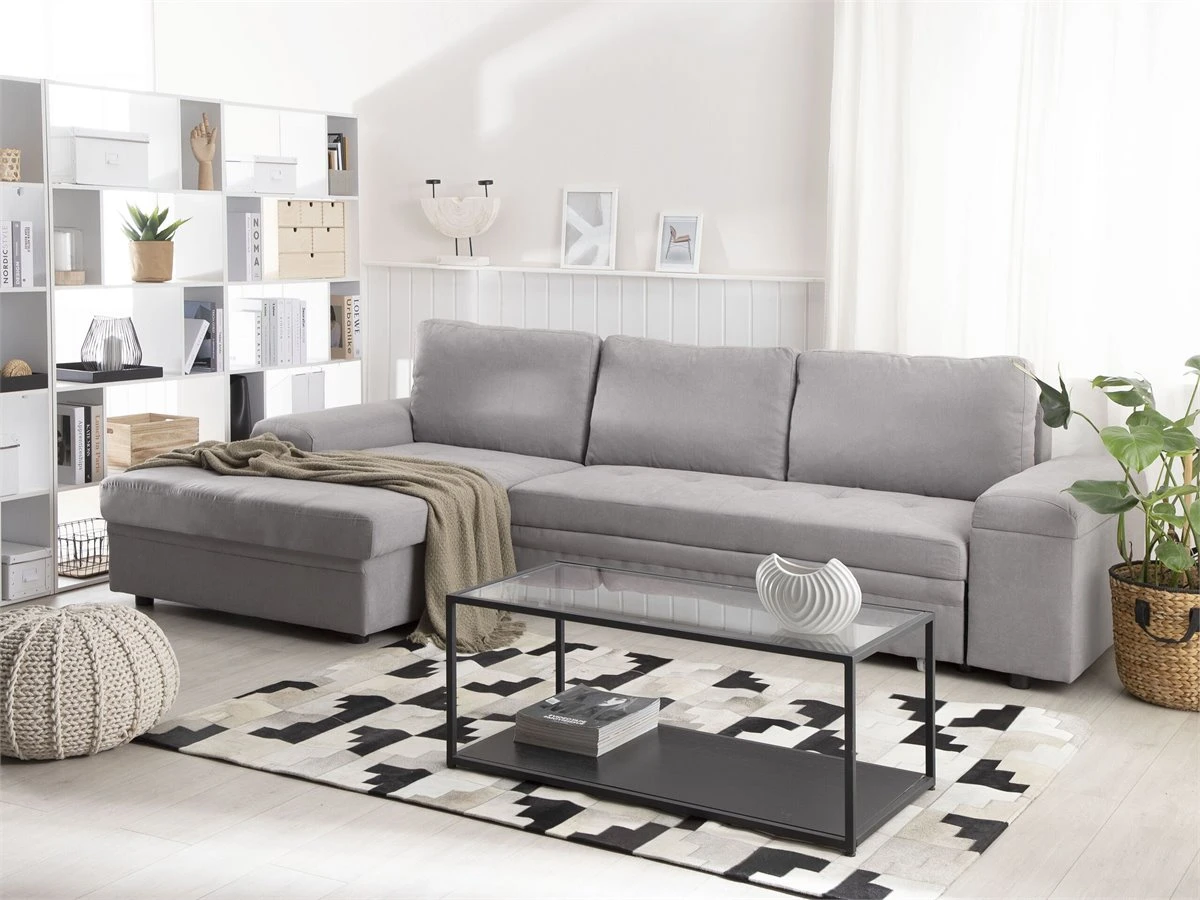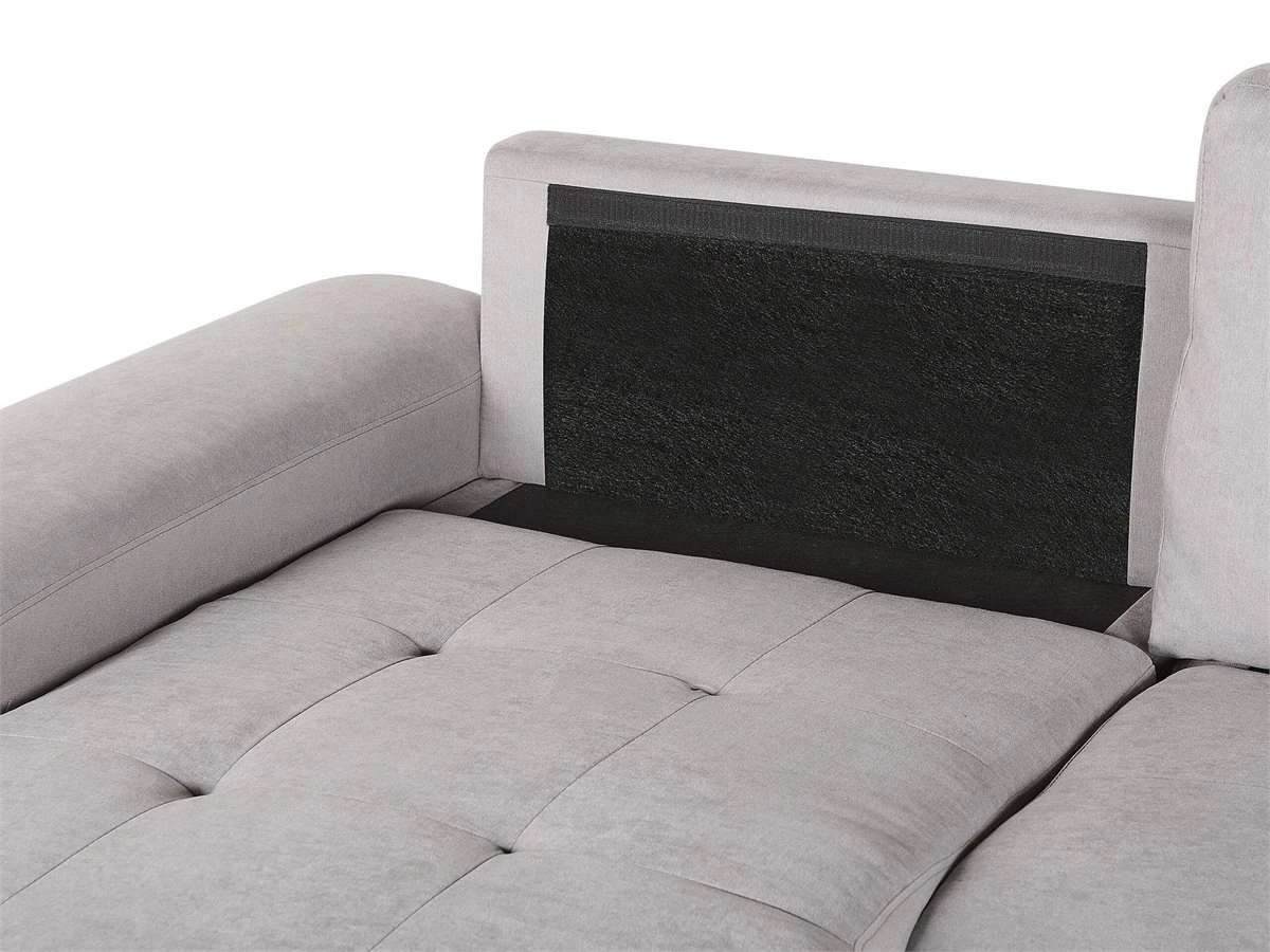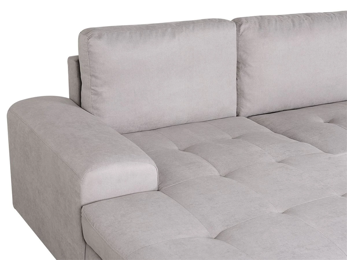Cómodo sofá cama escandinavo con almacenamiento. Añade a tu sala de estar este sofá cama moderno, cómodo y versátil. Está fabricado a partir de tela de poliéster de alta calidad. La estructura de madera proporciona durabilidad. Los cojines de acolchado grueso ofrecen la máxima comodidad y vienen con fundas extraíbles. La pieza incluye un espacio de almacenaje debajo de los reposabrazos en donde guardar las sábanas y los edredones. Fácilmente convertible en cama. Detalles: Tipo de Producto: Sofá esquinero Estilo: Moderno Color: Gris Tonalidad: Gris claro Tipo de material: Tejido Material principal: Poliéster Material adicional: Material sintético Material del relleno: Espuma Composición del Material: 100% Poliéster Estilo del apoyabrazo: Estrecho Apoyabrazo: Sí Parte posterior tapizada: Sí Protectores para patas: No Piezas modulares: No Orientación: Derecha Reclinable: No Fundas de cojín extraíble: Sí Construcción del asiento: Bandas elásticas Densidad de espuma del asiento: 24 kg/m3 Asientos para: 3 personas Función para dormir: Sí Mecanismo de abertura del sofa cama: Tracción Almacenamiento: Sí Dimensiones: Altura del apoyabrazos: 60 cm Profundidad: 161 cm Espesor del asiento: 18 cm Altura del asiento: 45 cm Ancho: 293 cm Altura: 90 cm Superficie del asiento: 233×161 cm Superficie para dormir: 263×161 cm Peso: 122 kg Capacidad de peso por persona: 150 kg La oferta incluye: 1 x Sofá, 3 x Cojín del respaldo Ventajas: Práctico compartimento de almacenamiento en el reposabrazos, Se convierte en cómoda cama, Brinda sensaciones de relax, Combina con cualquier estilo de interior, Fabricación sólida y precisa, Detalles perfectos, Completamente tapizado, Fundas extraíbles Información de montaje: Requiere montaje parcial. 20-40 min. Consejos de mantenimiento: Poliéster: 1.Aspire con un accesorio adecuado 2.Limpiar con champú seco y una esponja húmeda o un limpiador suave. Material sintético: 1.Limpie con un limpiador y un paño suave, seque después.