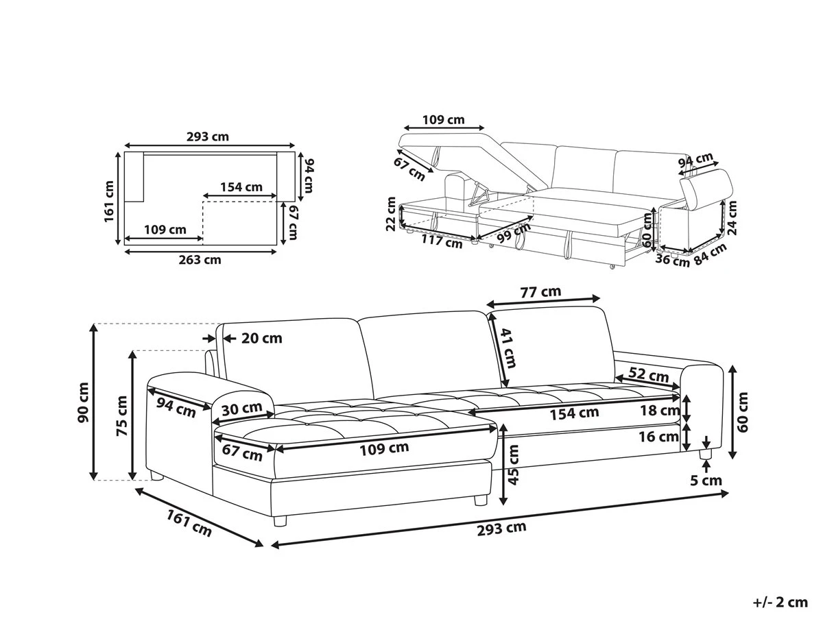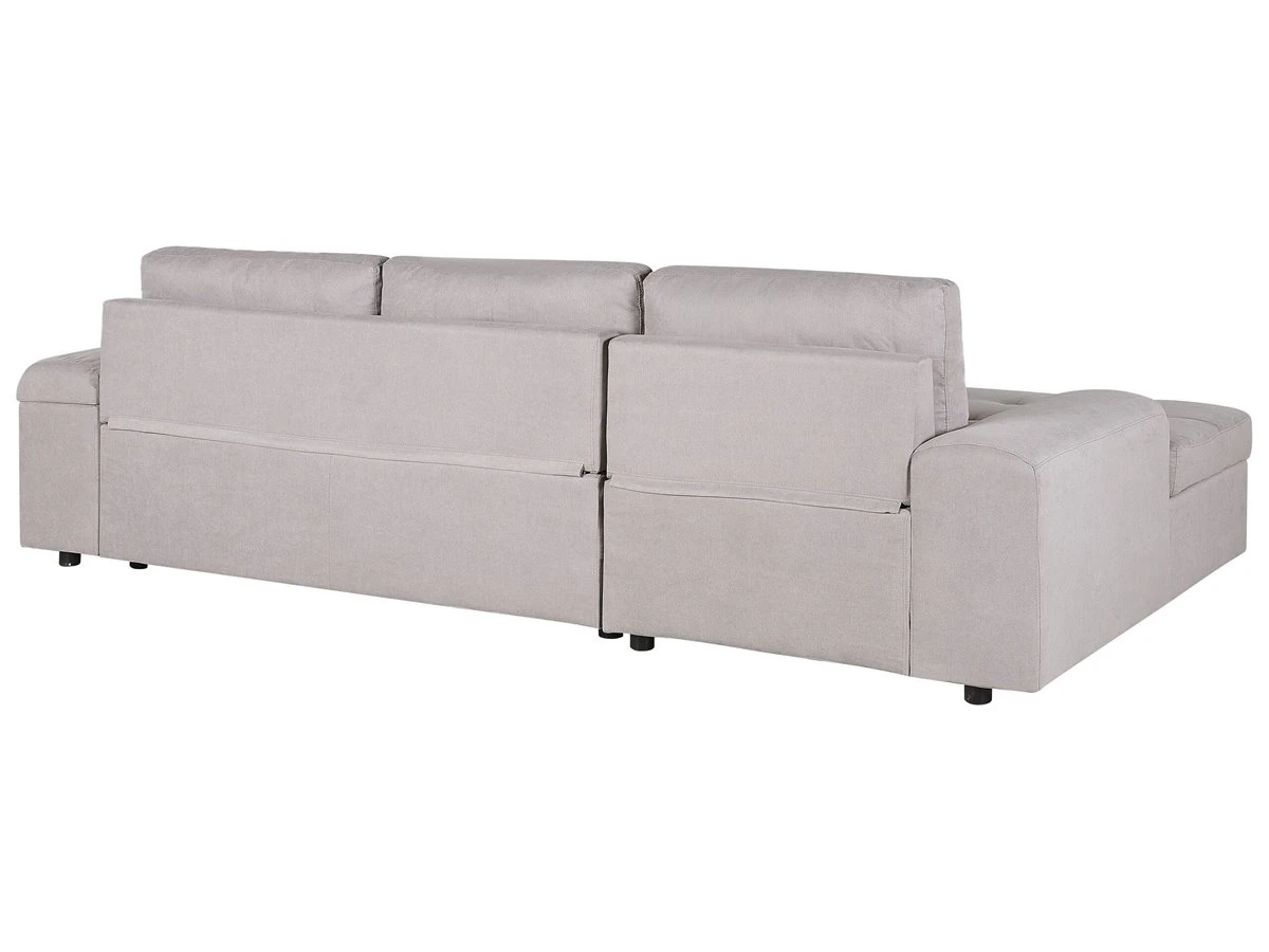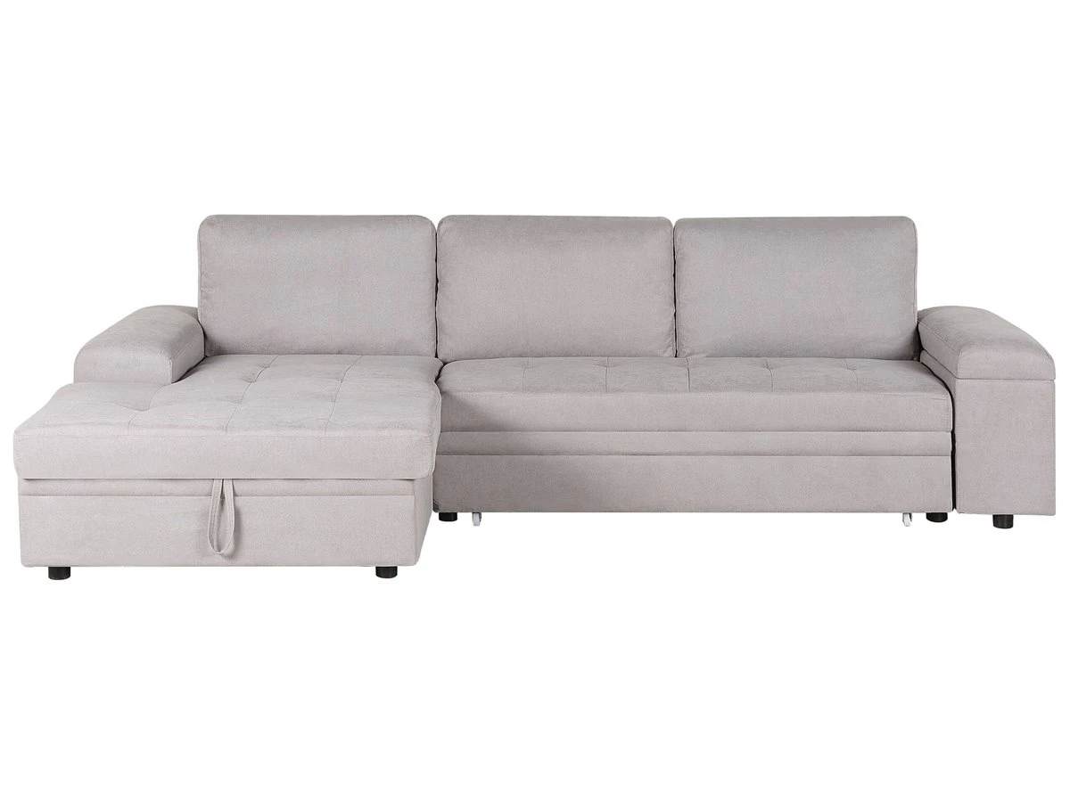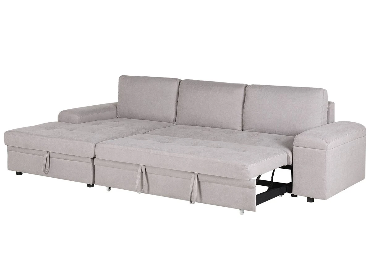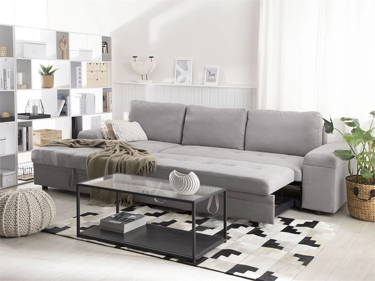 Cómodo sofá cama escandinavo con almacenamiento. Añade a tu sala de estar este sofá cama moderno, cómodo y versátil. Está fabricado a partir de tela de poliéster de alta calidad. La estructura de madera proporciona durabilidad. Los cojines de acolchado grueso ofrecen la máxima comodidad y vienen con fundas extraíbles. La pieza incluye un espacio de almacenaje debajo de los reposabrazos en donde guardar las sábanas y los edredones. Fácilmente convertible en cama. Detalles: Tipo de Producto: Sofá esquinero Estilo: Moderno Color: Gris Tonalidad: Gris claro Tipo de material: Tejido Material principal: Poliéster Material adicional: Material sintético Material del relleno: Espuma Composición del Material: 100% Poliéster Estilo del apoyabrazo: Estrecho Apoyabrazo: Sí Parte posterior tapizada: Sí Protectores para patas: No Piezas modulares: No Orientación: Derecha Reclinable: No Fundas de cojín extraíble: Sí Construcción del asiento: Bandas elásticas Densidad de espuma del asiento: 24 kg/m3 Asientos para: 3 personas Función para dormir: Sí Mecanismo de abertura del sofa cama: Tracción Almacenamiento: Sí Dimensiones: Altura del apoyabrazos: 60 cm Profundidad: 161 cm Espesor del asiento: 18 cm Altura del asiento: 45 cm Ancho: 293 cm Altura: 90 cm Superficie del asiento: 233×161 cm Superficie para dormir: 263×161 cm Peso: 122 kg Capacidad de peso por persona: 150 kg La oferta incluye: 1 x Sofá, 3 x Cojín del respaldo Ventajas: Práctico compartimento de almacenamiento en el reposabrazos, Se convierte en cómoda cama, Brinda sensaciones de relax, Combina con cualquier estilo de interior, Fabricación sólida y precisa, Detalles perfectos, Completamente tapizado, Fundas extraíbles Información de montaje: Requiere montaje parcial. 20-40 min. Consejos de mantenimiento: Poliéster: 1.Aspire con un accesorio adecuado 2.Limpiar con champú seco y una esponja húmeda o un limpiador suave. Material sintético: 1.Limpie con un limpiador y un paño suave, seque después.