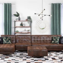 Sofá cama modular. Añade a tu sala de estar este sofá cama esquinero de alta calidad. El acabado se adapta a cualquier esquema de color. Las patas de metal ofrecen la máxima estabilidad. Fácilmente convertible en cama gracias a su respaldo regulable. Detalles: Tipo de Producto: Sofá cama Estilo: Moderno Color: Marrón Tonalidad: Marrón oscuro Tipo de material: Piel sintética Material principal: Piel sintética Material adicional: Metal Material del relleno: Espuma Composición del Material: 100% Poliéster Forma: Forma de L Estilo del apoyabrazo: Estrecho Parte posterior tapizada: Sí Protectores para patas: Sí Piezas modulares: Sí Orientación: Derecha Reclinable: No Fundas de cojín extraíble: No Construcción del asiento: Muelles ondulados Densidad de espuma del asiento: 50 kg/m3 Asientos para: 4 – 6 personas Función para dormir: Sí Mecanismo de abertura del sofa cama: Mecanismo click-clack Almacenamiento: No Dimensiones: Altura del apoyabrazos: 61 cm Profundidad: 168 cm Espesor del asiento: 20 cm Altura del asiento: 41 cm Ancho: 347 cm Altura: 83 cm Superficie del asiento: 321×60 cm Superficie para dormir: 321×108 cm Peso: 98 kg Capacidad de peso por persona: 150 kg La oferta incluye: 1 x Sofá de 3 plazas, 1 x Chaise longue, 1 x Módulo central Ventajas: Se convierte en cómoda cama, Se puede combinar con otros elementos modulares de la colección, Respaldo ajustable en 3 posiciones, Brinda comodidad y relajación, Confort del asiento óptimo, Diseño elegante, Con un clásico mechón decorativo, Tapicería de piel sintética de alta calidad para un aspecto natural Información de montaje: Requiere montaje parcial. 45-60 min. Información adicional: Para un uso seguro, debe haber un espacio de ~15 cm entre el respaldo y la pared. Consejos de mantenimiento: Piel sintética: 1.Use solo limpiadores suaves y acondicionadores dedicados a la piel sintética, 2.Limpie con agua destilada y use limpiadores a base de jabón en las manchas difíciles 3.Aspire con un accesorio adecuado 4.Una vez a la semana, limpie con un paño húmedo y seque después. No engrasar Metal: 1.Para elementos de cobre o cromados, use agente abrillantador 2.Para evitar arañazos, no use limpiadores abrasivos 3.Limpie con un limpiador y un paño suave, seque después.