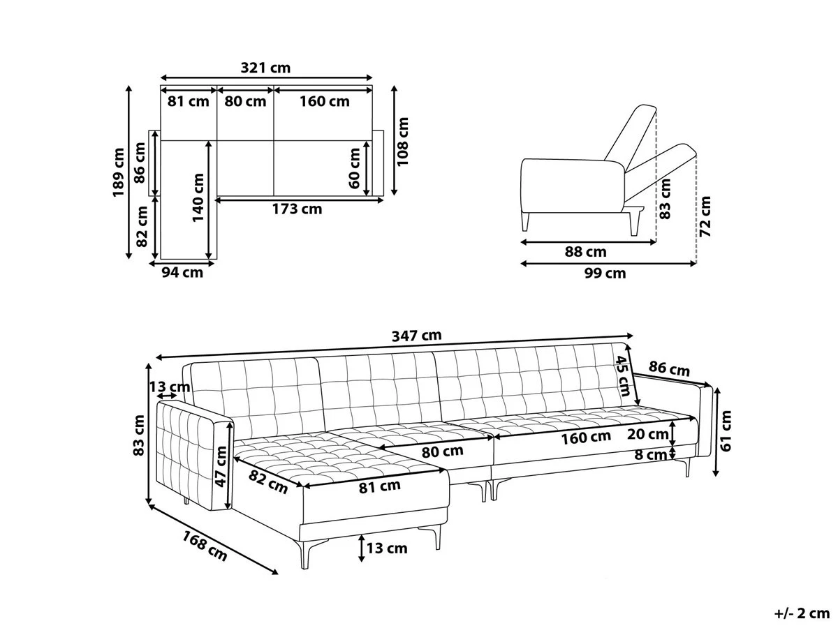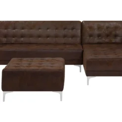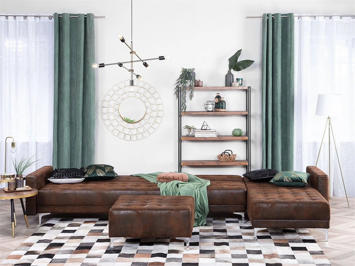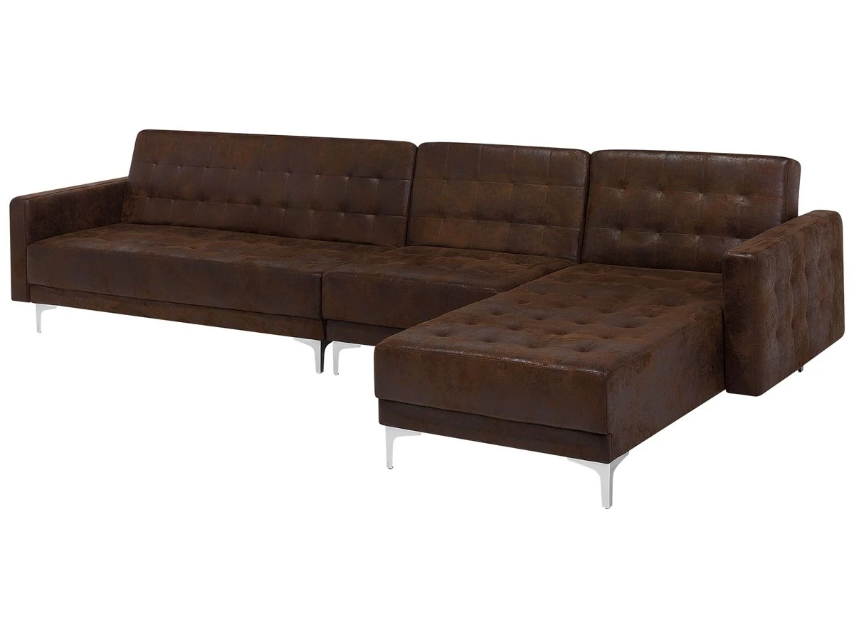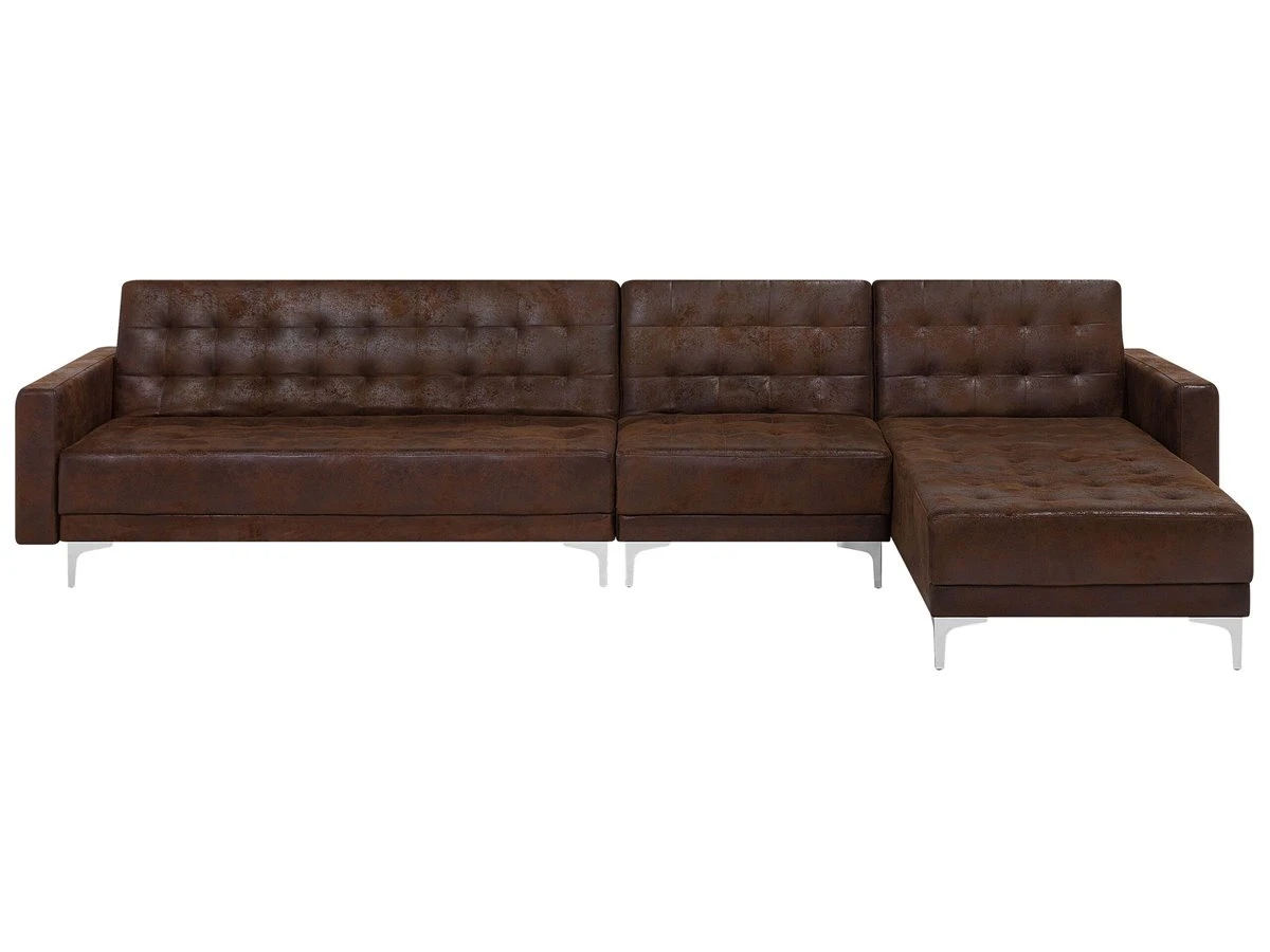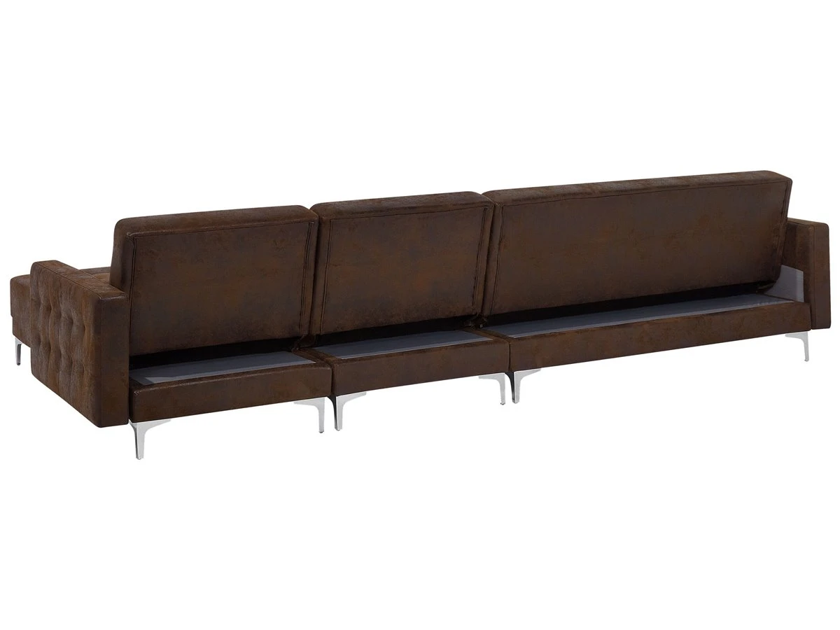 Sofá cama modular. Añade a tu sala de estar este sofá cama esquinero de alta calidad. El acabado se adapta a cualquier esquema de color. Las patas de metal ofrecen la máxima estabilidad. Fácilmente convertible en cama gracias a su respaldo regulable. Detalles: Tipo de Producto: Sofá cama Estilo: Moderno Color: Marrón Tonalidad: Marrón oscuro Tipo de material: Piel sintética Material principal: Piel sintética Material adicional: Metal Material del relleno: Espuma Composición del Material: 100% Poliéster Forma: Forma de L Estilo del apoyabrazo: Estrecho Parte posterior tapizada: Sí Protectores para patas: Sí Piezas modulares: Sí Orientación: Izquierda Reclinable: No Fundas de cojín extraíble: No Construcción del asiento: Muelles ondulados Densidad de espuma del asiento: 50 kg/m3 Asientos para: 4 – 6 personas Función para dormir: Sí Mecanismo de abertura del sofa cama: Mecanismo click-clack Almacenamiento: No Dimensiones: Altura del apoyabrazos: 61 cm Profundidad: 168 cm Espesor del asiento: 20 cm Altura del asiento: 41 cm Ancho: 347 cm Altura: 83 cm Superficie del asiento: 321×60 cm Superficie para dormir: 321×108 cm Peso: 98 kg Capacidad de peso por persona: 150 kg La oferta incluye: 1 x Sofá de 3 plazas, 1 x Chaise longue, 1 x Módulo central Ventajas: Se convierte en cómoda cama, Se puede combinar con otros elementos modulares de la colección, Respaldo ajustable en 3 posiciones, Brinda comodidad y relajación, Confort del asiento óptimo, Diseño elegante, Con un clásico mechón decorativo, Tapicería de piel sintética de alta calidad para un aspecto natural Información de montaje: Requiere montaje parcial. 45-60 min. Información adicional: Para un uso seguro, debe haber un espacio de ~15 cm entre el respaldo y la pared. Consejos de mantenimiento: Piel sintética: 1.Use solo limpiadores suaves y acondicionadores dedicados a la piel sintética, 2.Limpie con agua destilada y use limpiadores a base de jabón en las manchas difíciles 3.Aspire con un accesorio adecuado 4.Una vez a la semana, limpie con un paño húmedo y seque después. No engrasar Metal: 1.Para elementos de cobre o cromados, use agente abrillantador 2.Para evitar arañazos, no use limpiadores abrasivos 3.Limpie con un limpiador y un paño suave, seque después.