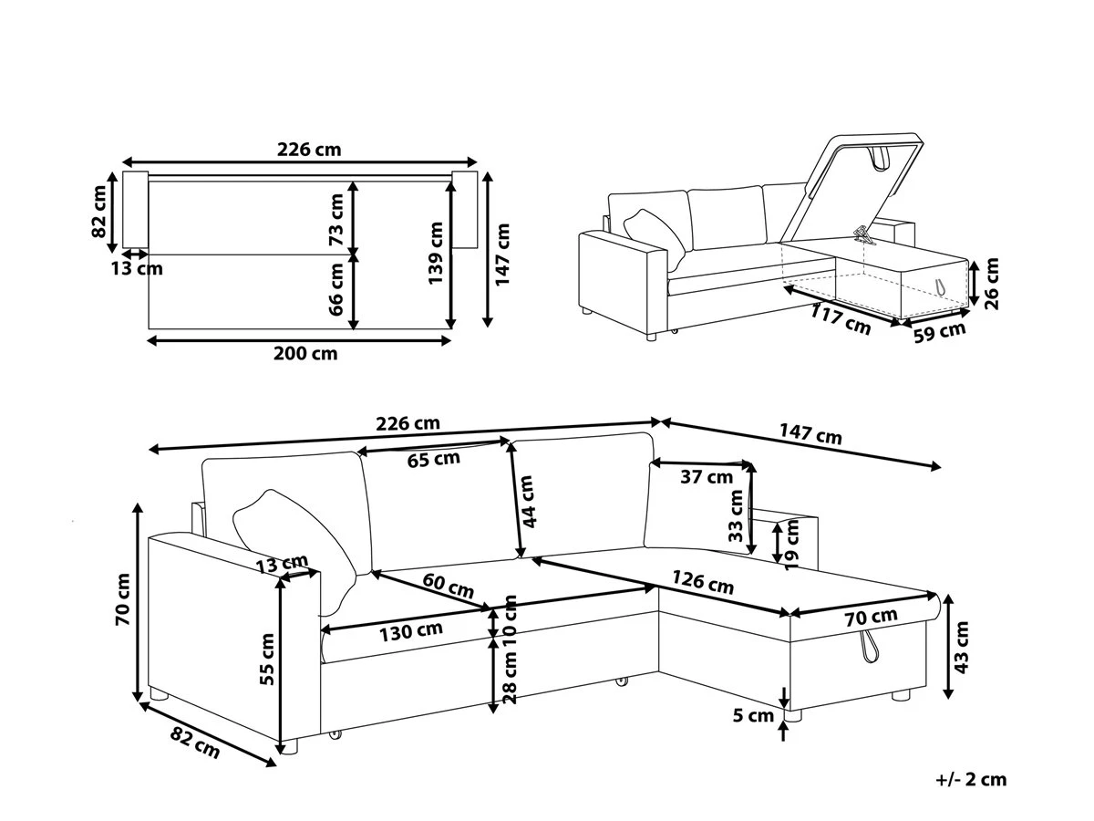 Sofá cama multifuncional. Este sofá esquinero es ideal para cualquier interior de dimensiones reducidas. Está fabricado a partir de poliéster de alta calidad. Los cojines adicionales vienen con fundas extraíbles. Las patas de madera maciza garantizan estabilidad. Incluye un espacio de almacenaje para guardar las sábanas y los edredones. Fácilmente convertible en cama. Detalles: Tipo de Producto: Sofá esquinero Estilo: Moderno Color: Marrón Tonalidad: Marrón claro Tipo de material: Tejido Material principal: Poliéster Material adicional: Piel sintética Material del relleno: Espuma Forma: Forma de L Estilo del apoyabrazo: Estrecho Apoyabrazo: Sí Parte posterior tapizada: Sí Protectores para patas: Sí Piezas modulares: No Orientación: Izquierda Reclinable: No Fundas de cojín extraíble: Sí Construcción del asiento: Muelles ondulados Densidad de espuma del asiento: 50 kg/m3 Asientos para: 3 personas Función para dormir: Sí Mecanismo de abertura del sofa cama: Tracción Almacenamiento: Sí Dimensiones: Altura del apoyabrazos: 55 cm Profundidad: 147 cm Espesor del asiento: 10 cm Altura del asiento: 43 cm Ancho: 226 cm Altura: 70 cm Superficie del asiento: 200×126 cm Superficie para dormir: 200×139 cm Peso: 93 kg Capacidad de peso por persona: 150 kg La oferta incluye: 1 x Sofá esquinero, 2 x Almohada Ventajas: Se convierte en cómoda cama, Confort del asiento óptimo, Ideal para todo tipo de decoración, No requiere mantenimiento regular, Espacio de almacenaje adicional, Fundas extraíbles, Completamente tapizado Información de montaje: Requiere montaje completo. 20-40 min. Consejos de mantenimiento: Piel sintética: 1.Use solo limpiadores suaves y acondicionadores dedicados a la piel sintética, 2.Limpie con agua destilada y use limpiadores a base de jabón en las manchas difíciles 3.Aspire con un accesorio adecuado 4.Una vez a la semana, limpie con un paño húmedo y seque después. No engrasar Poliéster: 1.Aspire con un accesorio adecuado 2.Limpiar con champú seco y una esponja húmeda o un limpiador suave.