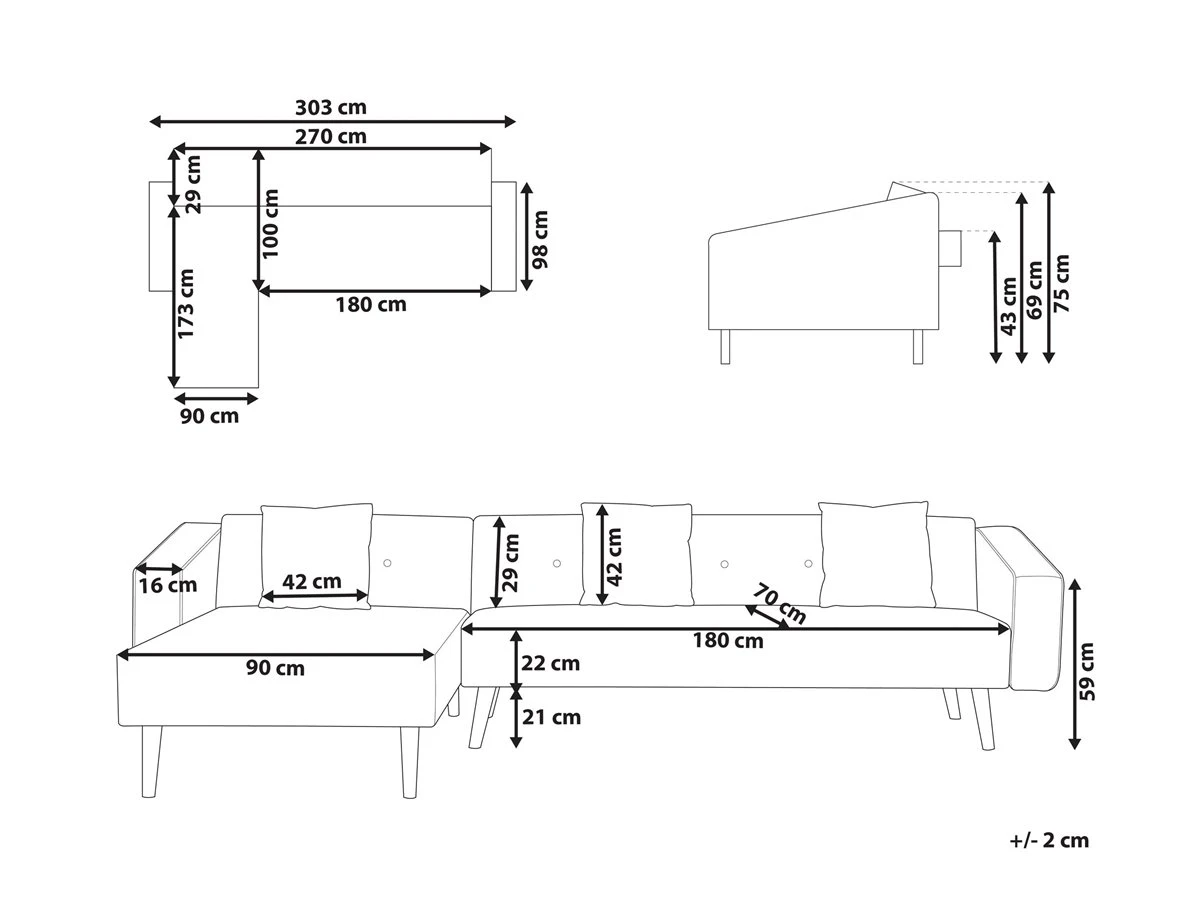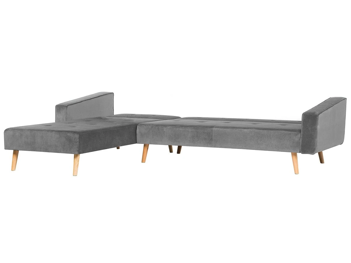 Sofá cama esquinero de terciopelo. Este sofá esquinero de diseño minimalista combina bien con cualquier sala de estar de estilo tradicional o contemporáneo. Está fabricado a partir de tela de terciopelo suave al tacto. Los botones decorativos y las patas de madera de acabado natural aportan un toque retro a la pieza. Los cojines adicionales ofrecen la máxima comodidad. Fácilmente convertible en cama gracias al mecanismo clic-clac incorporado. Detalles: Tipo de Producto: Sofá esquinero Estilo: Retro Color: Gris Tipo de material: Poliéster aterciopelado Material principal: Terciopelo Material adicional: Madera de eucalipto Material del relleno: Espuma Composición del Material: 100% Poliéster Forma: Forma de L Estilo del apoyabrazo: Estrecho Parte posterior tapizada: No Protectores para patas: Sí Piezas modulares: No Orientación: Derecha Reclinable: No Fundas de cojín extraíble: No Construcción del asiento: Muelles ondulados Densidad de espuma del asiento: 30 kg/m3 Asientos para: 4 – 6 personas Función para dormir: No Mecanismo de abertura del sofa cama: Mecanismo click-clack Almacenamiento: No Dimensiones: Altura del apoyabrazos: 59 cm Profundidad: 98 cm Espesor del asiento: 22 cm Altura del asiento: 43 cm Ancho: 303 cm Altura: 72 cm Superficie del asiento: 270×70 cm Superficie para dormir: 270×100 cm Peso: 81 kg Capacidad de peso por persona: 130 kg La oferta incluye: 1 x Sofá esquinero, 3 x Cojín Ventajas: Se convierte en cómoda cama, Estilo retro, Ideal para todo tipo de decoración, Tejido aterciopelado suave como la seda, Patas con tapas anti-deslizantes, Respaldo ajustable Información de montaje: Requiere montaje parcial. 20-40 min. Información adicional: Tenga en cuenta que la tela de terciopelo puede verse un poco diferente cuando se expone a una iluminación diferente: tiende a brillar más a la luz del día y parece más atenuada en la iluminación artificial interior. Debido a la estructura suave de alta densidad, el tono de la tela de terciopelo también puede variar cuando se pasa la mano en diferentes direcciones y ángulos. Para igualar el color y eliminar las arrugas, el material debe limpiarse con la palma de mano abierta en una dirección, limpiarse con un paño húmedo o una plancha con vapor. Consejos de mantenimiento: Terciopelo: 1.Aspire con un accesorio adecuado 2.Limpiar con champú seco y una esponja húmeda o un limpiador suave. Madera de eucalipto: 1.Los muebles con acabado de aceite deben engrasarse una vez al año, 2.Seque inmediatamente después de limpiar. para evitar que se acumule agua en los muebles 3.Limpie con un limpiador y un paño suave en la dirección del grano.