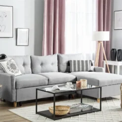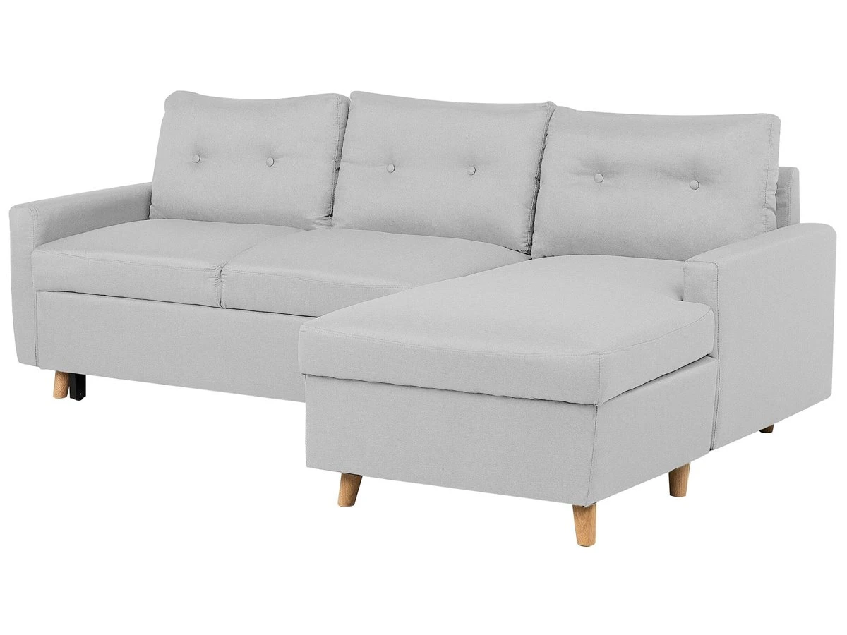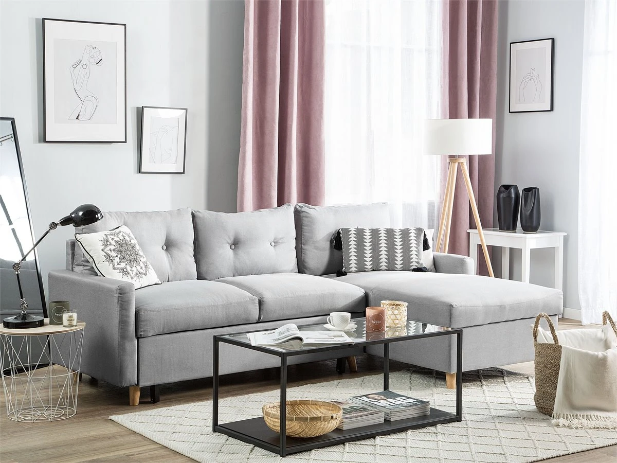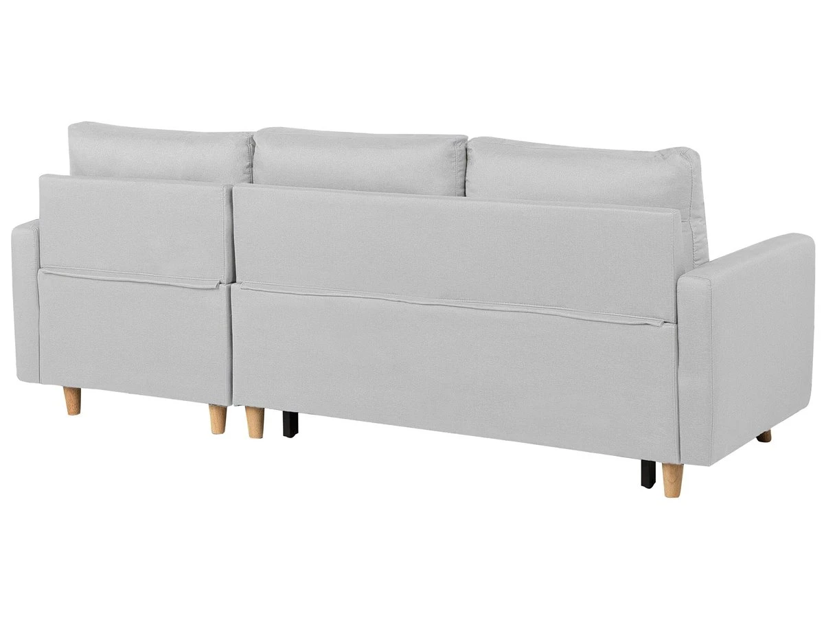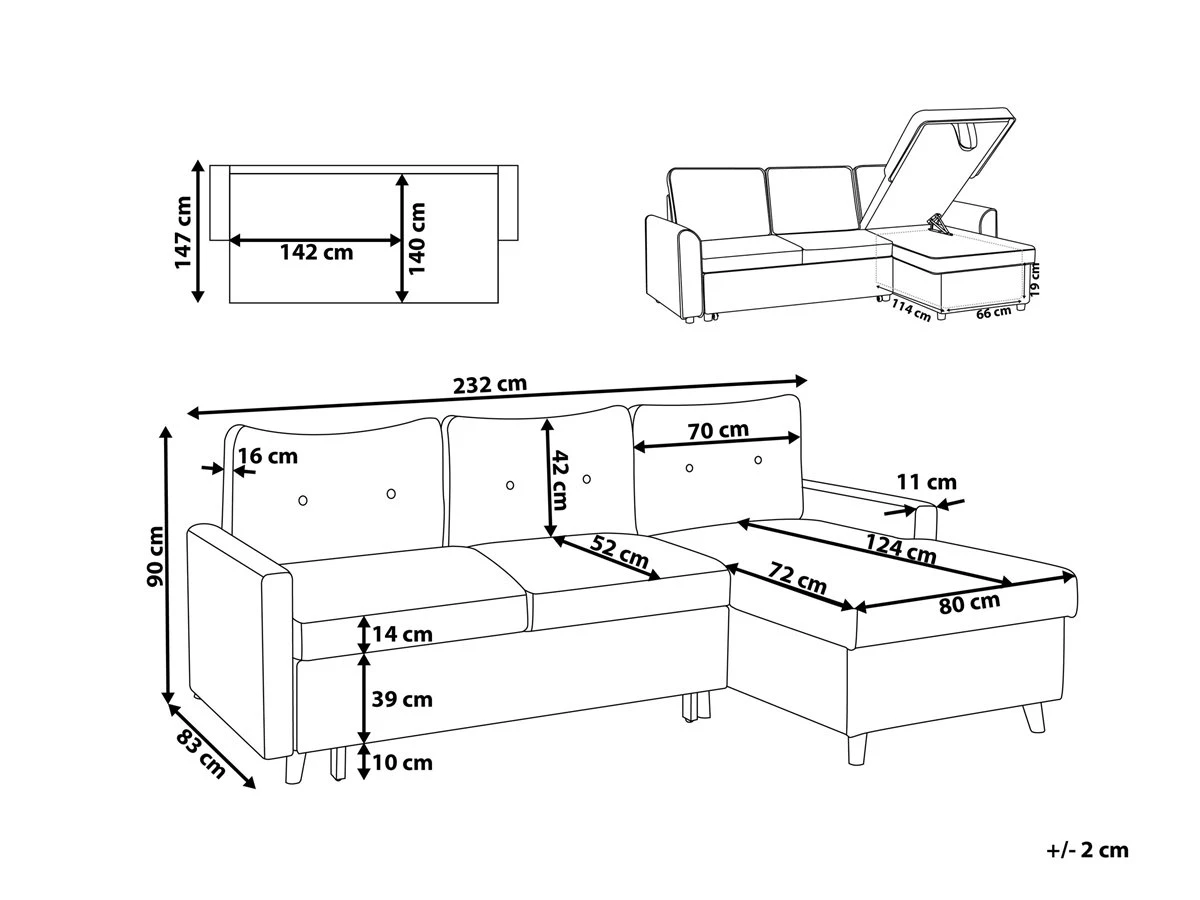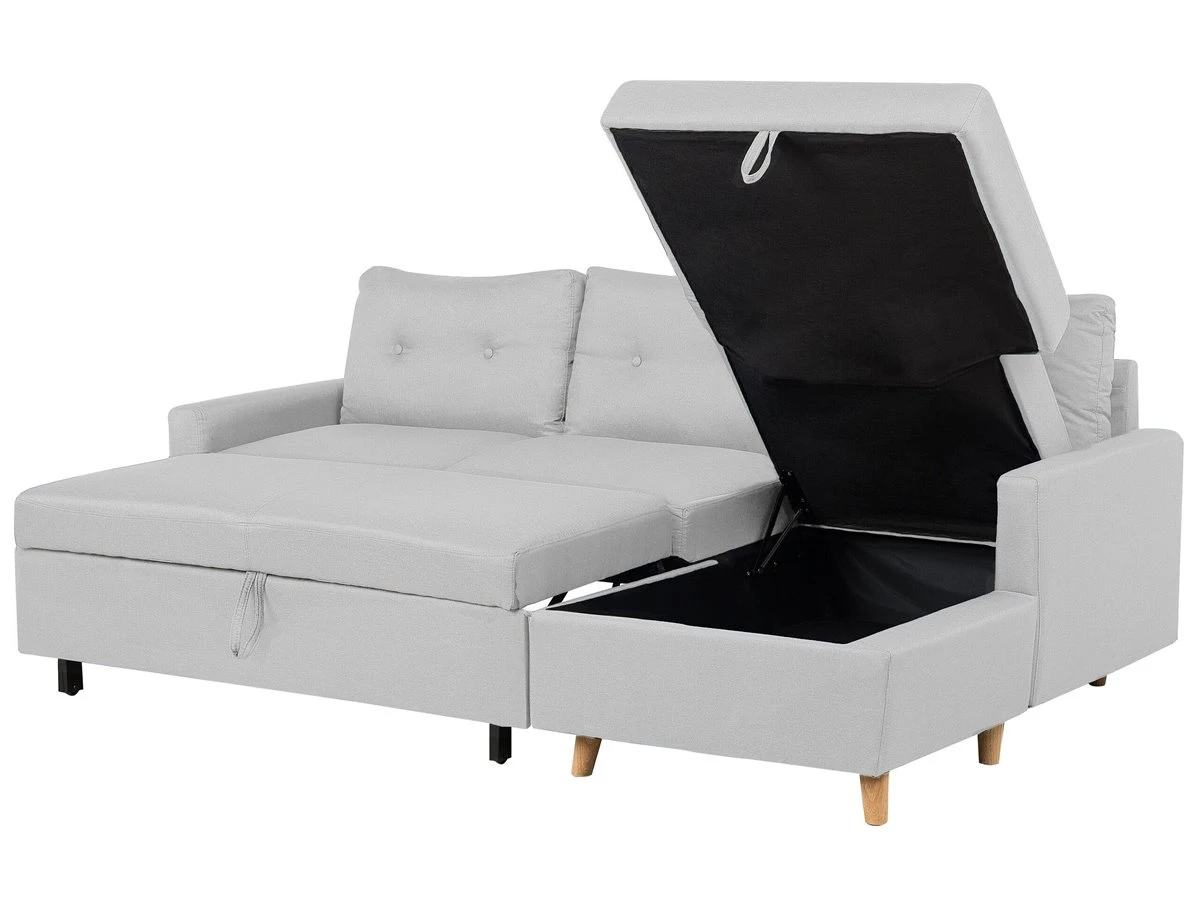 Sofá cama esquinero con almacenaje. Añade a tu sala de estar este sofá esquinero de diseño moderno. Ideal para descansar después de un largo día de trabajo, dar la bienvenida a tus invitados o ver la TV en compañía de tus seres queridos. Está fabricado a partir de poliéster resistente y suave al tacto. Las patas de inspiración escandinava ofrecen estabilidad. Incluye un espacio de almacenaje para guardar las sábanas y los edredones. Fácilmente convertible en cama. Detalles: Tipo de Producto: Sofá esquinero Estilo: Moderno Color: Gris Tonalidad: Gris claro Tipo de material: Tejido Material principal: Poliéster Material adicional: Madera de caucho Material del relleno: Espuma Composición del Material: 100% Poliéster Forma: Forma de L Estilo del apoyabrazo: Estrecho Parte posterior tapizada: Sí Protectores para patas: Sí Piezas modulares: No Orientación: Izquierda Reclinable: No Fundas de cojín extraíble: Sí Construcción del asiento: Muelles ondulados Densidad de espuma del asiento: 45 kg/m3 Asientos para: 4 – 6 personas Función para dormir: Sí Mecanismo de abertura del sofa cama: Tracción Almacenamiento: Sí Dimensiones: Altura del apoyabrazos: 75 cm Profundidad: 147 cm Espesor del asiento: 14 cm Altura del asiento: 53 cm Ancho: 232 cm Altura: 90 cm Superficie del asiento: 210×52 cm Superficie para dormir: 124×209 cm Peso: 95 kg Capacidad de peso por persona: 150 kg La oferta incluye: 1 x Sofá esquinero Ventajas: Se convierte en cómoda cama, Extremadamente cómodo, Espaciosa superficie para dormir, Diseño moderno, Acolchado de alta calidad, Espacio de almacenaje adicional Información de montaje: Requiere montaje completo. 45-60 min. Consejos de mantenimiento: Poliéster: 1.Aspire con un accesorio adecuado 2.Limpiar con champú seco y una esponja húmeda o un limpiador suave. Madera de caucho: 1.Los muebles con acabado de aceite deben engrasarse una vez al año, 2.Seque inmediatamente después de limpiar. para evitar que se acumule agua en los muebles 3.Limpie con un limpiador y un paño suave en la dirección del grano.