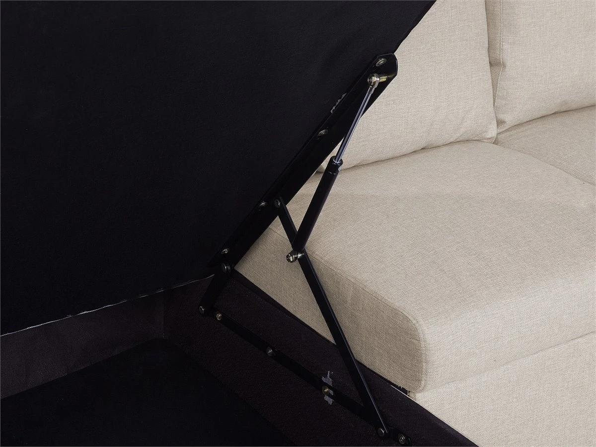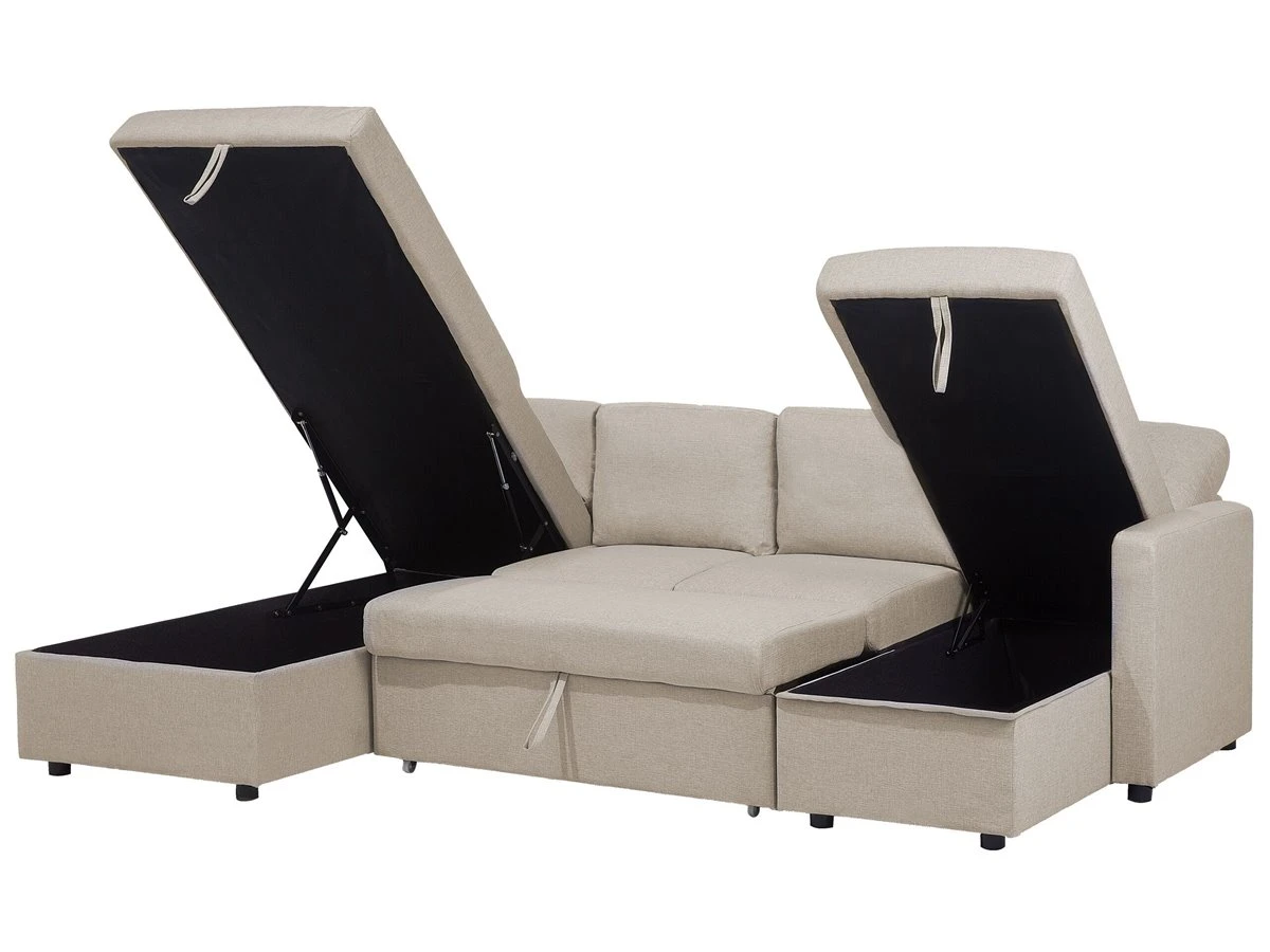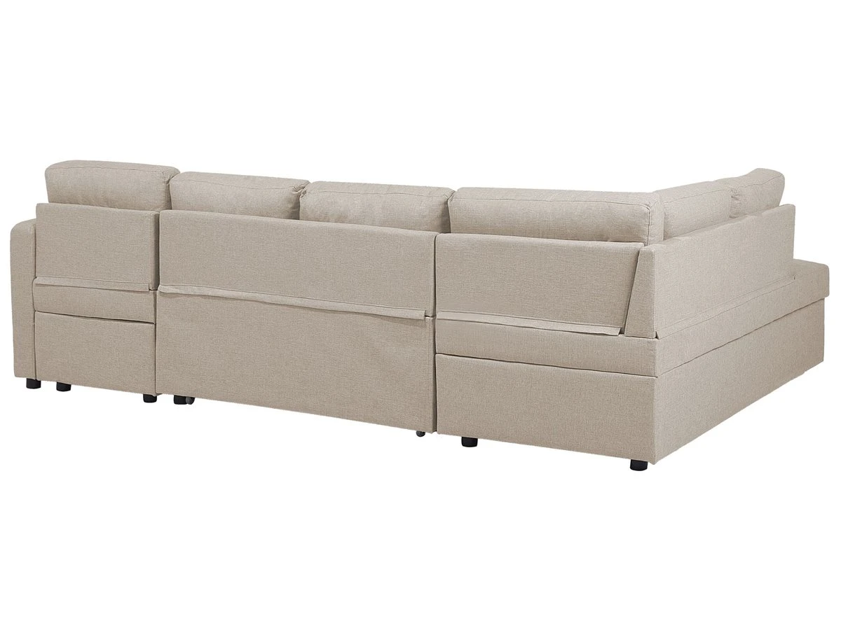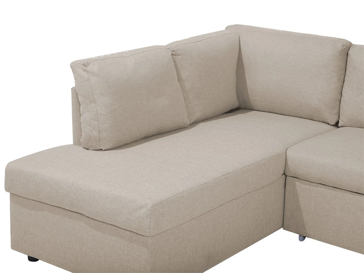Elegante y cómodo sofá esquinero . Añade a tu interior este sofá en forma de U acogedor y versátil. Está fabricado a partir de poliéster de alta calidad. Los 2 sofás en los laterales incluyen un espacio de almacenaje para guardar las sábanas y los edredones. El componente central es fácilmente convertible en cama. Las patas de metal incluyen protectores que evitan dañar el piso. Detalles: Tipo de Producto: Sofá en U Estilo: Moderno Color: Beige Tipo de material: Tejido Material principal: Poliéster Material adicional: Material sintético Material del relleno: Espuma Composición del Material: 100% Poliéster Forma: Forma de U Estilo del apoyabrazo: Estrecho Parte posterior tapizada: Sí Protectores para patas: Sí Piezas modulares: No Reclinable: No Fundas de cojín extraíble: Sí Construcción del asiento: Muelles ondulados Densidad de espuma del asiento: 45 kg/m3 Asientos para: 4 – 6 personas Función para dormir: Sí Mecanismo de abertura del sofa cama: Tracción Almacenamiento: No Dimensiones: Altura del apoyabrazos: 68 cm Profundidad: 185 cm Espesor del asiento: 17 cm Altura del asiento: 51 cm Ancho: 285 cm Altura: 90 cm Superficie del asiento: 52/114×263 cm Superficie para dormir: 133×263 cm Peso: 153 kg Capacidad de peso por persona: 150 kg La oferta incluye: 1 x Sofá Ventajas: Se convierte en cómoda cama, Diseño elegante, Alta calidad, No requiere mantenimiento regular, Completamente tapizado, Espacio de almacenamiento funcional Información de montaje: Requiere montaje parcial. 20-40 min. Consejos de mantenimiento: Poliéster: 1.Aspire con un accesorio adecuado 2.Limpiar con champú seco y una esponja húmeda o un limpiador suave. Madera de eucalipto: 1.Los muebles con acabado de aceite deben engrasarse una vez al año, 2.Seque inmediatamente después de limpiar. para evitar que se acumule agua en los muebles 3.Limpie con un limpiador y un paño suave en la dirección del grano.