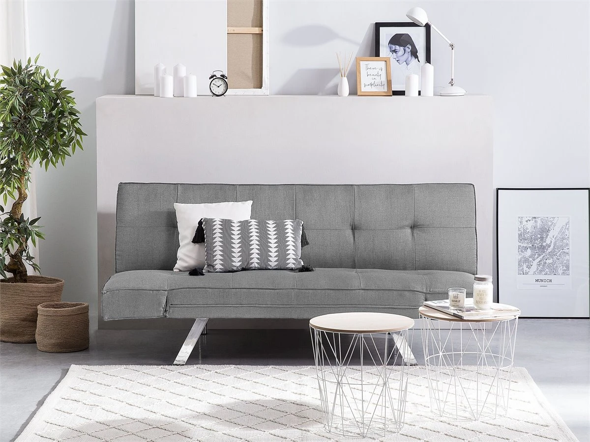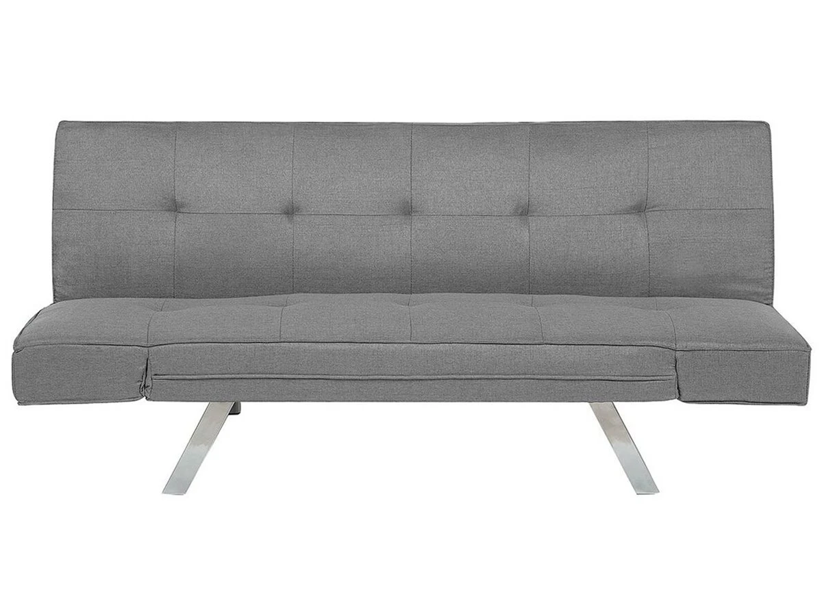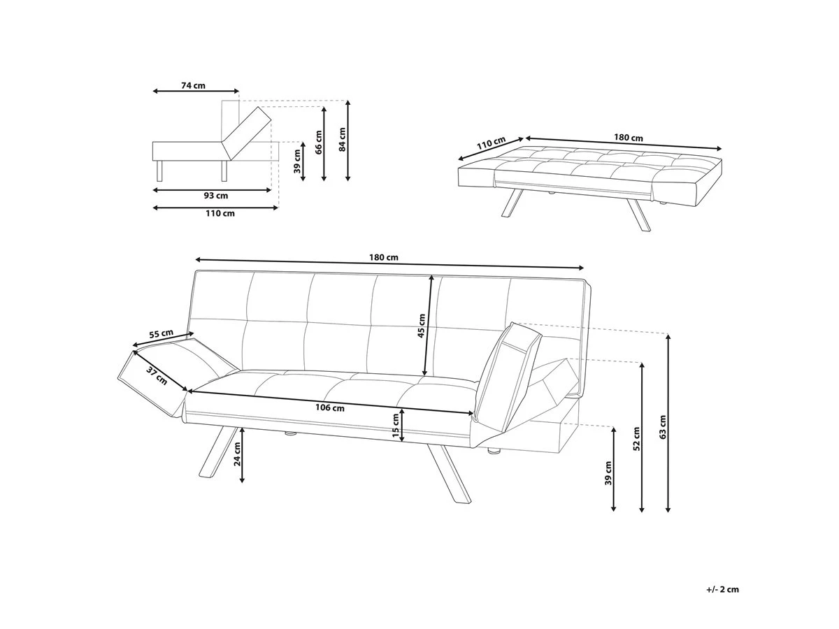 Cómodo sofá con función para dormir. Este sofá cama funcional combina bien con un interior moderno o minimalista. Está fabricado a partir de poliéster de primera calidad. Su diseño compacto es ideal para cualquier sala de estar de dimensiones reducidas. Las patas de metal aportan un toque retro al sofá. Fácilmente convertible en cama. Detalles: Tipo de Producto: Sofá de 3 plazas Estilo: Escandinavo Color: Gris Tonalidad: Gris claro Tipo de material: Tejido Material principal: Poliéster Material adicional: Metal Material del relleno: Espuma Composición del Material: 100% Poliéster Estilo del apoyabrazo: Ajustable Parte posterior tapizada: Sí Protectores para patas: No Reclinable: No Fundas de cojín extraíble: No Construcción del asiento: Muelles ondulados Densidad de espuma del asiento: 50 kg/m3 Asientos para: 3 personas Función para dormir: Sí Mecanismo de abertura del sofa cama: Mecanismo click-clack Almacenamiento: No Dimensiones: Altura del apoyabrazos: 63 cm Profundidad: 74 cm Espesor del asiento: 15 cm Altura del asiento: 39 cm Ancho: 180 cm Altura: 84 cm Superficie del asiento: 106×55 cm Superficie para dormir: 110×180 cm Peso: 38 kg Capacidad de peso por persona: 84 kg La oferta incluye: 1 x Sofá Ventajas: Se convierte en cómoda cama, Ancha superficie del asiento, Diseño atemporal, Brinda un toque acogedor a cualquier habitación, Acolchado de alta calidad, Mantenimiento sencillo, Apoyabrazos ajustables, Respaldo ajustable Información de montaje: Requiere montaje de las patas. 5-15 min. Información adicional: Los reposabrazos ajustables también se pueden usar como reposacabezas para dormir. No se recomienda utilizar el reposabrazos para sentarse. Consejos de mantenimiento: Poliéster: 1.Aspire con un accesorio adecuado 2.Limpiar con champú seco y una esponja húmeda o un limpiador suave. Metal: 1.Para evitar arañazos, no use limpiadores abrasivos 2.Limpie con un limpiador y un paño suave, seque después 3.Para elementos de cobre o cromados, use agente abrillantador.