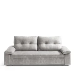 Sofa cama MIXX color vison . Estructura en madera maciza y tablero de partículas. Bastidor de madera y muelle de acero. Relleno de asientos goma de 28 kg. Relleno de respaldo con fibra hueca 100% . Patas PVC negras. Almohadas de respaldos y brazos desenfundables. Cama sistema fácil apertura de 190 x 110 cms.