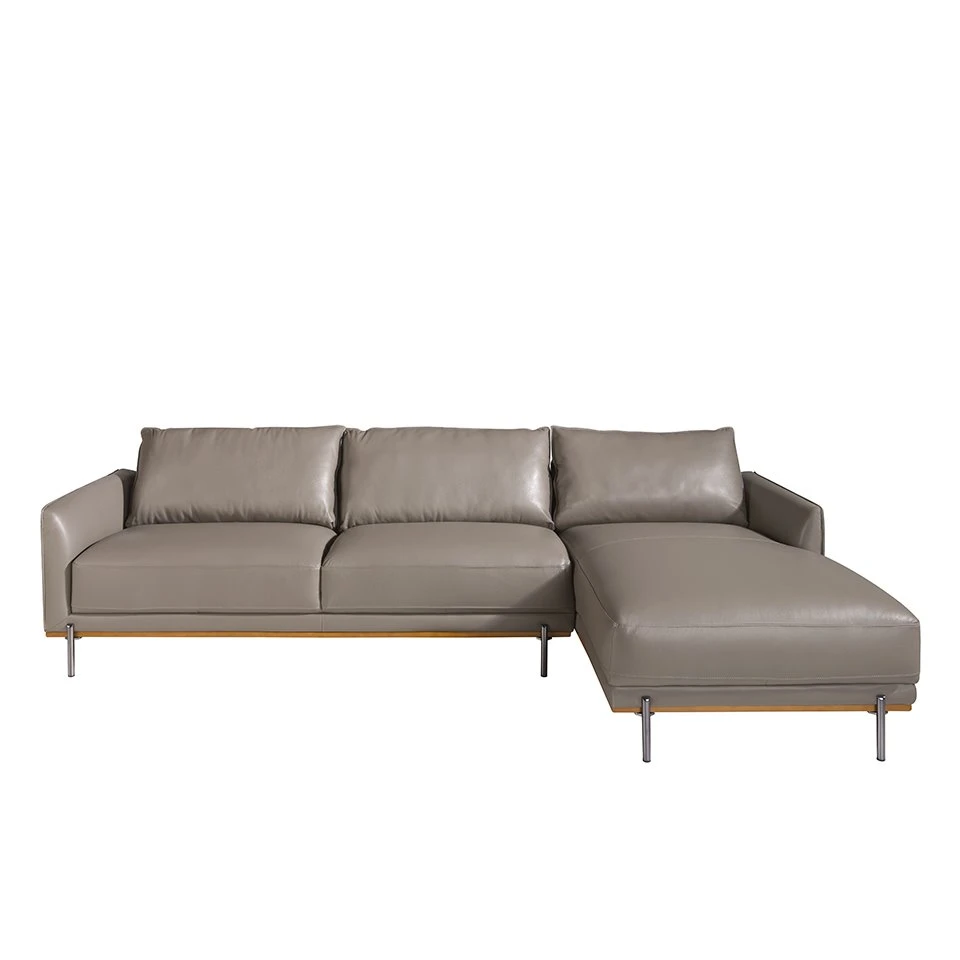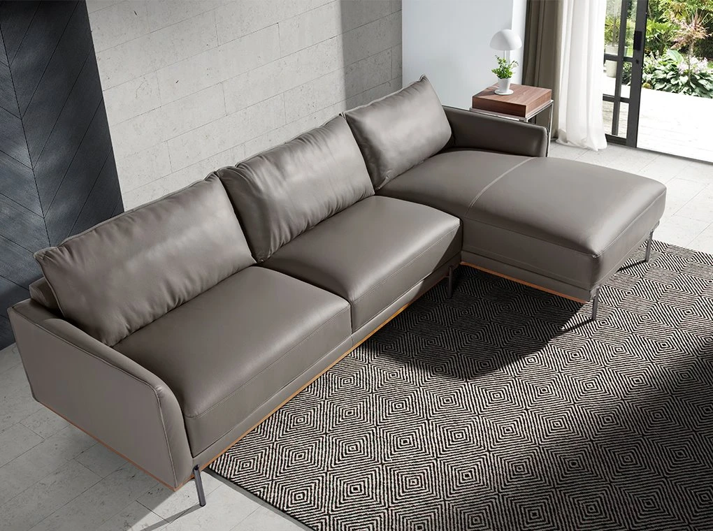 Sofá Chaiselongue (R en piel vacuno Gris Oscuro modelo 6154 Angel Cerdá S.L. Sofá chaise longue derecha de diseño moderno tapizado en piel de origen vacuno de 1,25mm de espesor color Gris Oscuro. Un sofá de estilo único y minimalista, con una robusta estructura interna de madera de pino natural y patas de acero inoxidable oscurecido que le otorga ese toque de tendencia y elegancia que busca para su salón. El elegante y discreto detalle de la base en madera de haya vaporizada, es lo que crea ese toque distintivo y especial que todos queremos en nuestro hogar. ESTILO: Este sofá chaise longue derecha tapizado en piel color gris Oscuro de la más alta calidad, aportará el toque original y elegante que busca para su hogar, fiel a las últimas tendencias en decoración. MULTIESTANCIA: Versátil y funcional, su elegante y sencillo diseño permite que encaje en cualquier tipo de salón, convirtiéndose en el gran protagonista de su salón. CALIDAD: Todos nuestros productos están fabricados con materiales de la más alta calidad, siendo garantía de mobiliario duradero y funcional. DECORACIÓN: Gracias a su diseño original con cojines en el respaldo independientes, extraíbles y desenfundables, conseguirá el toque diferente y sofisticado que busca para su sala de estar, a la vez que la mayor comodidad. DIMENSIONES Y CONFORT: El tamaño de sus asientos con relleno en espuma de 25 kg/m3 de densidad, y sus cojines desenfundables, le permitirá contar con el máximo confort en sus momentos de relax. CARACTERÍSTICAS: Un sofá chaise longue elegante que cuenta con la máxima capacidad de adaptación para sus momentos de relax. Disponible Chaise longue lado izquierdo.