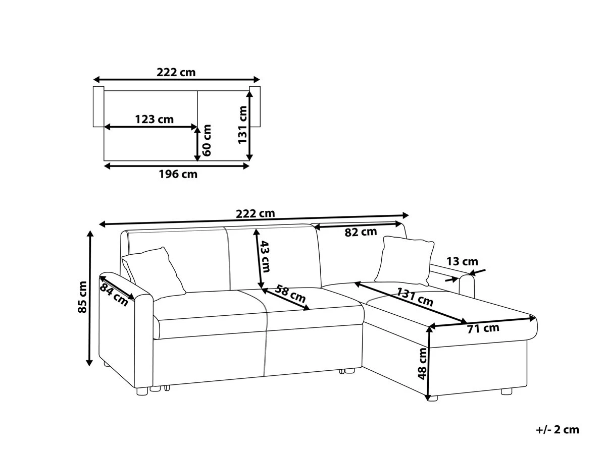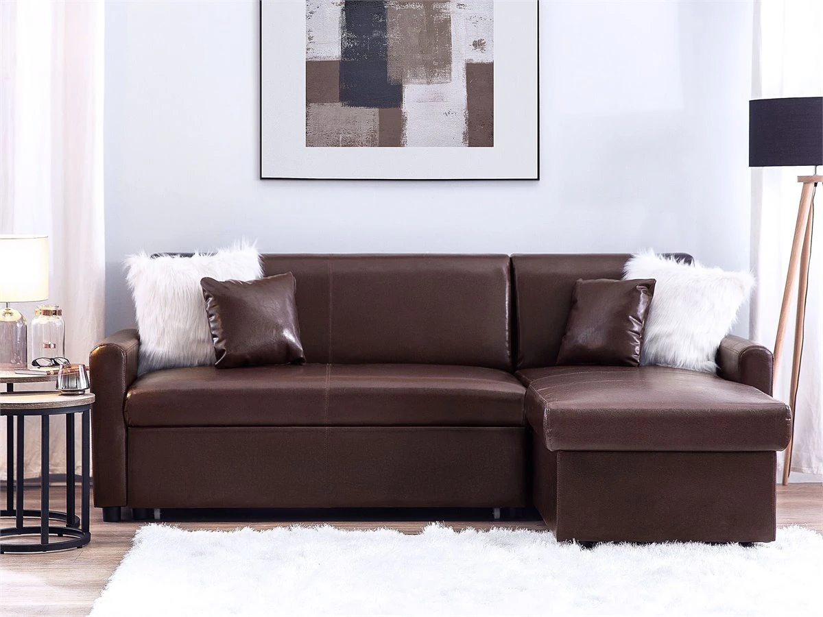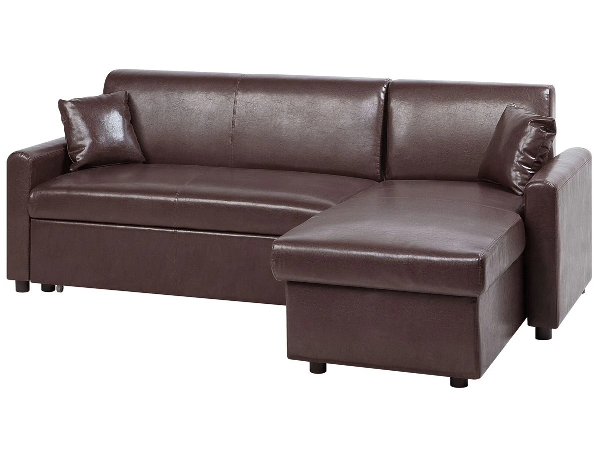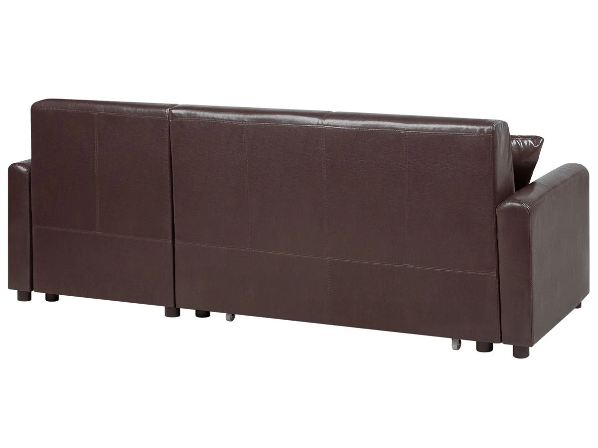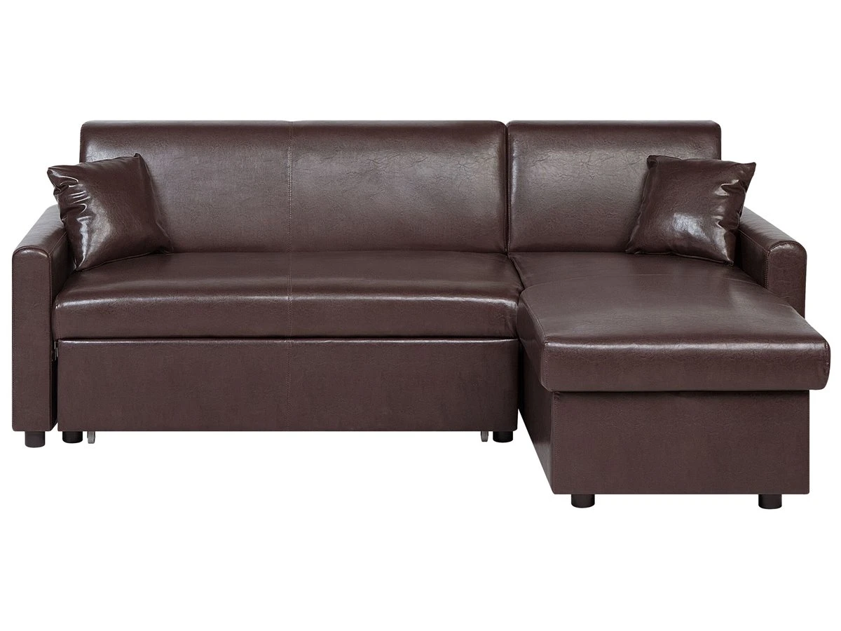 Sofá de esquina. Este sofá esquinero es ideal para cualquier sala de estar moderna o tradicional. Está fabricado a partir de poliéster de alta calidad. La estructura de madera de eucalipto aporta un toque clásico a la pieza. Las patas de plástico ofrecen estabilidad. Incluye un espacio de almacenaje para guardar las sábanas y los edredones. Fácilmente convertible en cama. Detalles: Tipo de Producto: Sofá cama Estilo: Moderno Color: Marrón Tonalidad: Marrón oscuro Tipo de material: Piel sintética Material principal: Poliéster Material adicional: Material sintético Material del relleno: Espuma Composición del Material: 100% Poliéster Estilo del apoyabrazo: Estrecho Parte posterior tapizada: Sí Protectores para patas: No Piezas modulares: No Orientación: Izquierda Reclinable: No Fundas de cojín extraíble: Sí Construcción del asiento: Muelles ondulados Densidad de espuma del asiento: 45 kg/m3 Asientos para: 3 personas Función para dormir: Sí Mecanismo de abertura del sofa cama: Tracción Almacenamiento: No Dimensiones: Altura del apoyabrazos: 55 cm Profundidad: 131 cm Altura del asiento: 48 cm Ancho: 222 cm Altura: 85 cm Superficie del asiento: 202×58 cm Superficie para dormir: 131×196 cm Peso: 92 kg Capacidad de peso por persona: 150 kg La oferta incluye: 1 x Sofá esquinero, 2 x Cojín Ventajas: Se convierte en cómoda cama, Diseño atemporal, Tapicería de piel sintética de alta calidad para un aspecto natural, Cojines extraíbles para un fácil mantenimiento, Espacio de almacenamiento funcional Información de montaje: Requiere montaje parcial. 45-60 min. Información adicional: A efectos de transporte, las patas están ocultas en un bolsillo en la parte inferior del asiento. Consejos de mantenimiento: Poliéster: 1.Aspire con un accesorio adecuado 2.Limpiar con champú seco y una esponja húmeda o un limpiador suave.