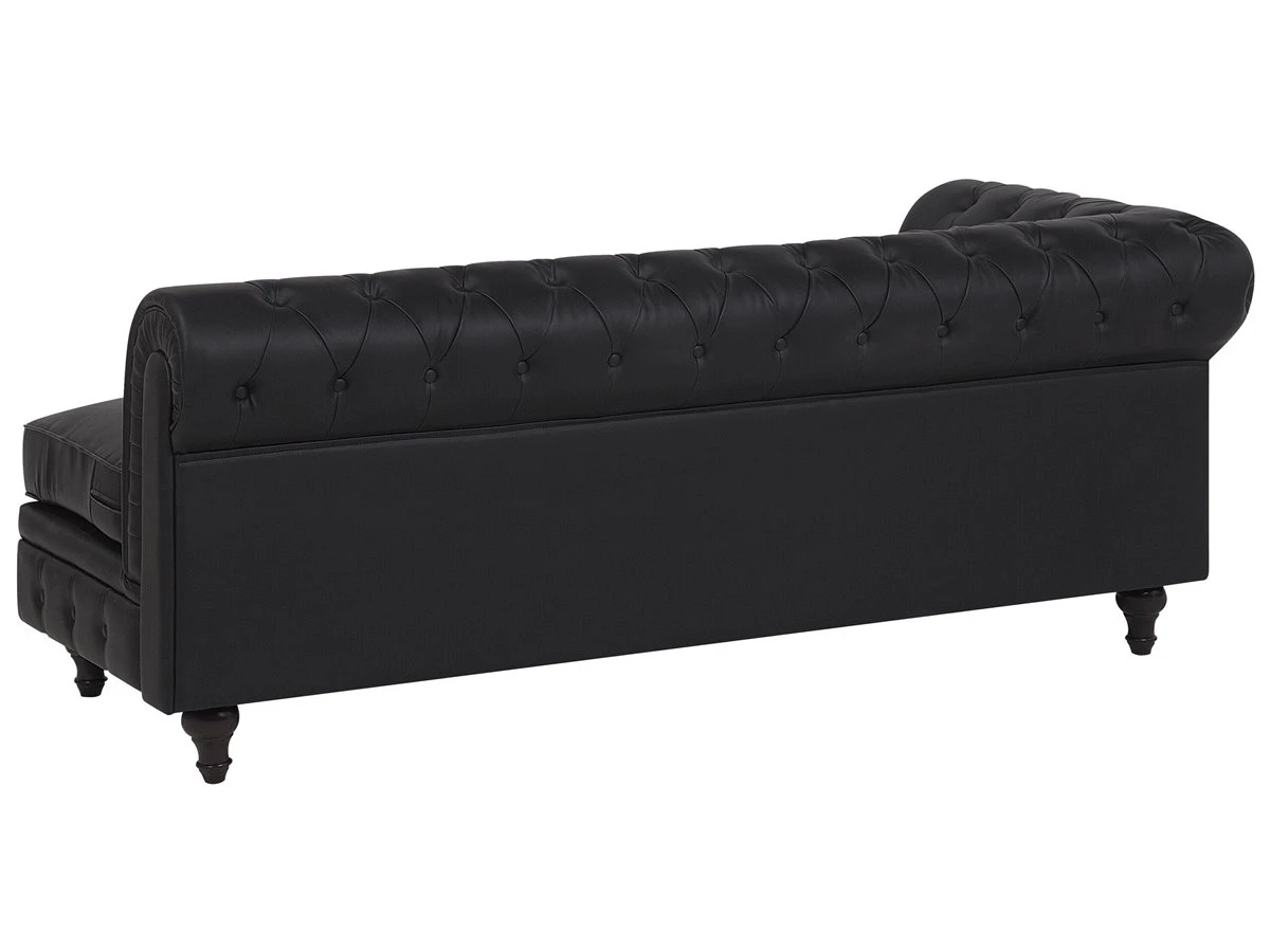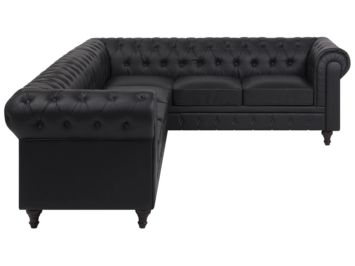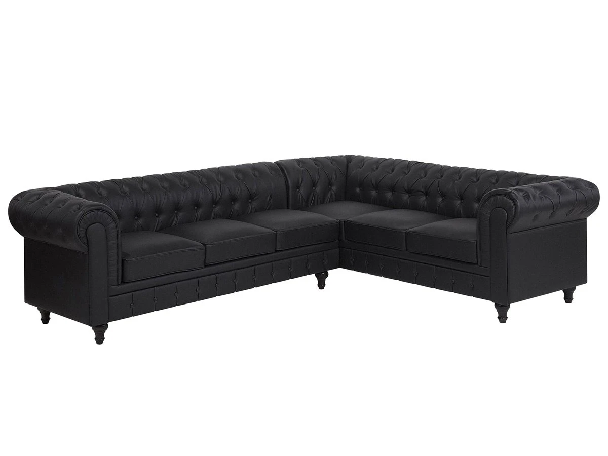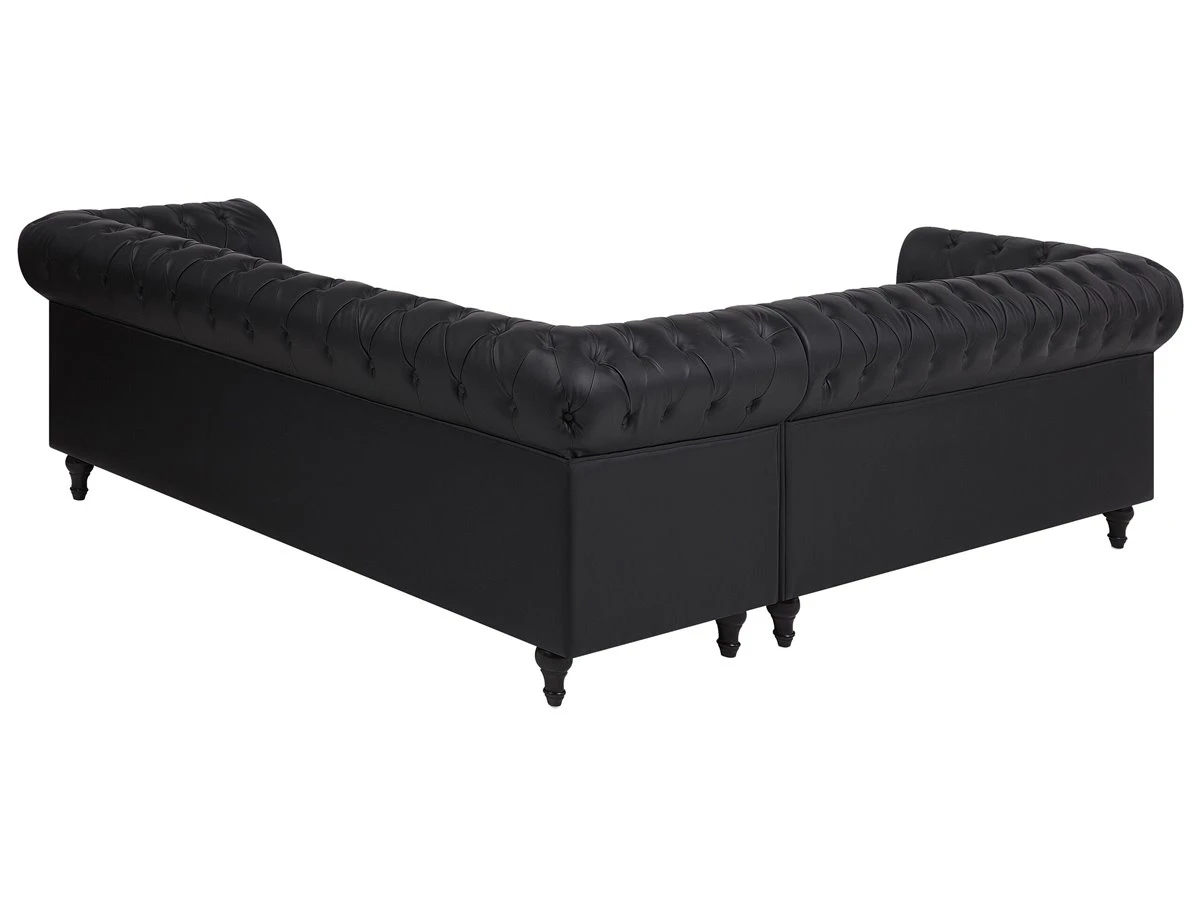 Elegante sofá esquinero en color negro. Este sofá esquinero de estilo Chesterfield se adapta a cualquier interior moderno o tradicional. El respaldo bajo y los cojines de asiento acolchados proporcionan la máxima comodidad. El asiento presenta un acolchado con botones. Sofá de diseño inglés de fácil mantenimiento que encaja bien con cualquier estilo de decoración. Detalles: Tipo de Producto: Sofá Chesterfield Estilo: Tradicional Color: Negro Tipo de material: Piel sintética Material principal: Piel sintética Material adicional: Madera de eucalipto Material del relleno: Espuma Composición del Material: 100% Piel ecológica Forma: Forma de L Estilo del apoyabrazo: Redondeado Apoyabrazo: Sí Parte posterior tapizada: Sí Orientación: Izquierda Diseño: Sólido Construcción del asiento: Muelles ondulados Densidad de espuma del asiento: 28 kg/m3 Asientos para: 4 – 6 personas Dimensiones: Altura del apoyabrazos: 77 cm Profundidad: 85 cm Espesor del asiento: 12 cm Altura del asiento: 45 cm Ancho: 280 cm Altura: 77 cm Superficie del asiento: 228×55 cm Peso: 91 kg Capacidad de peso por persona: 150 kg La oferta incluye: 1 x Sofá esquinero Ventajas: Ancha superficie del asiento, Cómodos apoyabrazos, El grueso acolchado del asiento brinda comodidad, Aspecto elegante estilo Chesterfield, Construcción muy estable, Fundas extraíbles, Completamente tapizado, Patas con tapas antideslizantes de seguridad Información de montaje: Requiere montaje de las patas. 5-15 min. Consejos de mantenimiento: Piel sintética: 1.Use solo limpiadores suaves y acondicionadores dedicados a la piel sintética, 2.Limpie con agua destilada y use limpiadores a base de jabón en las manchas difíciles 3.Aspire con un accesorio adecuado 4.Una vez a la semana, limpie con un paño húmedo y seque después. No engrasar Madera de eucalipto: 1.Limpie con un limpiador y un paño suave en la dirección del grano 2.Los muebles con acabado de aceite deben engrasarse una vez al año, 3.Seque inmediatamente después de limpiar. para evitar que se acumule agua en los muebles.