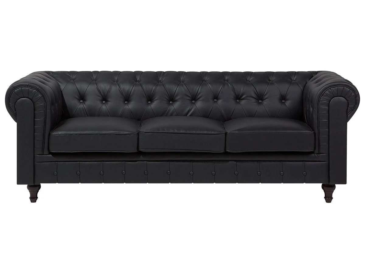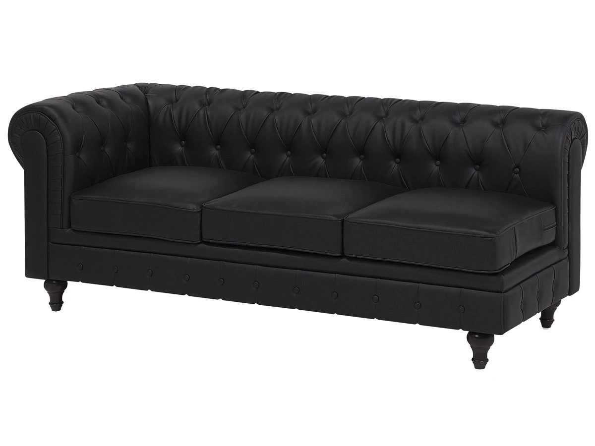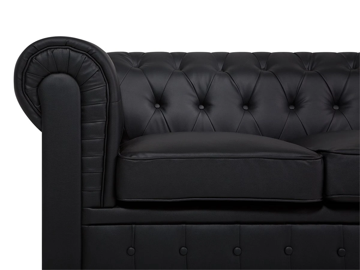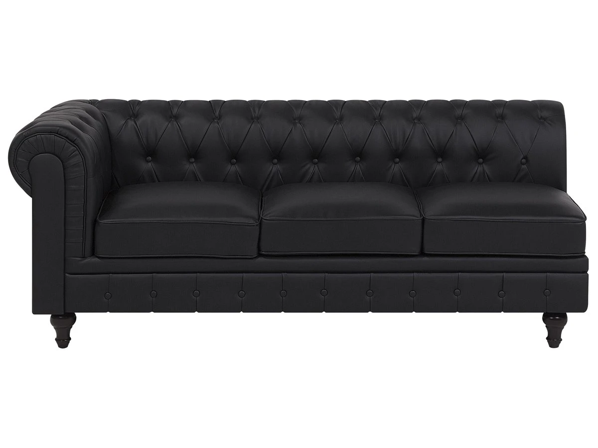 Elegante sofá esquinero en color negro. Este sofá esquinero de estilo Chesterfield se adapta a cualquier interior moderno o tradicional. El respaldo bajo y los cojines de asiento acolchados proporcionan la máxima comodidad. El asiento presenta un acolchado con botones. Sofá de diseño inglés de fácil mantenimiento que encaja bien con cualquier estilo de decoración. Detalles: Tipo de Producto: Sofá Chesterfield Estilo: Tradicional Color: Negro Tipo de material: Piel sintética Material principal: Piel sintética Material adicional: Madera de eucalipto Material del relleno: Espuma Composición del Material: 100% Piel ecológica Forma: Forma de L Estilo del apoyabrazo: Redondeado Apoyabrazo: Sí Parte posterior tapizada: Sí Orientación: Izquierda Diseño: Sólido Construcción del asiento: Muelles ondulados Densidad de espuma del asiento: 28 kg/m3 Asientos para: 4 – 6 personas Dimensiones: Altura del apoyabrazos: 77 cm Profundidad: 85 cm Espesor del asiento: 12 cm Altura del asiento: 45 cm Ancho: 280 cm Altura: 77 cm Superficie del asiento: 228×55 cm Peso: 91 kg Capacidad de peso por persona: 150 kg La oferta incluye: 1 x Sofá esquinero Ventajas: Ancha superficie del asiento, Cómodos apoyabrazos, El grueso acolchado del asiento brinda comodidad, Aspecto elegante estilo Chesterfield, Construcción muy estable, Fundas extraíbles, Completamente tapizado, Patas con tapas antideslizantes de seguridad Información de montaje: Requiere montaje de las patas. 5-15 min. Consejos de mantenimiento: Piel sintética: 1.Use solo limpiadores suaves y acondicionadores dedicados a la piel sintética, 2.Limpie con agua destilada y use limpiadores a base de jabón en las manchas difíciles 3.Aspire con un accesorio adecuado 4.Una vez a la semana, limpie con un paño húmedo y seque después. No engrasar Madera de eucalipto: 1.Limpie con un limpiador y un paño suave en la dirección del grano 2.Los muebles con acabado de aceite deben engrasarse una vez al año, 3.Seque inmediatamente después de limpiar. para evitar que se acumule agua en los muebles.