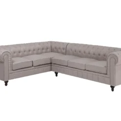 Elegante sofá esquinero estilo Chesterfield en color beige. Este sofá esquinero de estilo Chesterfield se adapta a cualquier interior moderno o tradicional. El respaldo bajo y los cojines de asiento acolchados proporcionan la máxima comodidad. El asiento presenta un acolchado con botones. Sofá de diseño inglés de fácil mantenimiento que encaja bien con cualquier estilo de decoración. Detalles: Tipo de Producto: Sofá Chesterfield Estilo: Tradicional Color: Beige Tipo de material: Tejido Material principal: Poliéster Material adicional: Madera de eucalipto Material del relleno: Espuma Composición del Material: 100% Poliéster Forma: Forma de L Estilo del apoyabrazo: Redondeado Apoyabrazo: Sí Parte posterior tapizada: Sí Orientación: Derecha Diseño: Sólido Construcción del asiento: Muelles ondulados Densidad de espuma del asiento: 28 kg/m3 Asientos para: 4 – 6 personas Dimensiones: Altura del apoyabrazos: 77 cm Profundidad: 85 cm Espesor del asiento: 12 cm Altura del asiento: 45 cm Ancho: 280 cm Altura: 77 cm Superficie del asiento: 228×55 cm Peso: 91 kg Capacidad de peso por persona: 150 kg La oferta incluye: 1 x Sofá esquinero Ventajas: Ancha superficie del asiento, Cómodos apoyabrazos, El grueso acolchado del asiento brinda comodidad, Aspecto elegante estilo Chesterfield, Construcción muy estable, Fundas extraíbles, Completamente tapizado, Patas con tapas antideslizantes de seguridad Información de montaje: Requiere montaje de las patas. 5-15 min. Consejos de mantenimiento: Poliéster: 1.Limpiar con champú seco y una esponja húmeda o un limpiador suave 2.Aspire con un accesorio adecuado. Madera de eucalipto: 1.Limpie con un limpiador y un paño suave en la dirección del grano 2.Los muebles con acabado de aceite deben engrasarse una vez al año, 3.Seque inmediatamente después de limpiar. para evitar que se acumule agua en los muebles.